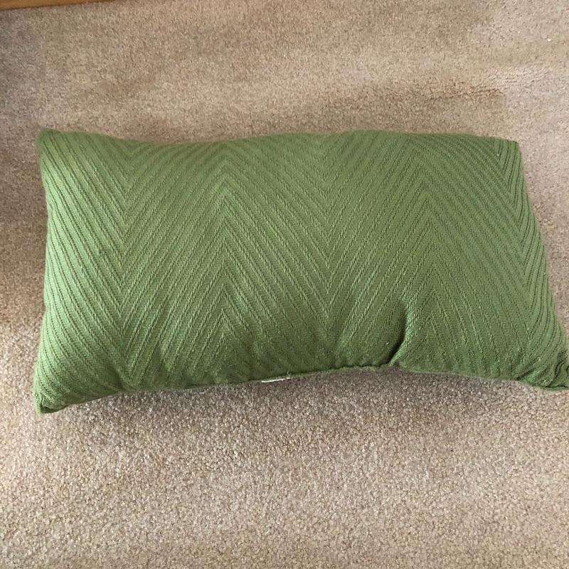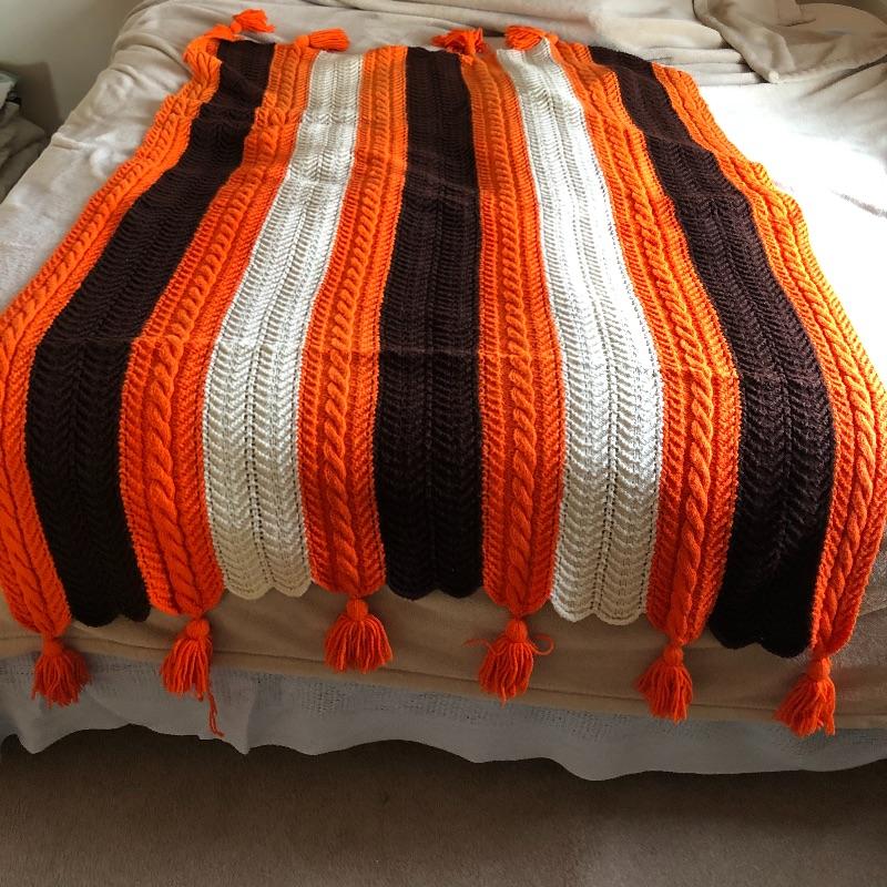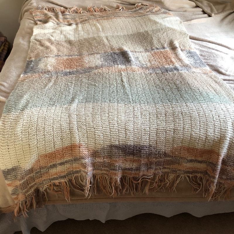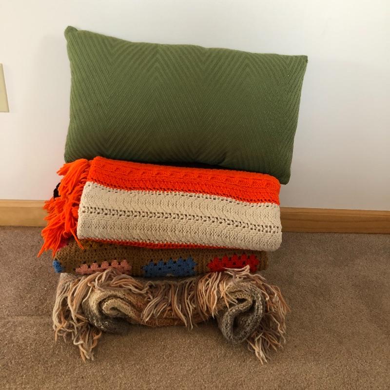 Keep warm this winter wit these three afghans and pillow. Largest throw measures 50” x 72”. Throws are shown on king bed that is not included but available in lot 86.
