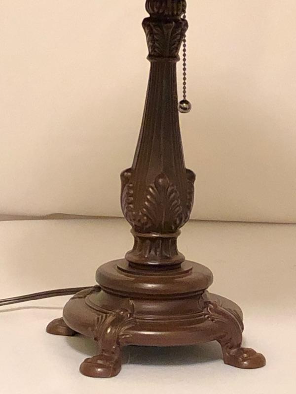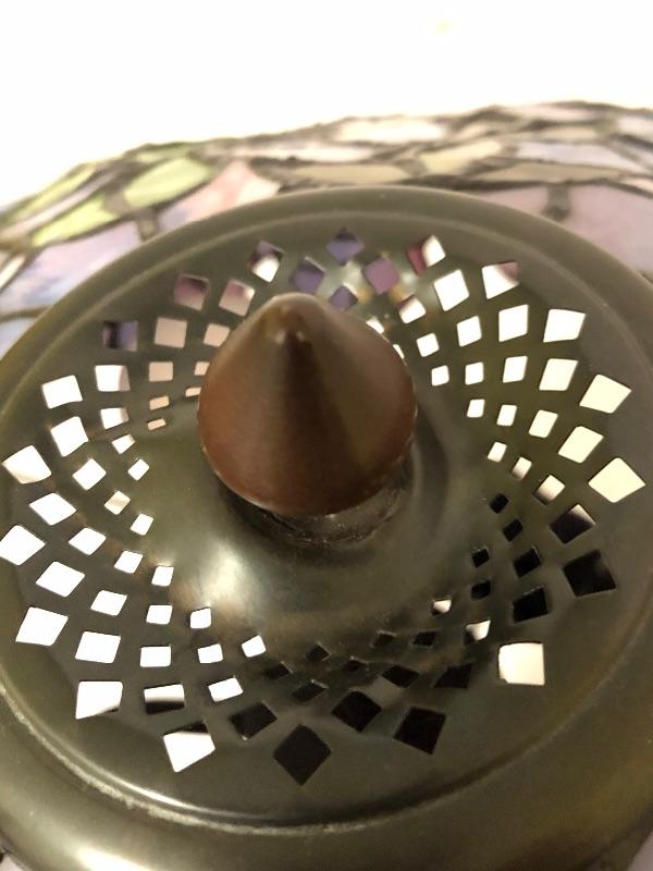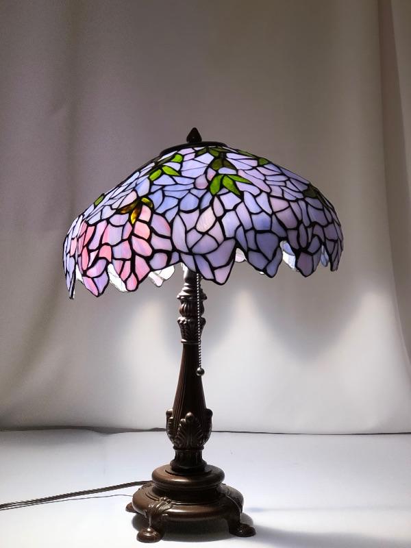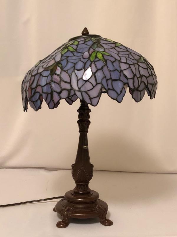 This lavender Tiffany style lamps a nice size for a side table and puts off a warm glow. The shade is damaged at the top and that is why the shade leans to one side see photos. Lamp light works on one side but other side did not light up with fresh bulb. All should be repairable.