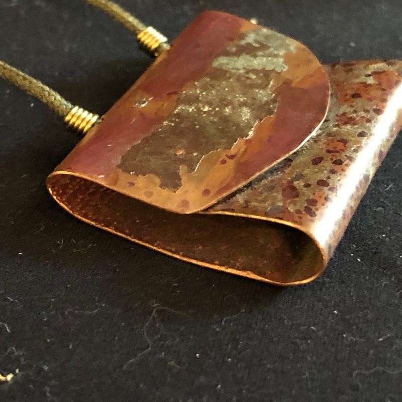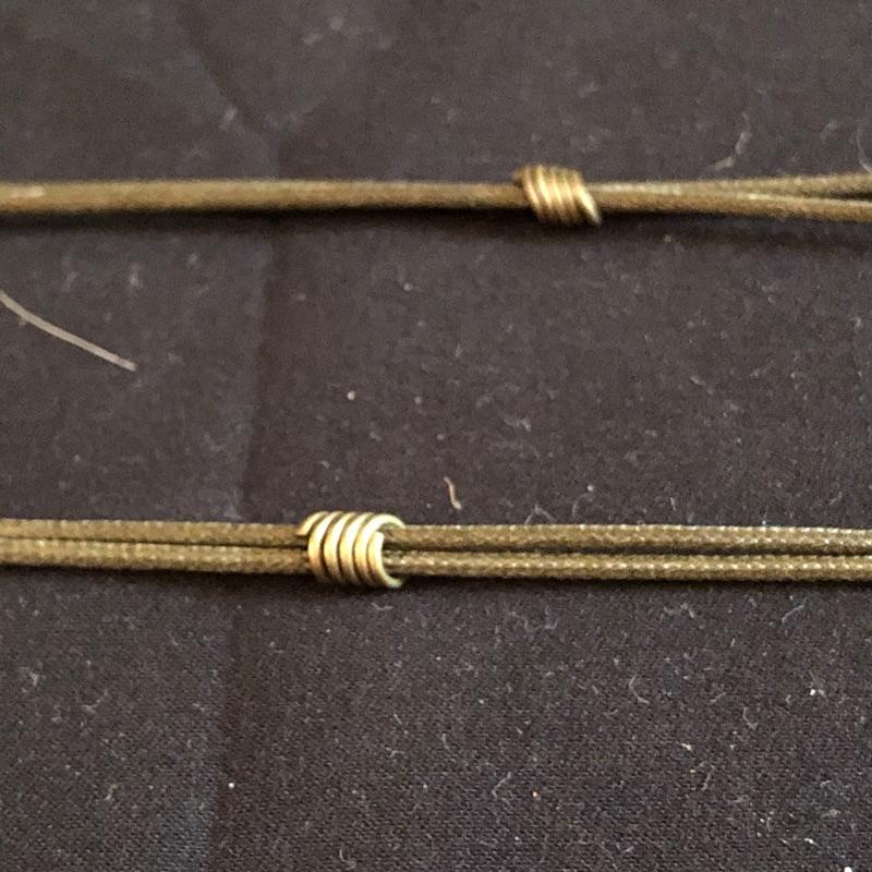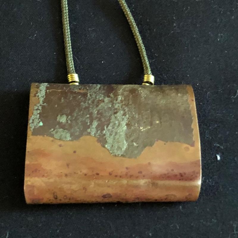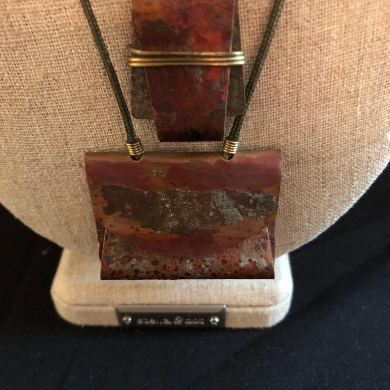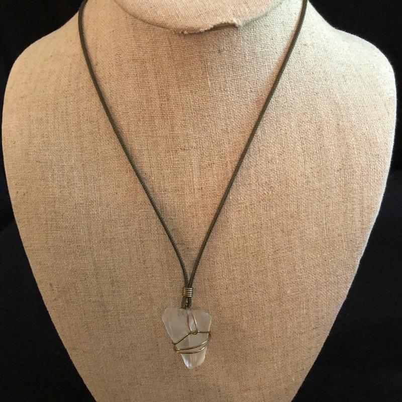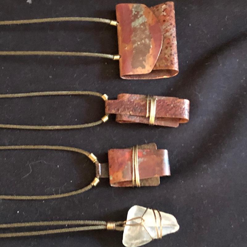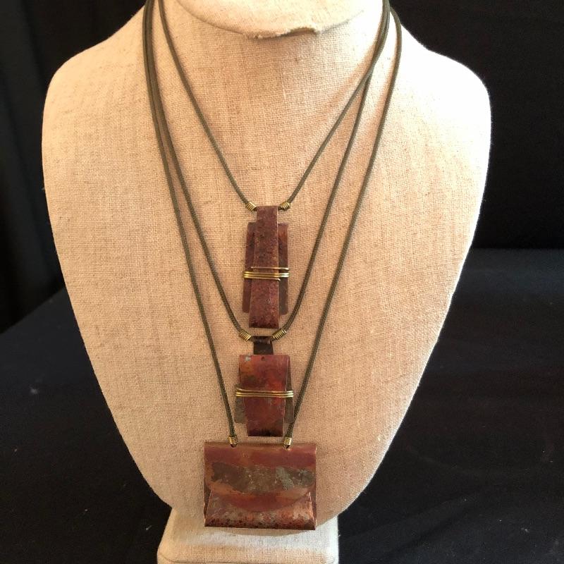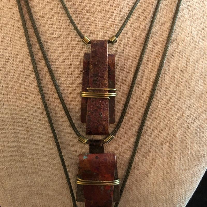 Aged copper and brass accents with corded chains make up this trio of trendy pieces. All the necklaces in this lot come on matching olive green corded chains with the simplest but most effective adjustable clasps, so wear them any length you want. The fourth necklace appears to be a raw crystal.