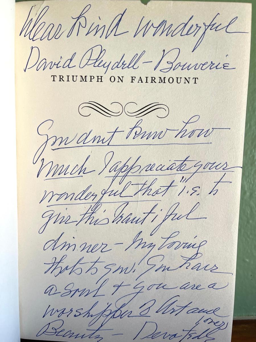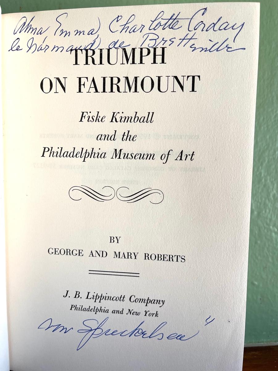 LOT 87 - Triumph on Fairmount - Fiske Kimball and the Philadelphia Museum of Art by George and Mary Roberts. . Alma Charlotte Corday Spreckels, known in San Francisco as Big Alma has written a personal Inscription to David. Alma was a well known socialite and philanthropist (wiki). This book was part of the David-Pleydell-Bouverie library at Bouverie Ranch in Glen Ellen. This item can be viewed at our Green + Cate Showroom in Sebastopol from July 15th - July 18th between the hours of 9am-5pm. For the benefit of the Bouverie Preserve of Audubon Canyon Ranch.