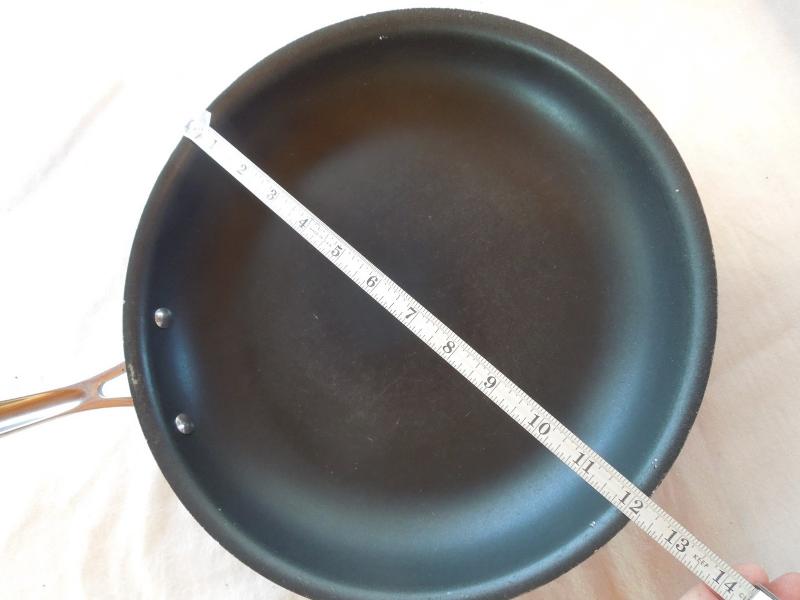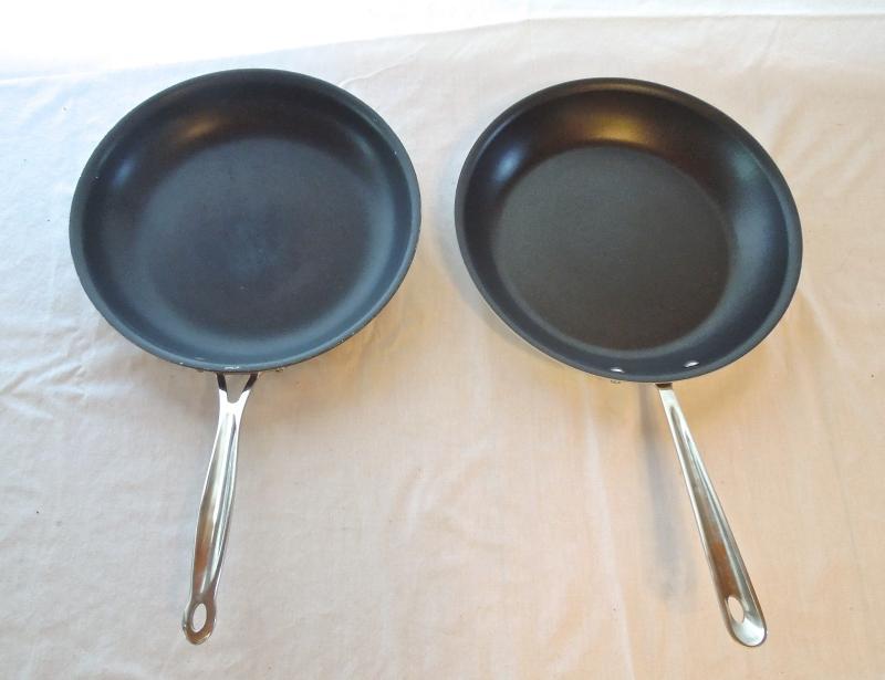 High quality long handled 12" diameter skillets. Cuisinart has some scrapping on edge.as pictured. Both are clean without burned on grease.