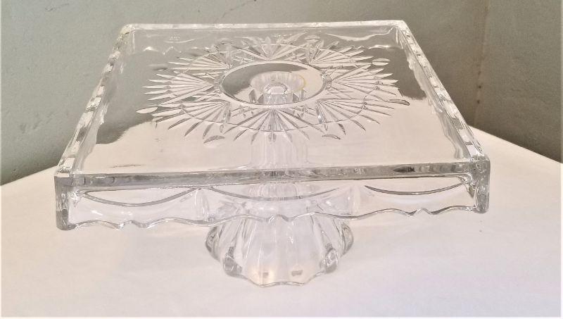 Very pretty square crystal cake plate on stand - good condition. 6" tall, 10" x 10".