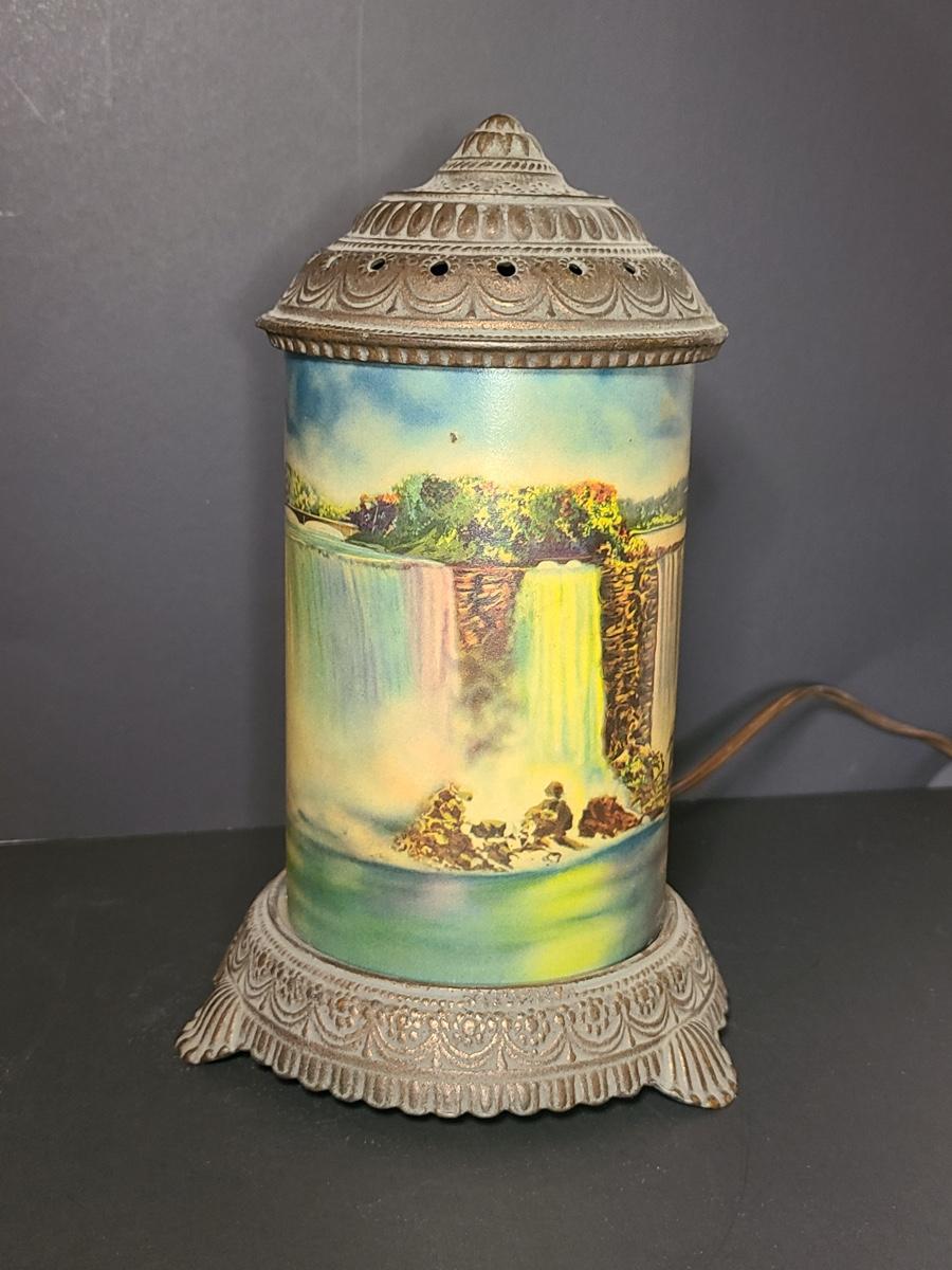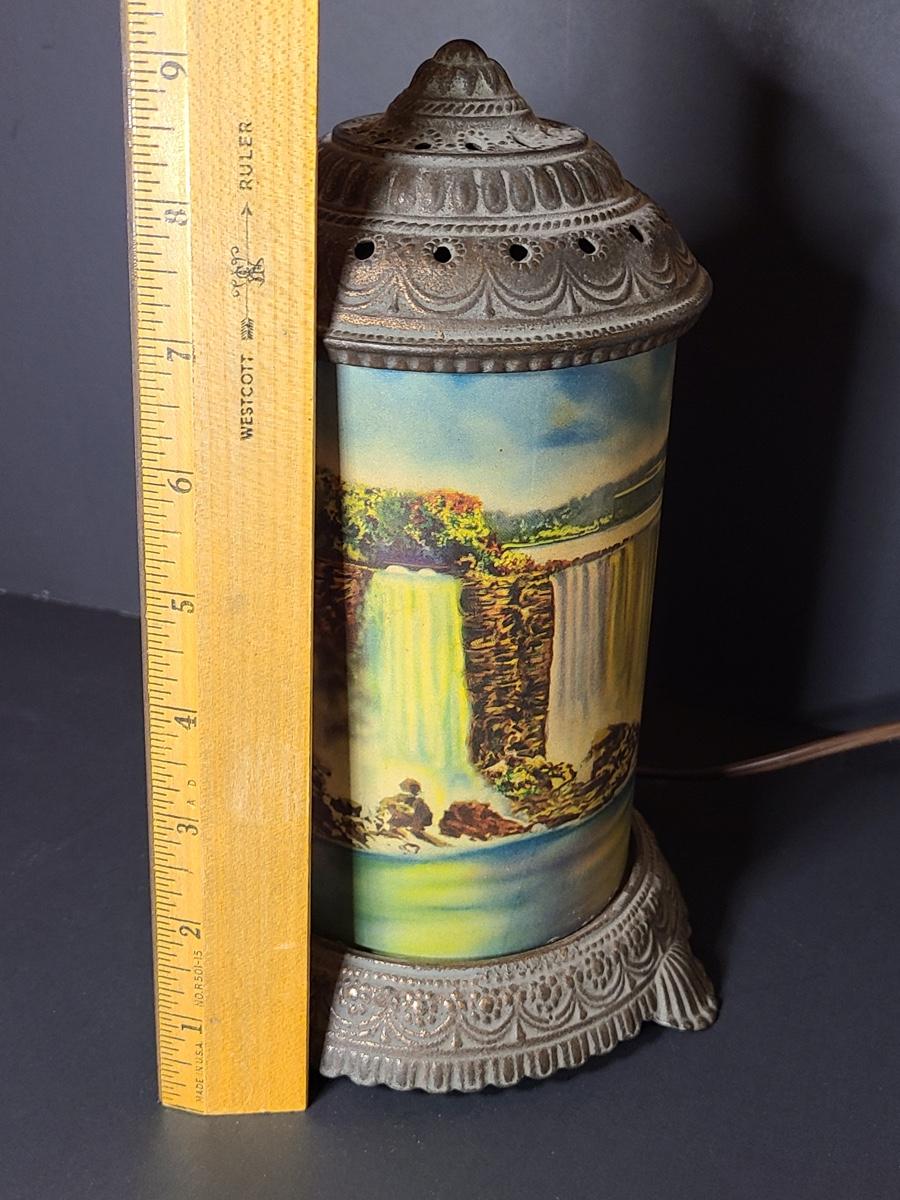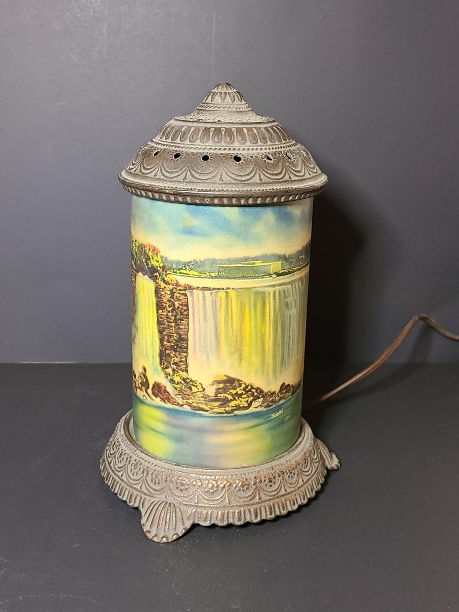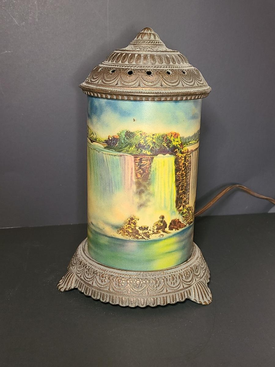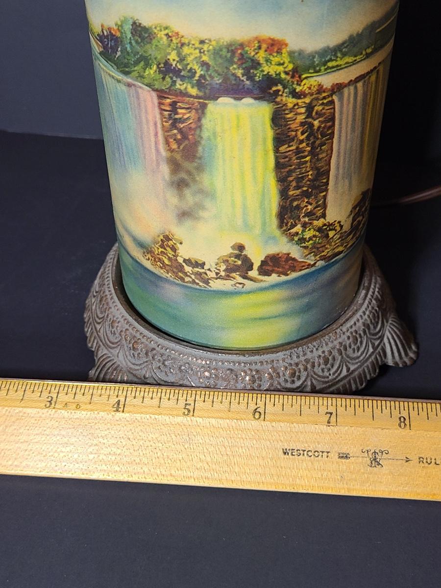 This gorgeous lamp, depicts Niagra Falls and when heats up, it is supposed to spin on the inside so the water is flowing. This does look to have all of the parts, but it was not spinning. When lit, this gives off a beautiful soft glow, and illuminates the falls. The top and the bottom are cast iron. Please see all pictures as they are the best representation of the items. The pictures show condition, measurements if taken, and what is included in the lot. Due to the large amount that we photograph and the time frame, we are not always able to take measurements. All items unless noted, are pre-owned and have been used. If you purchased furniture, you must bring help. We do not allow one person to carry large furniture out on their own. Bring help, tools and a truck for the safety of our client’s homes, and your personal safety. Company policy. Thank you.