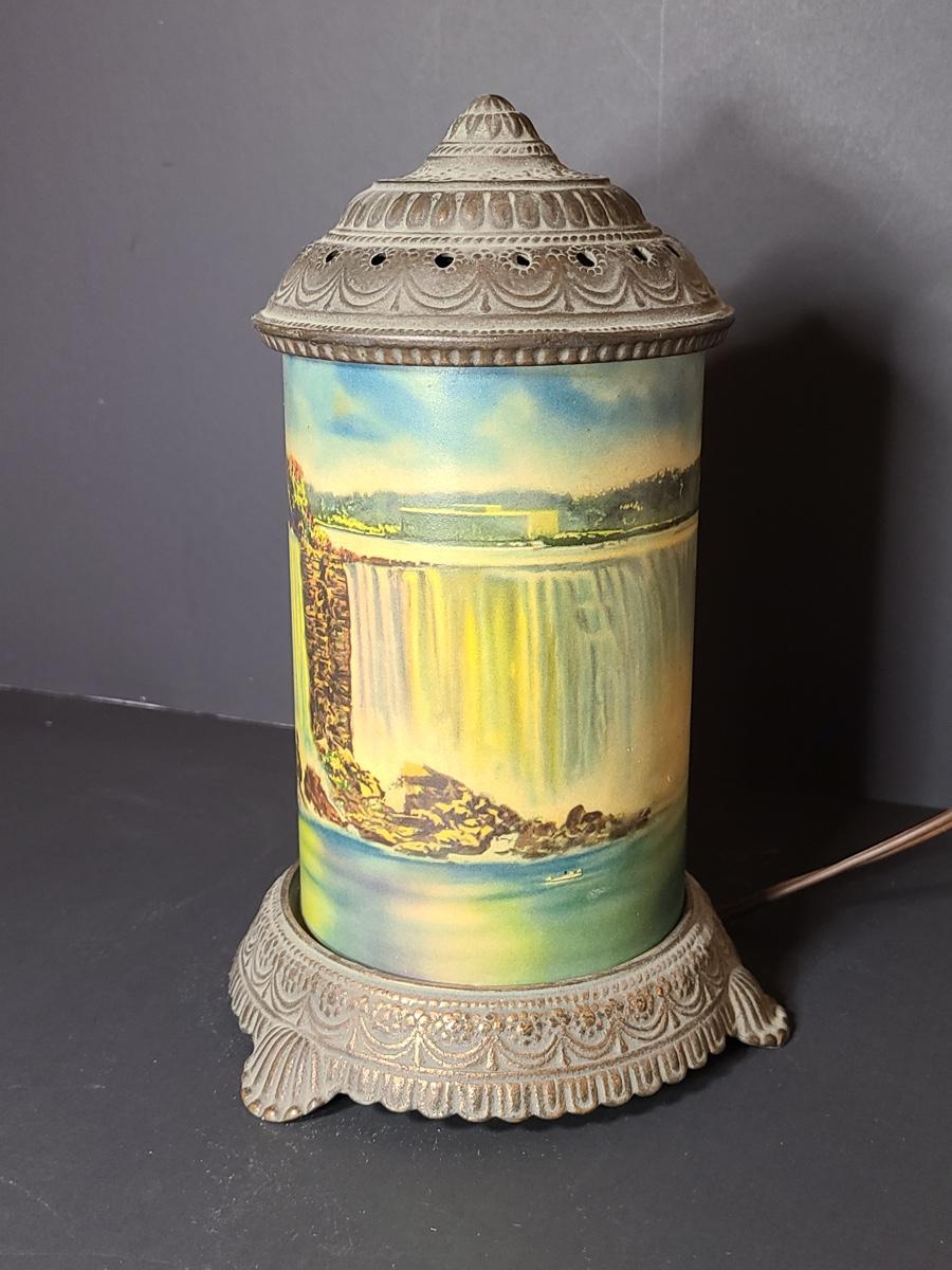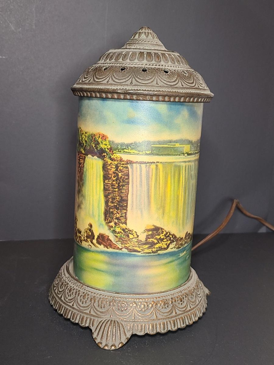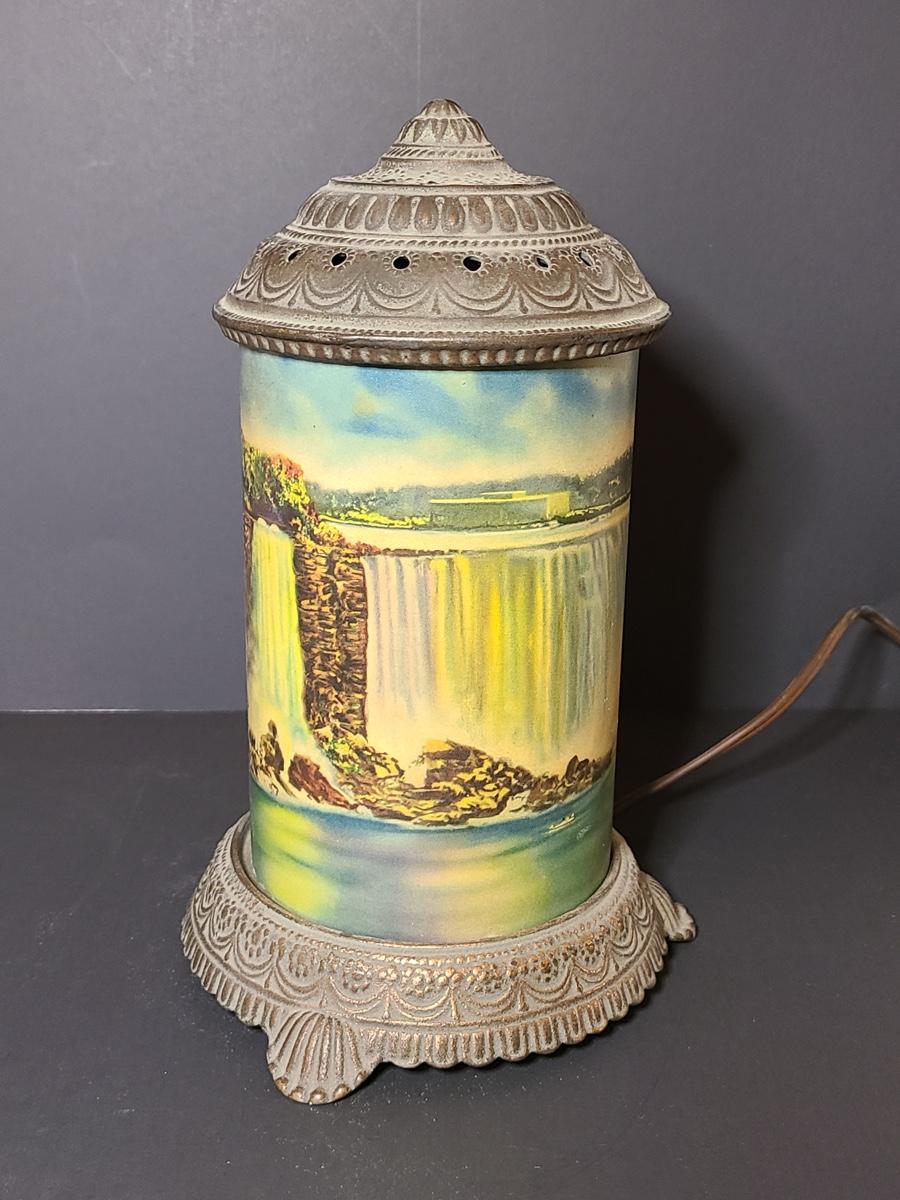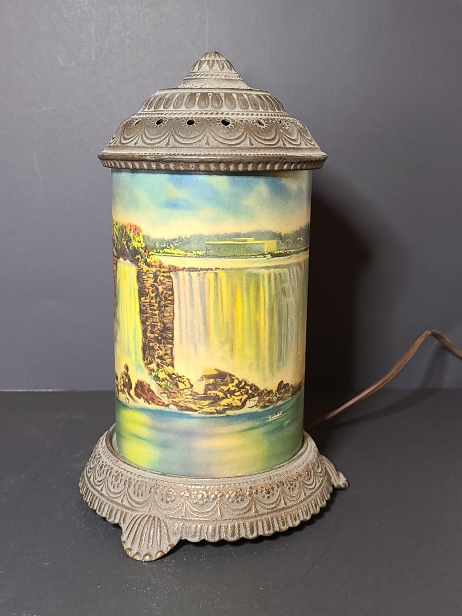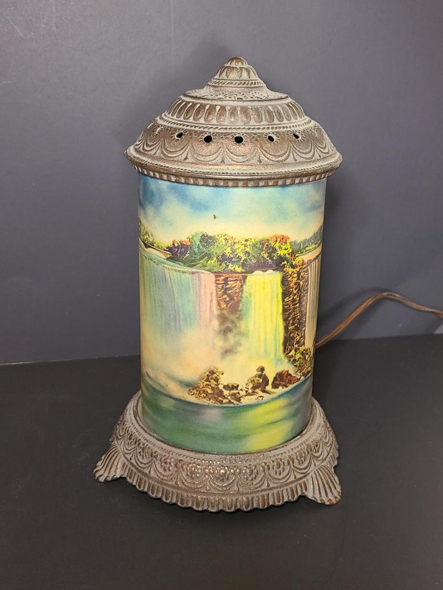 This gorgeous lamp, depicts Niagra Falls and when heats up, it is supposed to spin on the inside so the water is flowing. This does look to have all of the parts, but it was not spinning. When lit, this gives off a beautiful soft glow, and illuminates the falls. The top and the bottom are cast iron. Please see all pictures as they are the best representation of the items. The pictures show condition, measurements if taken, and what is included in the lot. Due to the large amount that we photograph and the time frame, we are not always able to take measurements. All items unless noted, are pre-owned and have been used. If you purchased furniture, you must bring help. We do not allow one person to carry large furniture out on their own. Bring help, tools and a truck for the safety of our client’s homes, and your personal safety. Company policy. Thank you.
