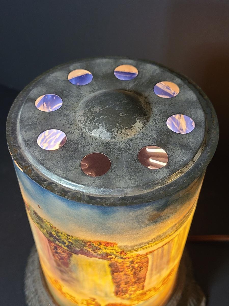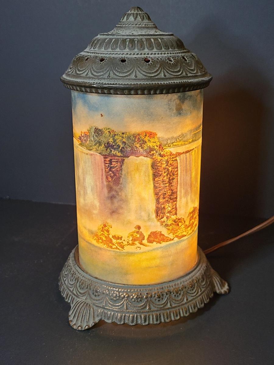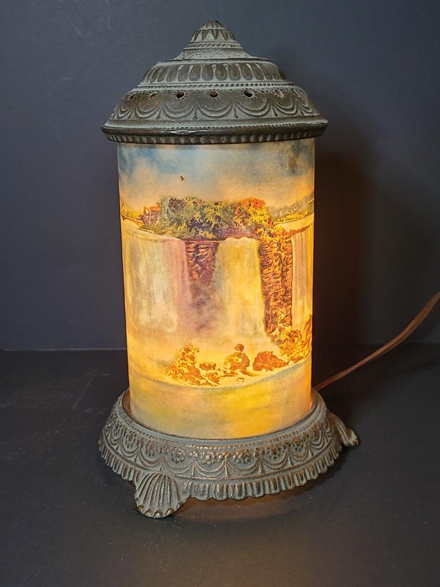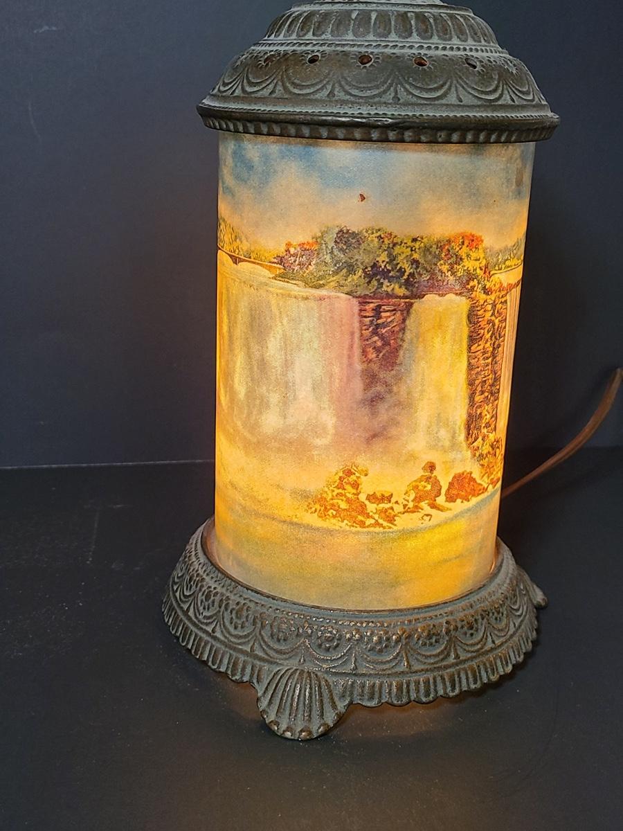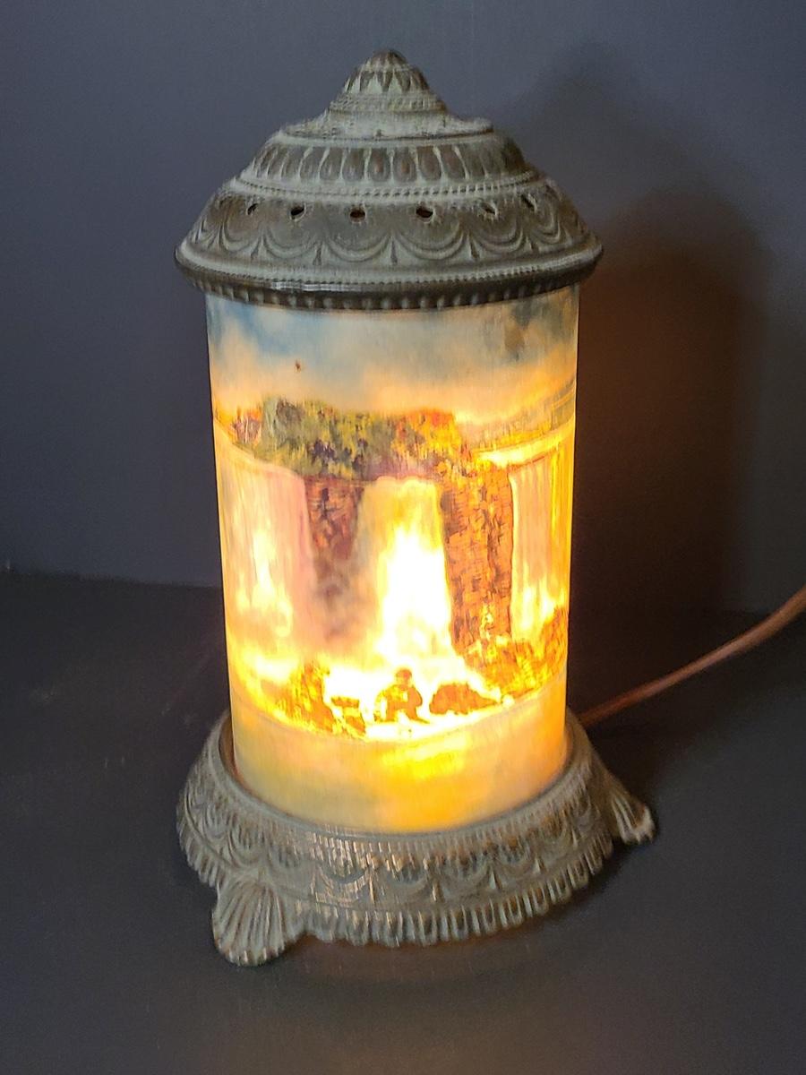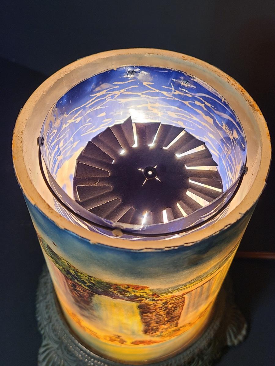 This gorgeous lamp, depicts Niagra Falls and when heats up, it is supposed to spin on the inside so the water is flowing. This does look to have all of the parts, but it was not spinning. When lit, this gives off a beautiful soft glow, and illuminates the falls. The top and the bottom are cast iron. Please see all pictures as they are the best representation of the items. The pictures show condition, measurements if taken, and what is included in the lot. Due to the large amount that we photograph and the time frame, we are not always able to take measurements. All items unless noted, are pre-owned and have been used. If you purchased furniture, you must bring help. We do not allow one person to carry large furniture out on their own. Bring help, tools and a truck for the safety of our client’s homes, and your personal safety. Company policy. Thank you.