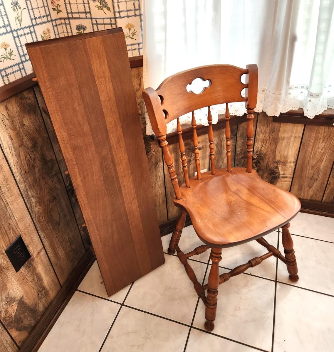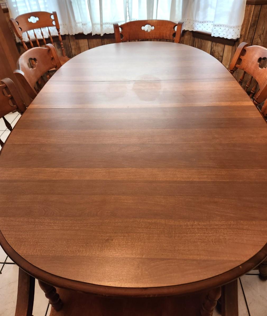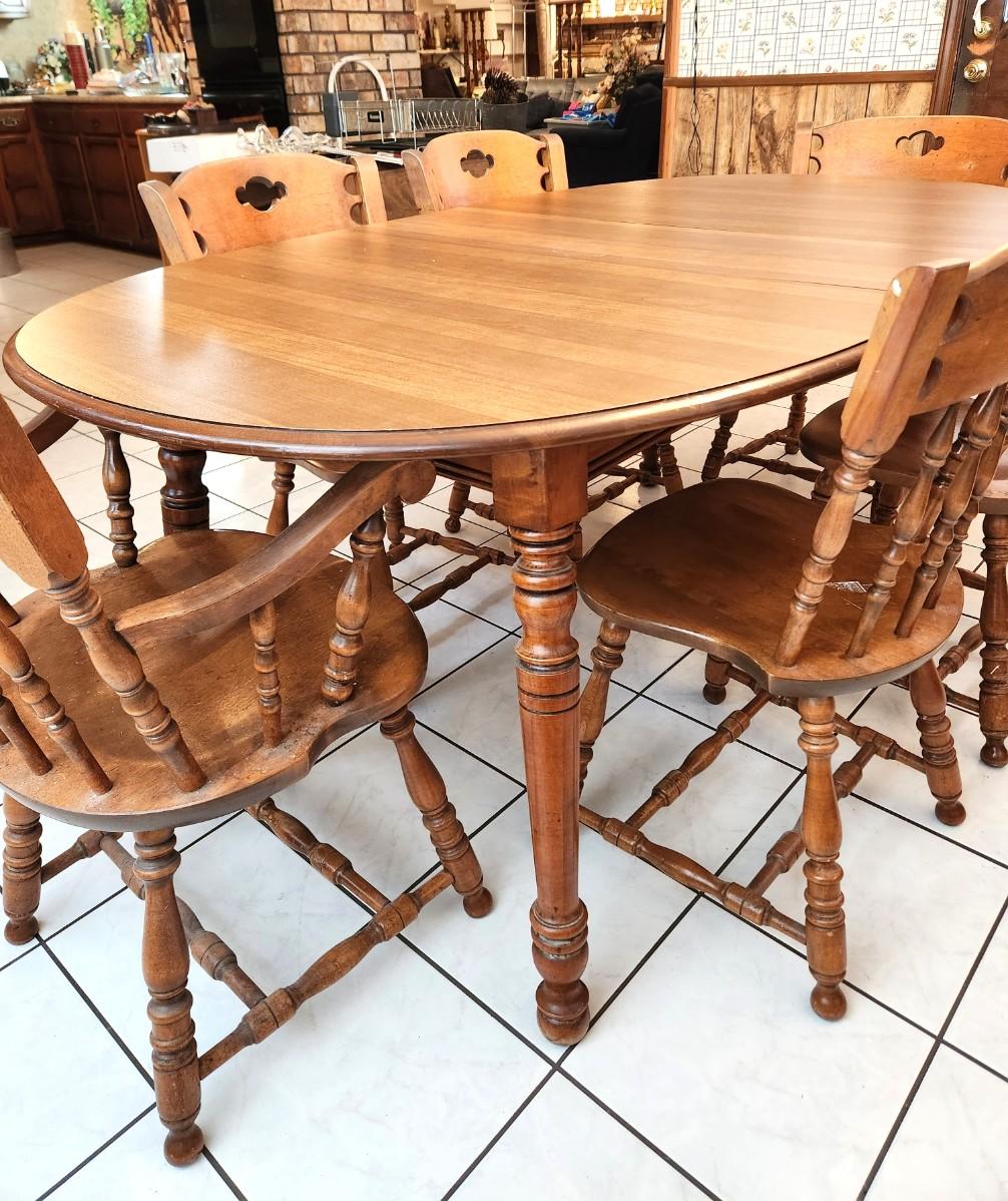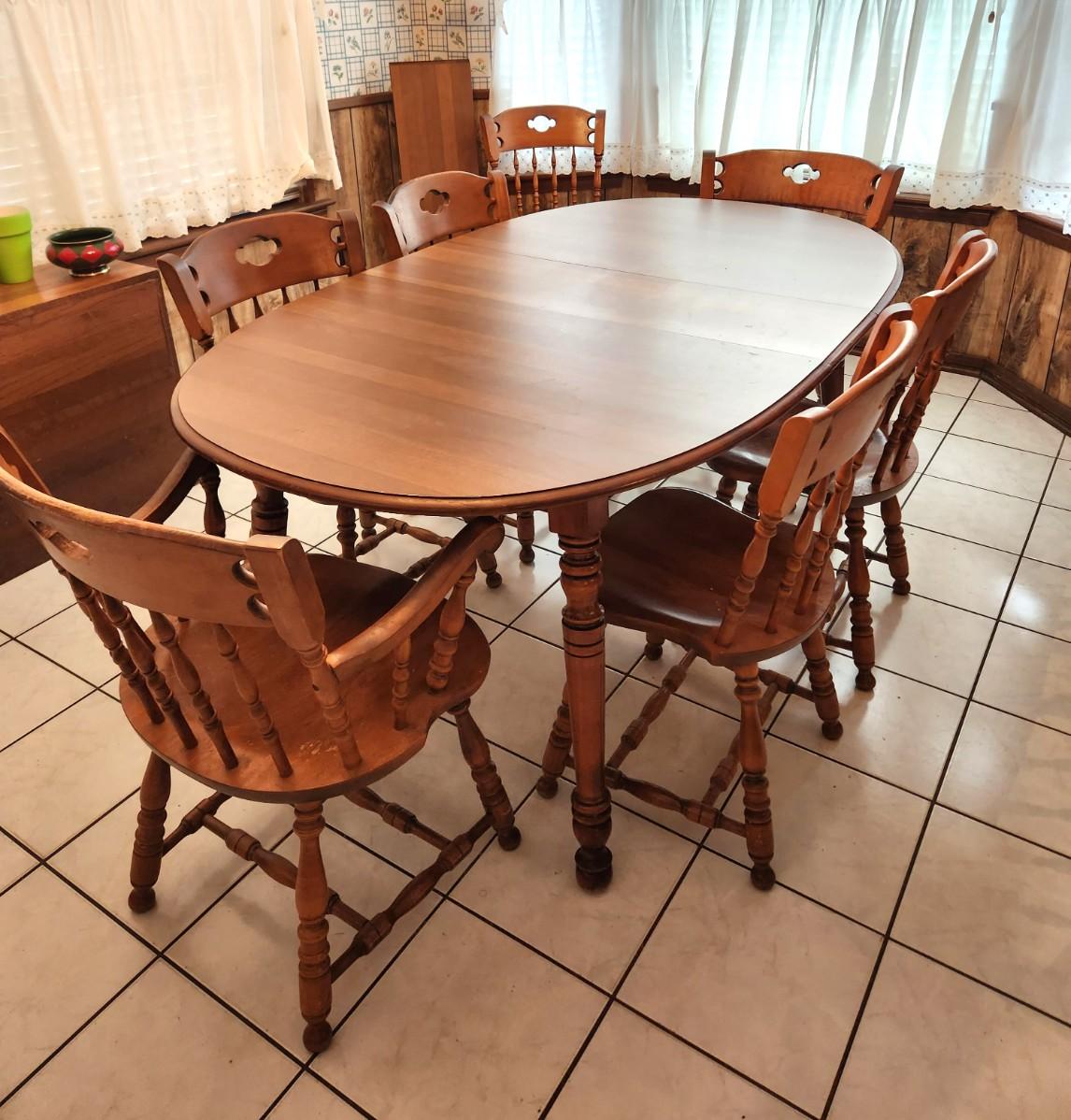 Good vintage colonial style (1970's) table and chairs - 7 chairs (inlcudes 2 armchairs). Chairs made by S. Bert & Bros or Gardner, MA - marked. 2 leaves to table. 30" tall, each leaf 11.5" wide - measures 70" long with one leaf installed. Good used condition.