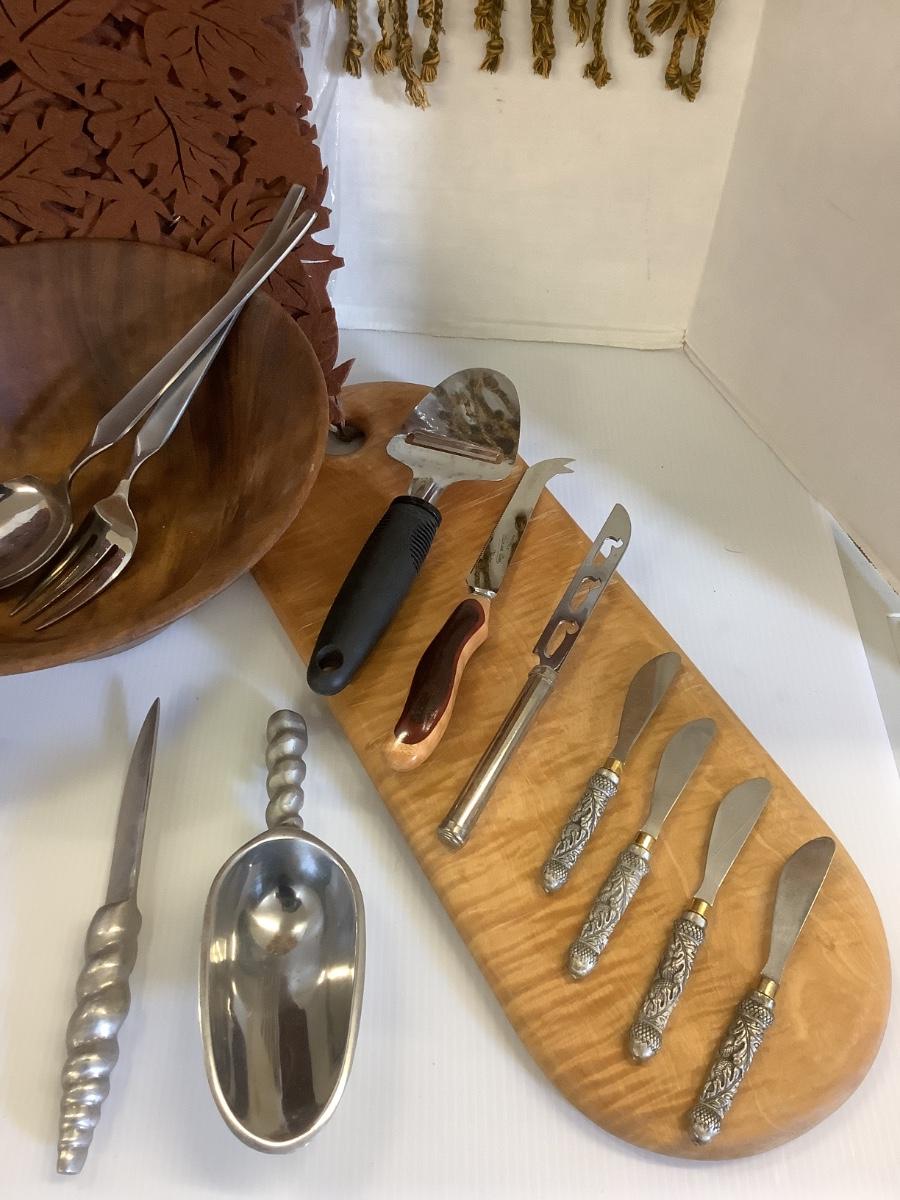 Large Wooden Cheese Board with multiple cheese knives/spreaders