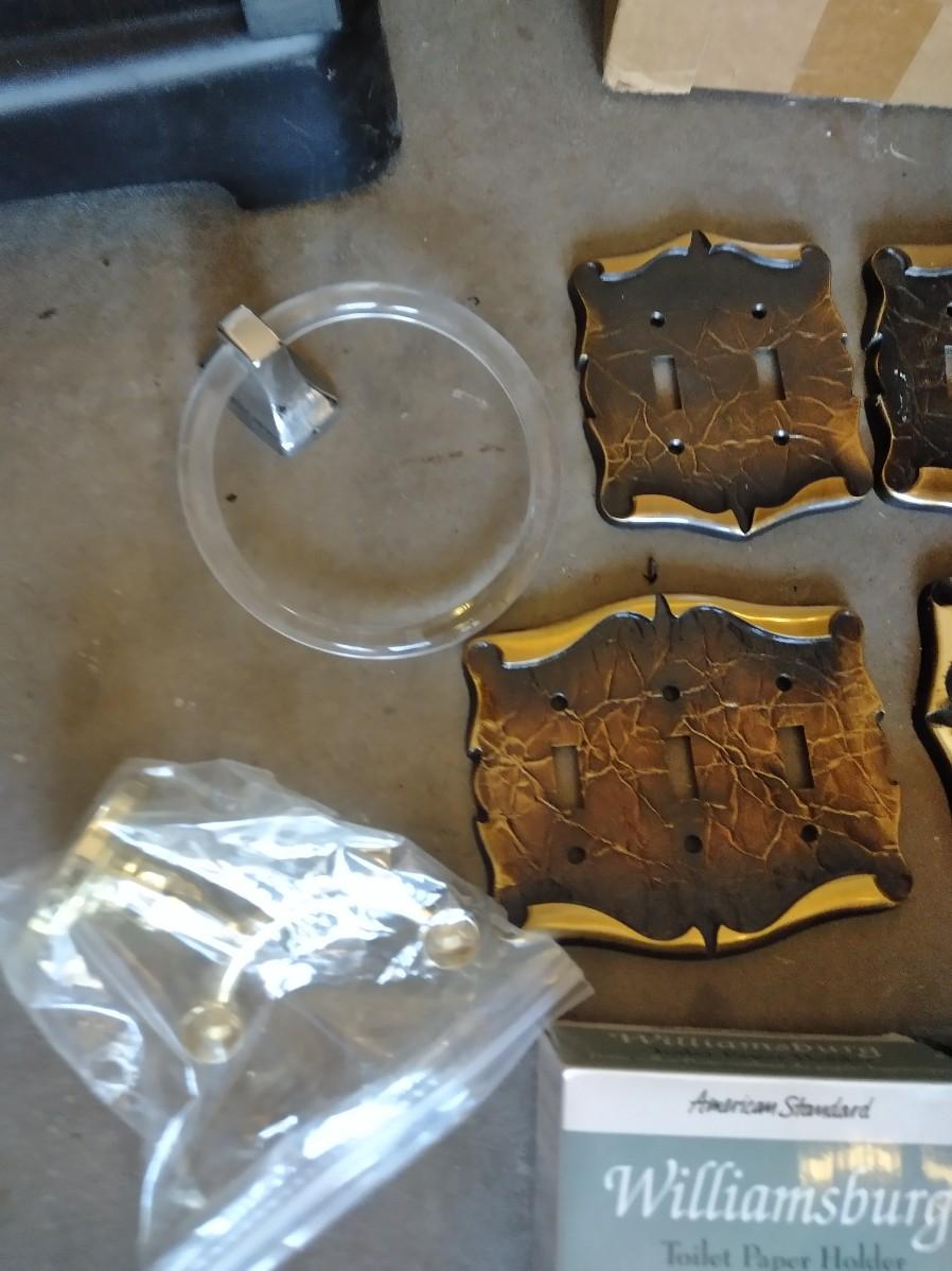 HOME REPAIR ITEMS, NEW ACCESSORIES FOR BATHROOM OR KITCHEN, METAL LIGHT PLATES, BRASS COLORED KNOBS AND HANGERS AND MORE