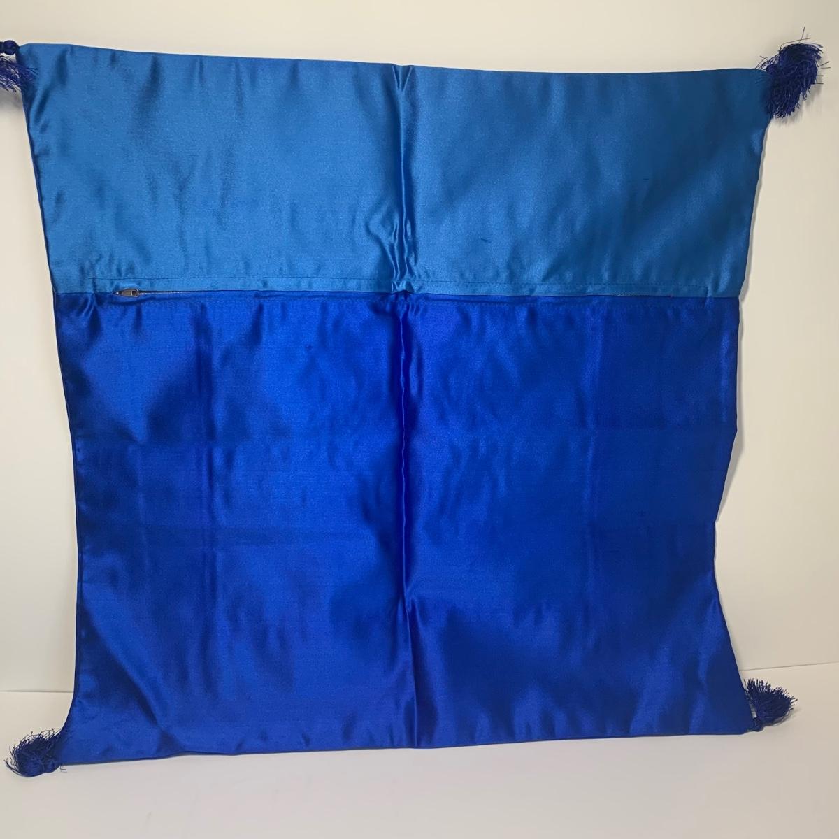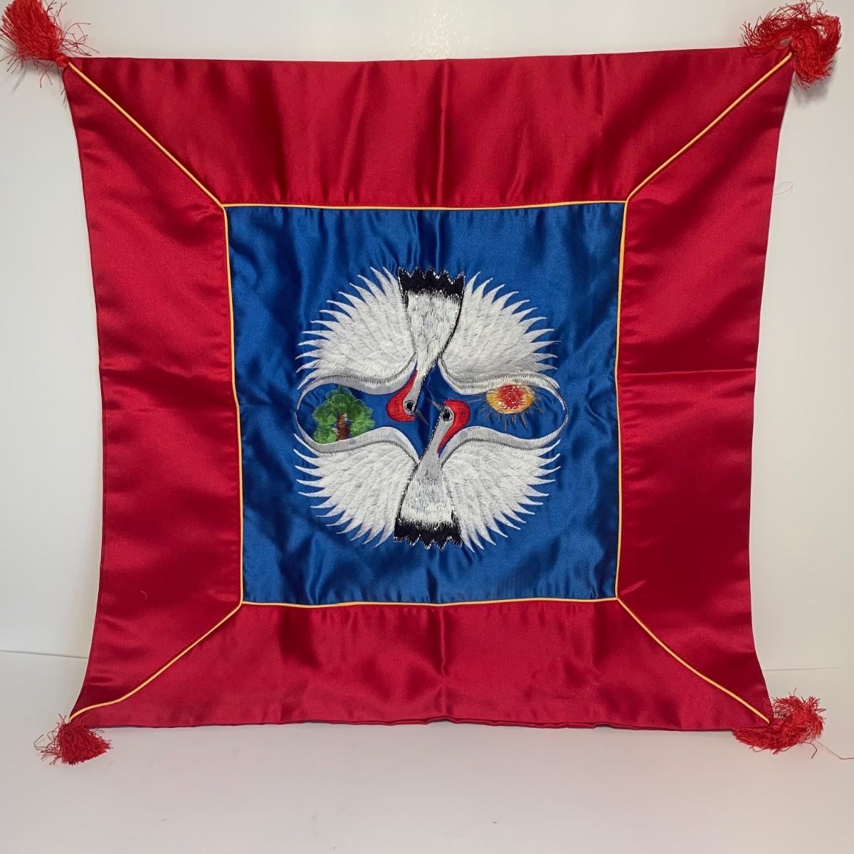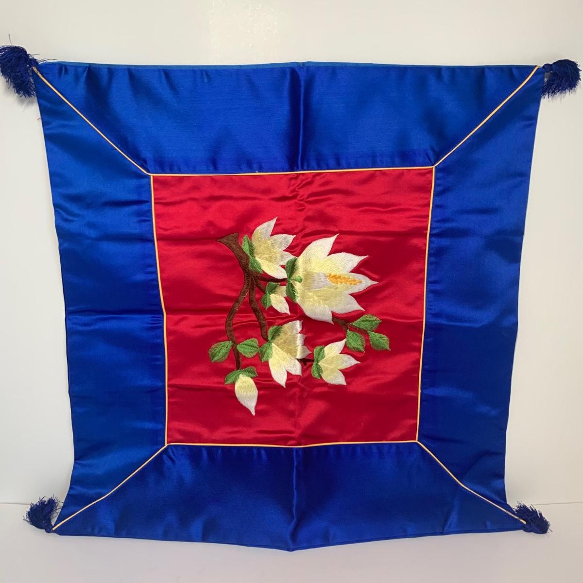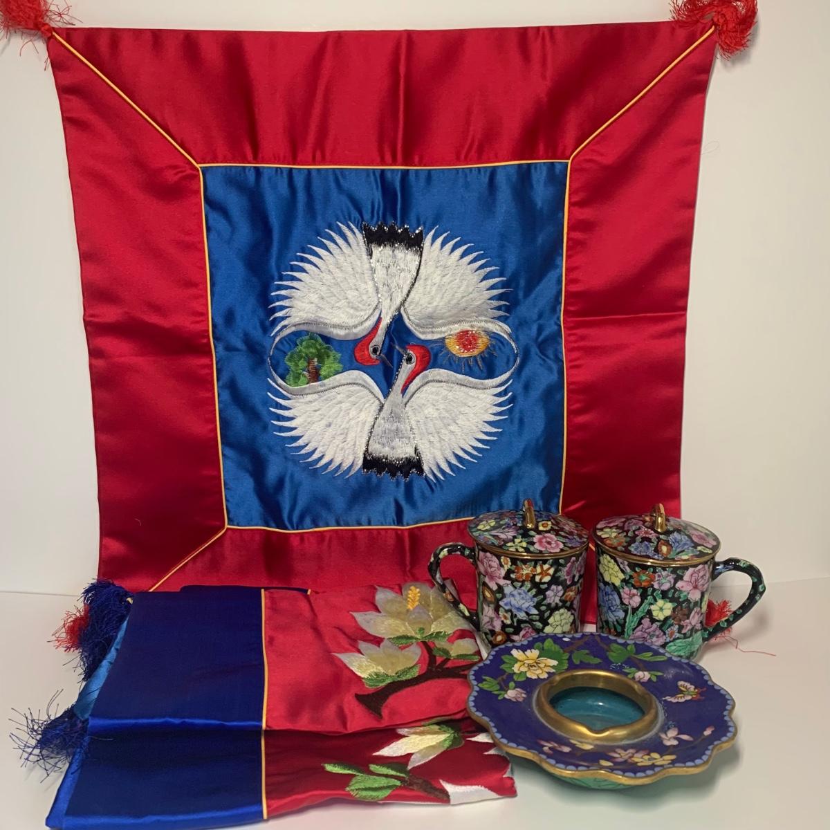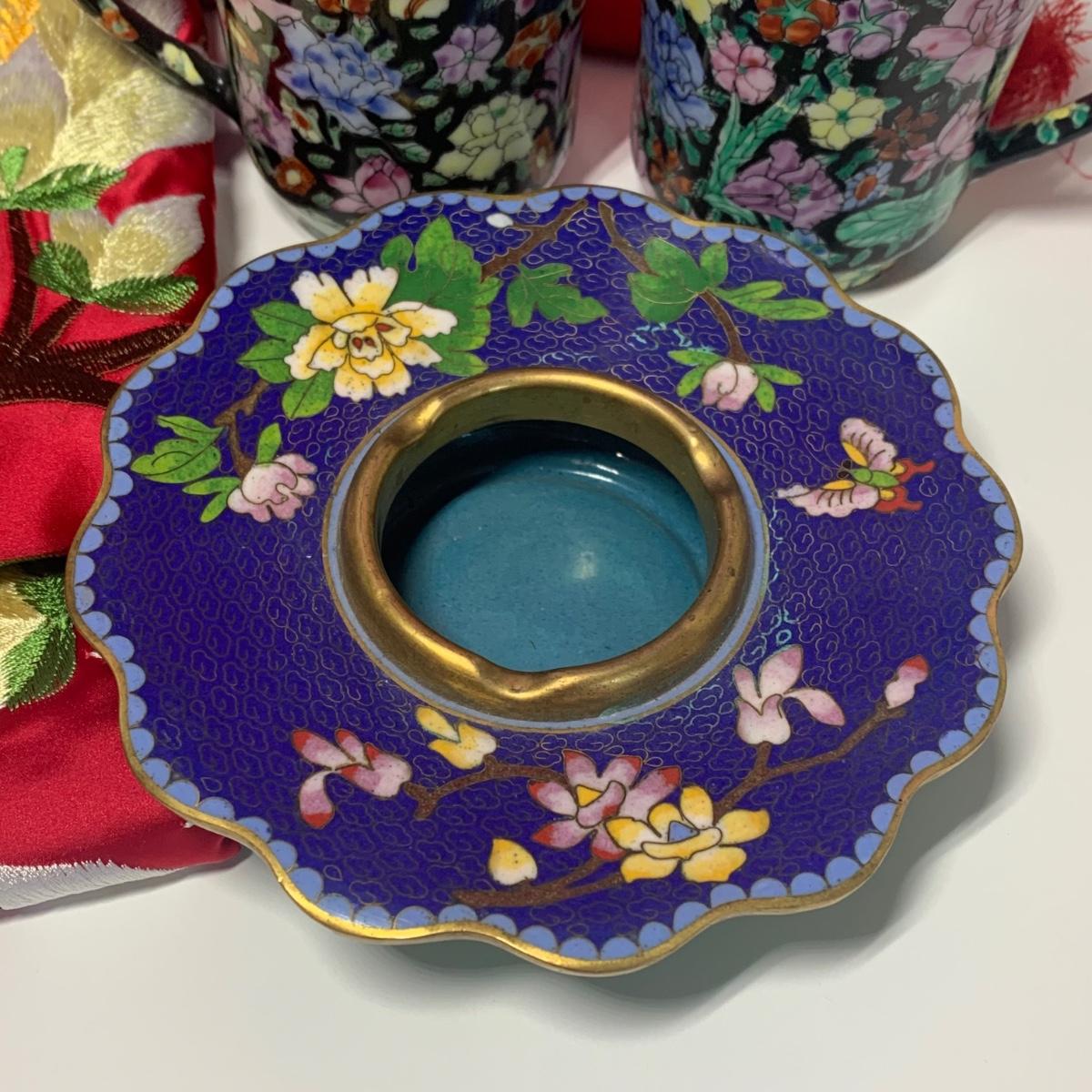 LOT 23R: Handcrafted Satin Embroidered Pillow Covers, Vintage Jingfa Cloisonné Enamel Blue Floral Ashtray, Cloisonné Style Cups w/Lids