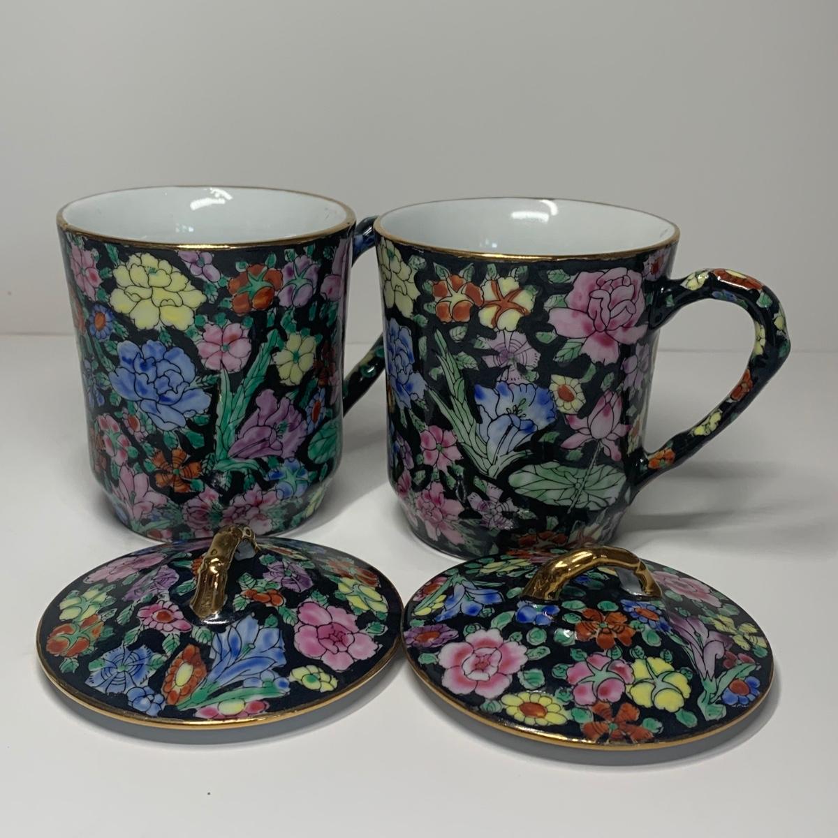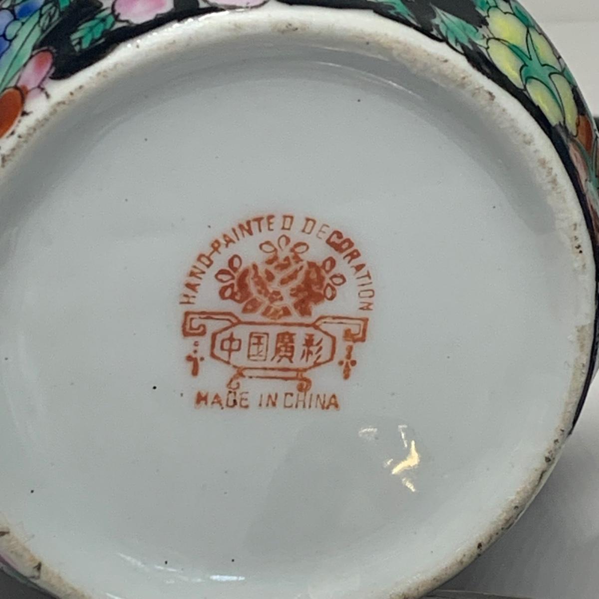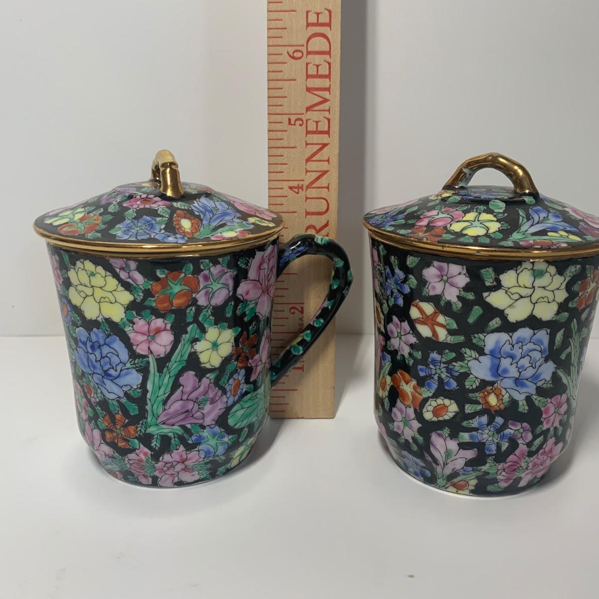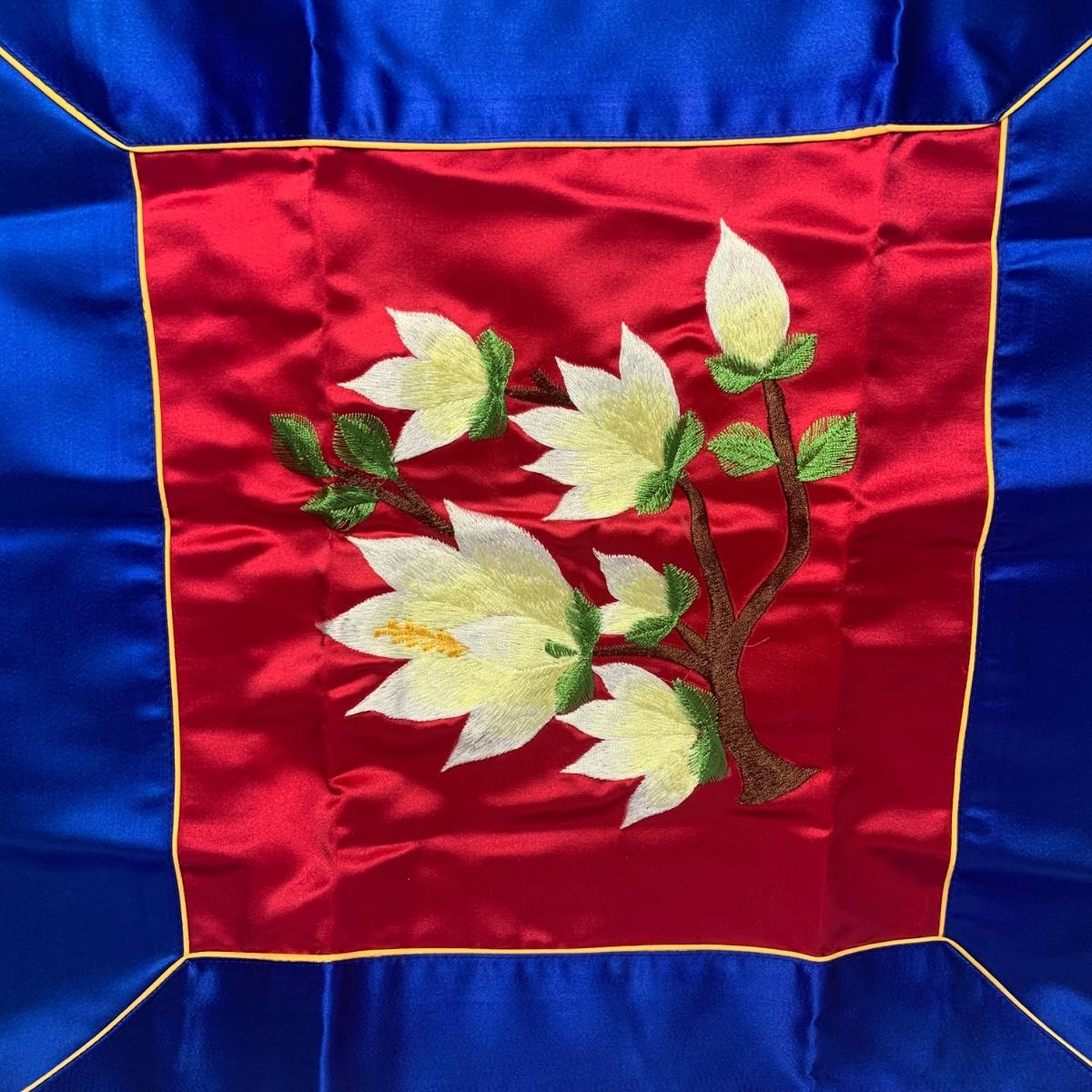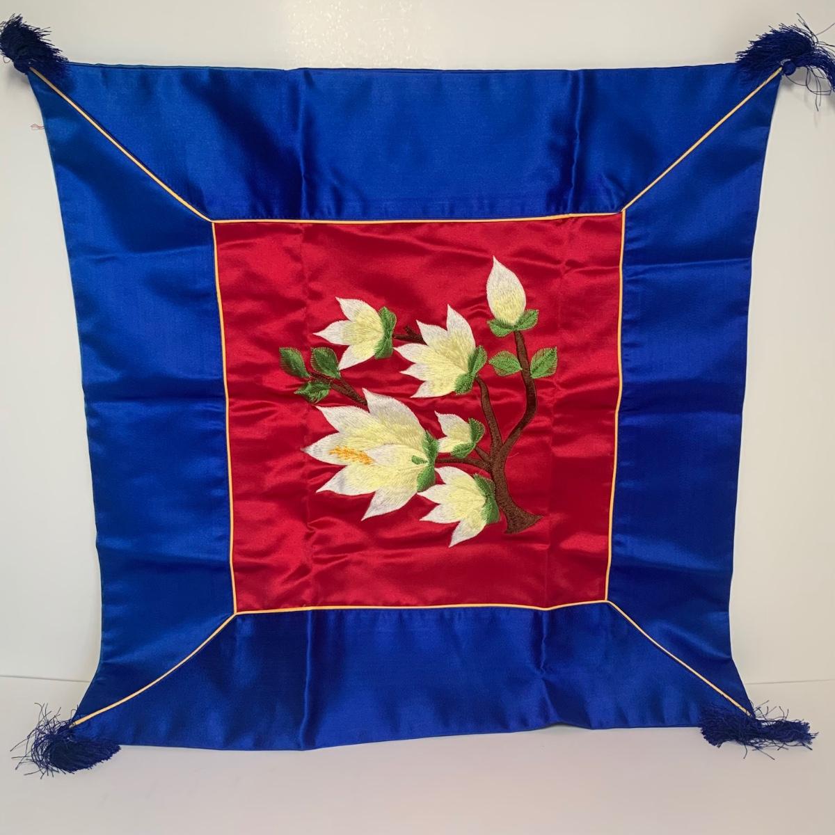 LOT 23R: Handcrafted Satin Embroidered Pillow Covers, Vintage Jingfa Cloisonné Enamel Blue Floral Ashtray, Cloisonné Style Cups w/Lids
