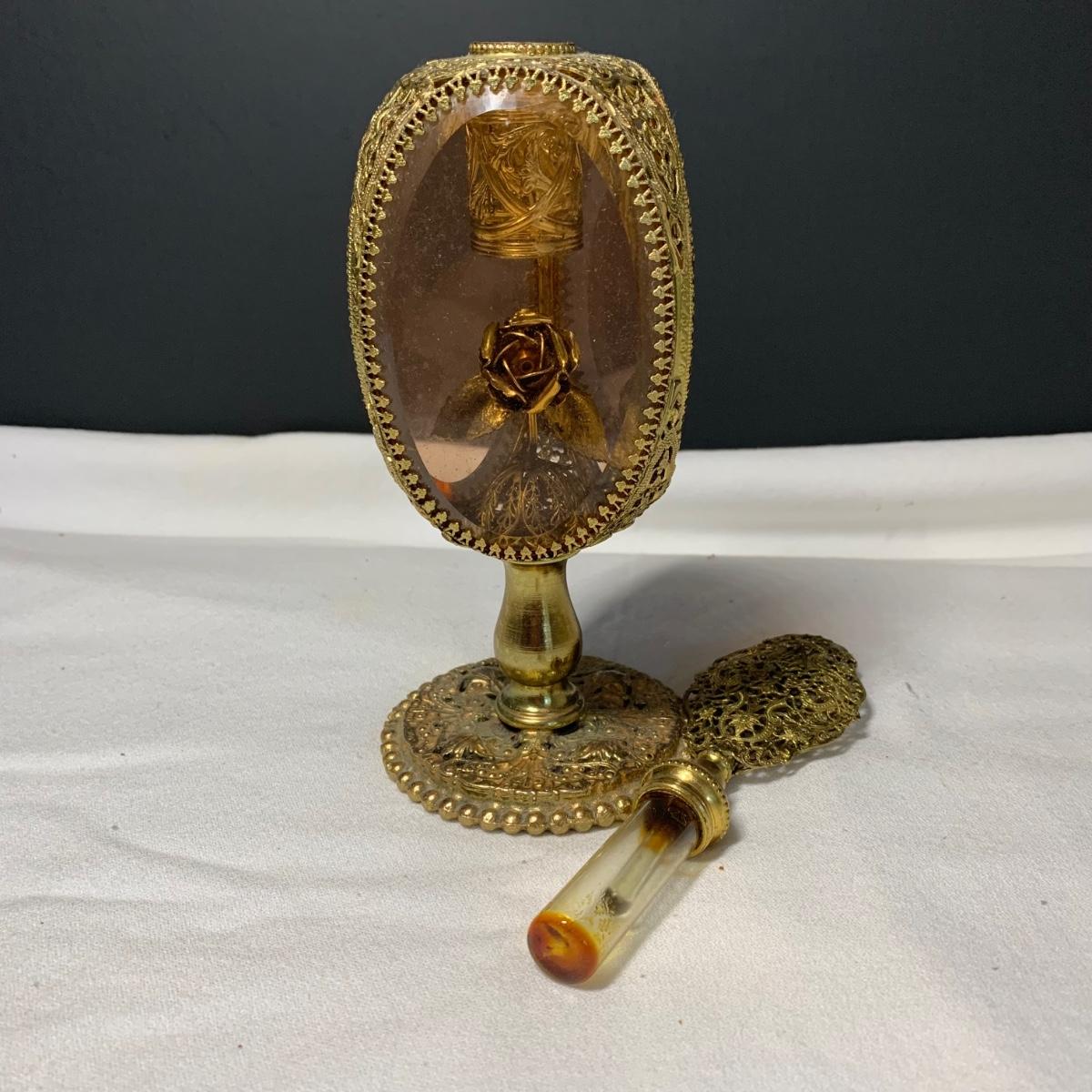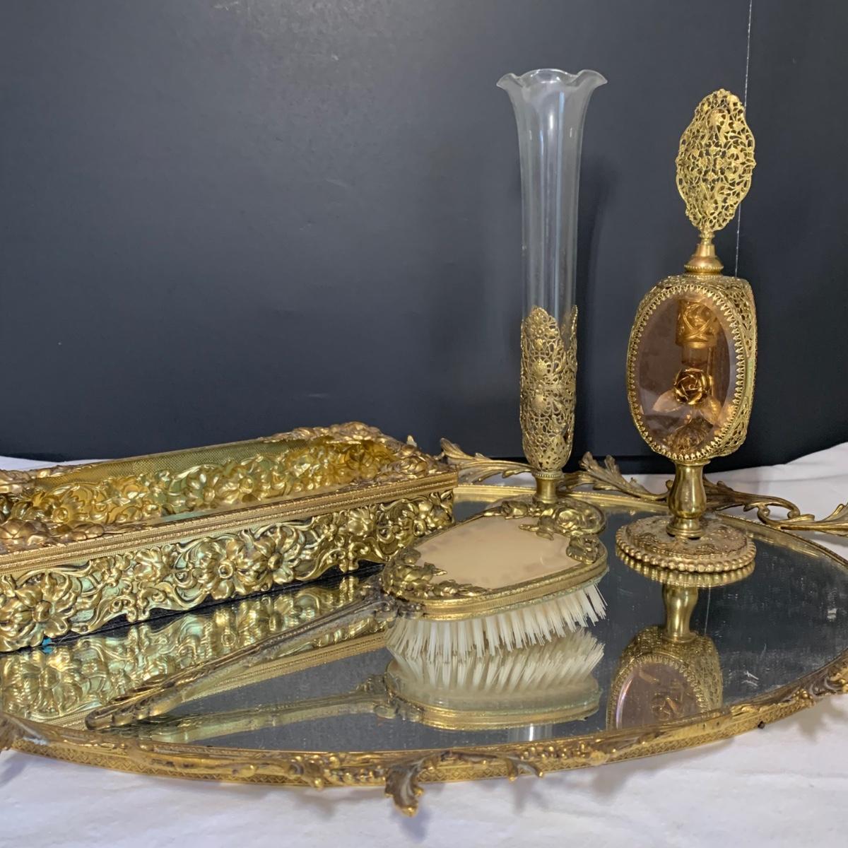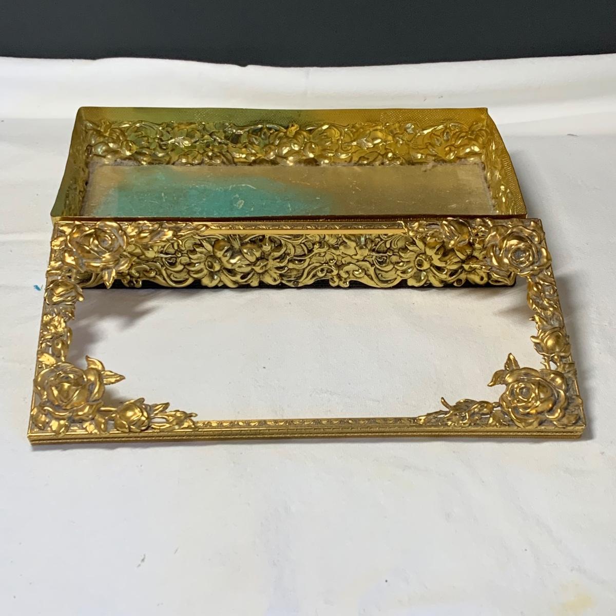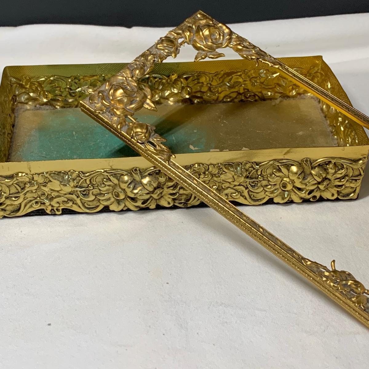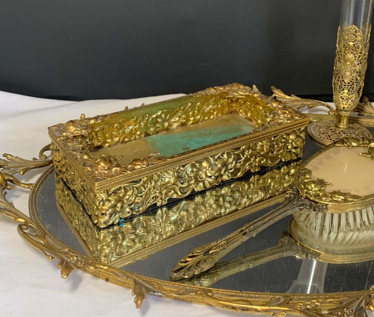 LOT 38R: Filigree Perfume Bottle & Vase, 24k Gold Plated Tissue Box, Ornate Dresser Mirror w/Angel Handles