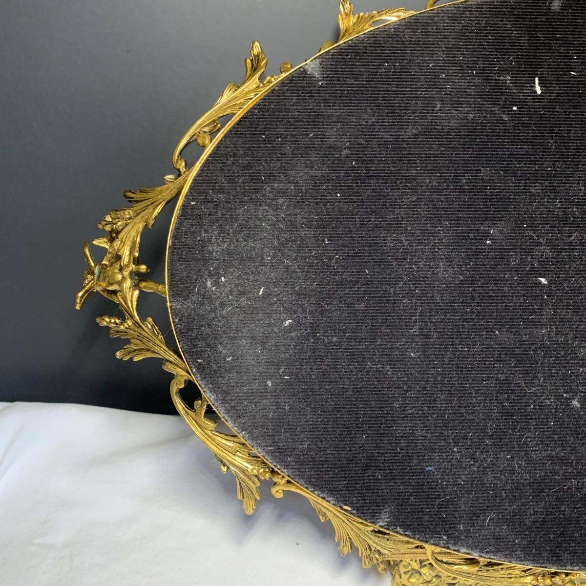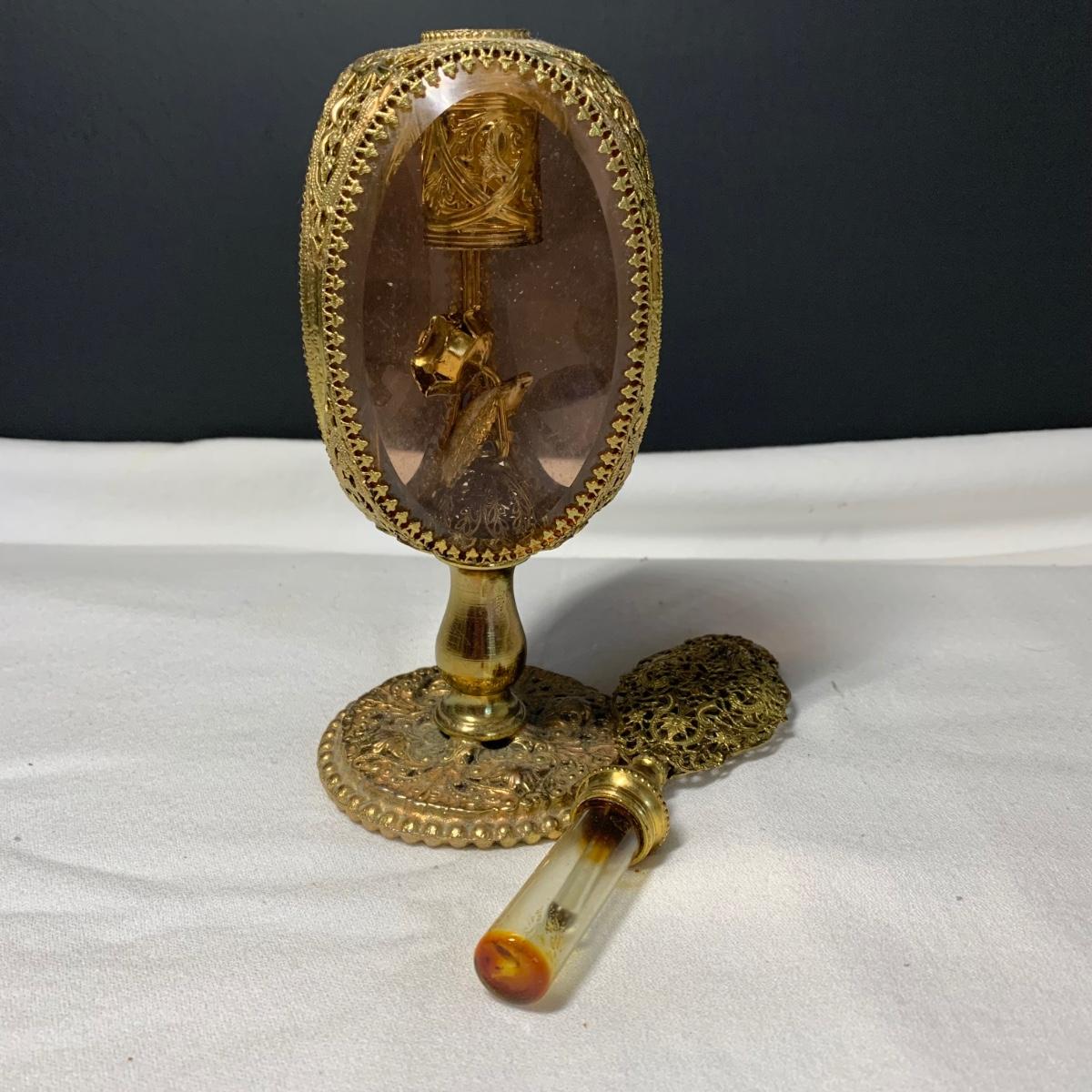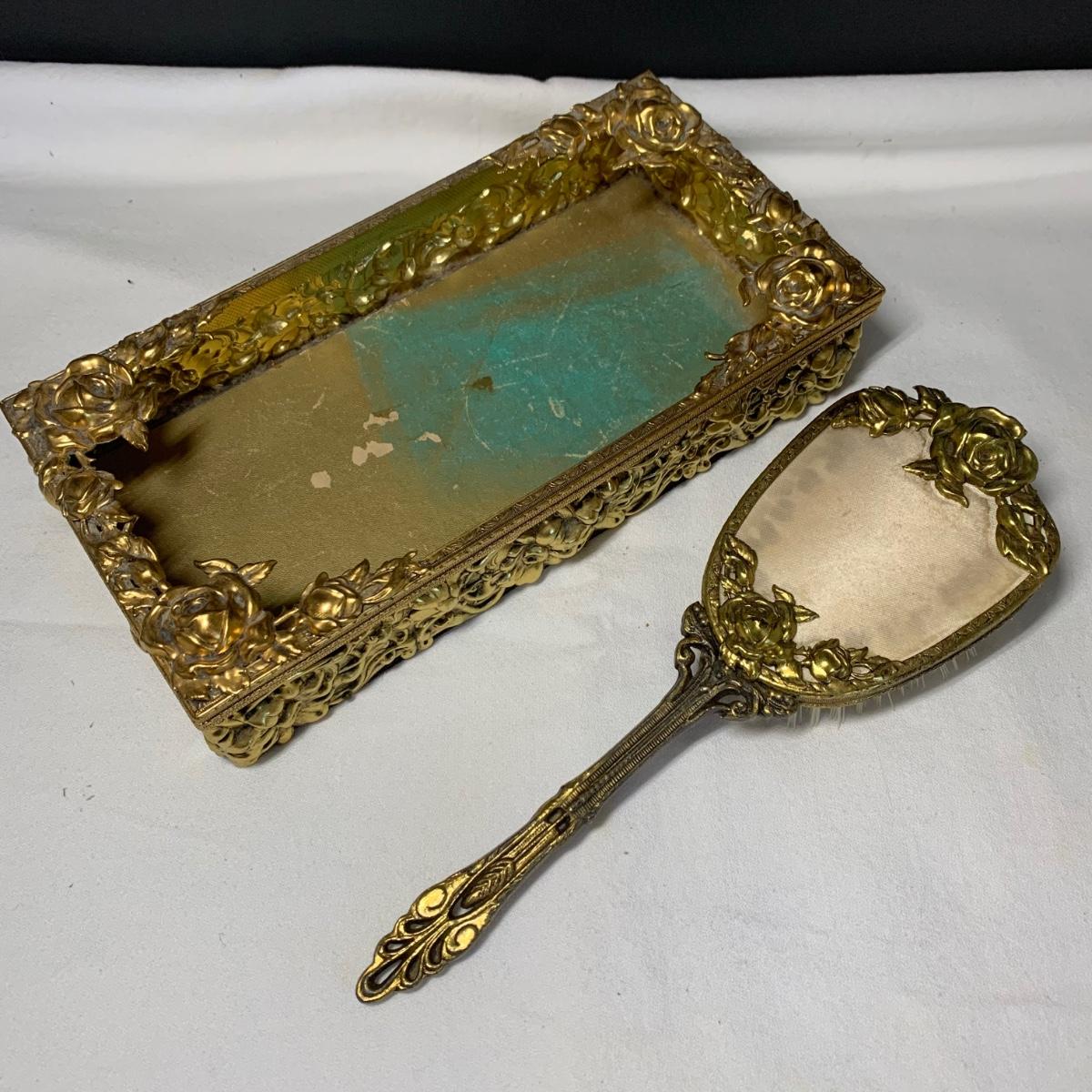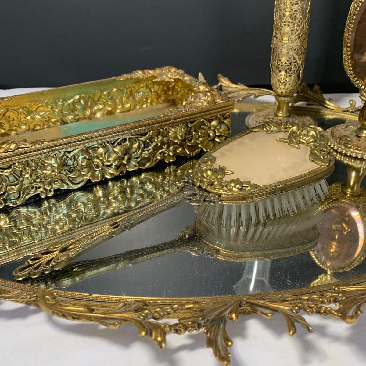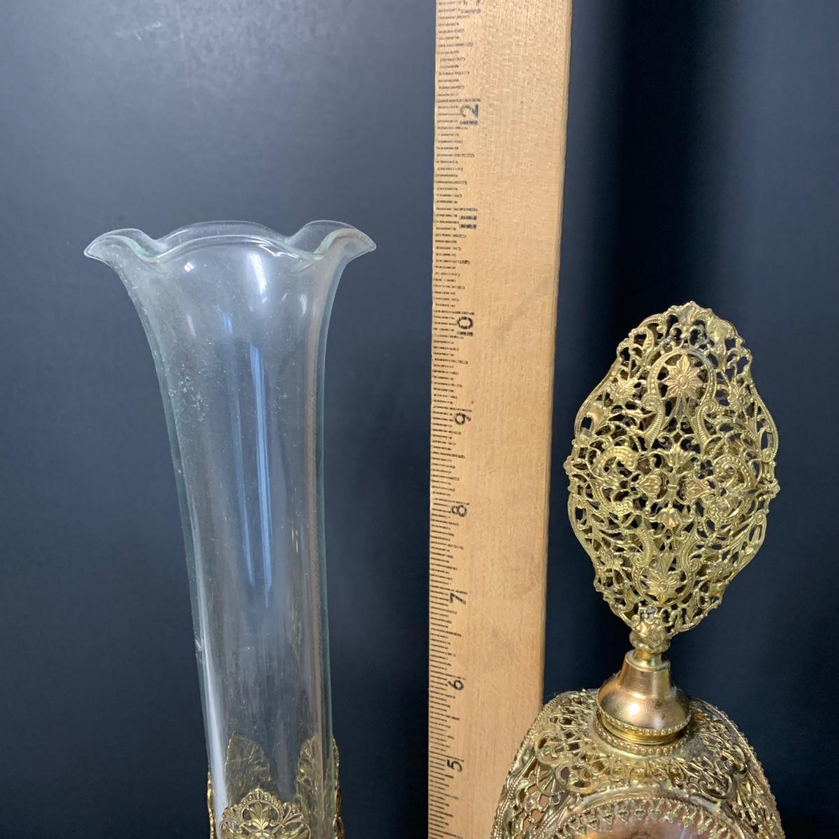 LOT 38R: Filigree Perfume Bottle & Vase, 24k Gold Plated Tissue Box, Ornate Dresser Mirror w/Angel Handles