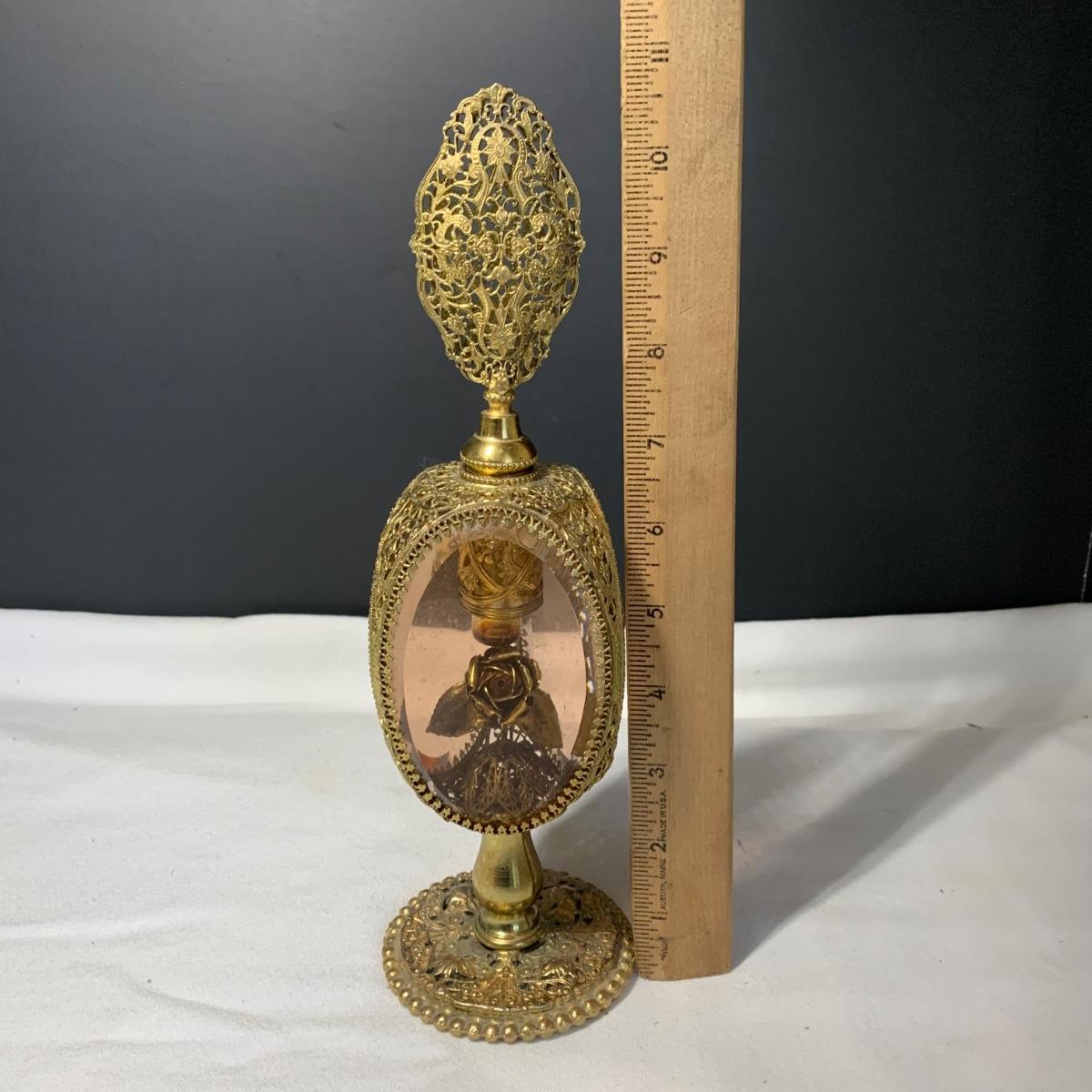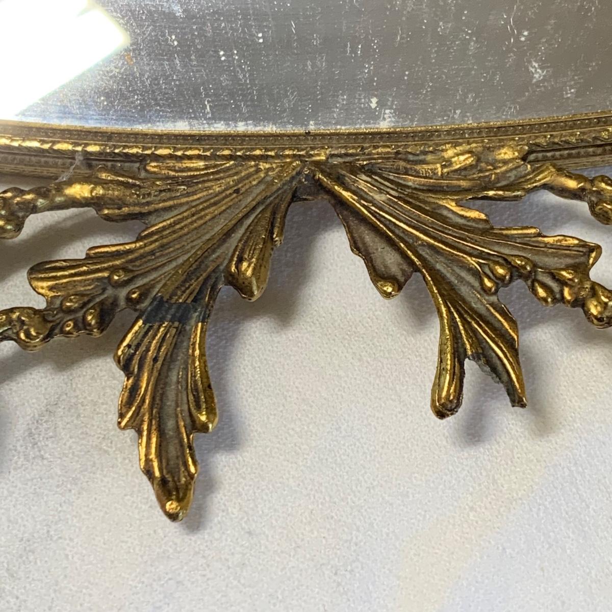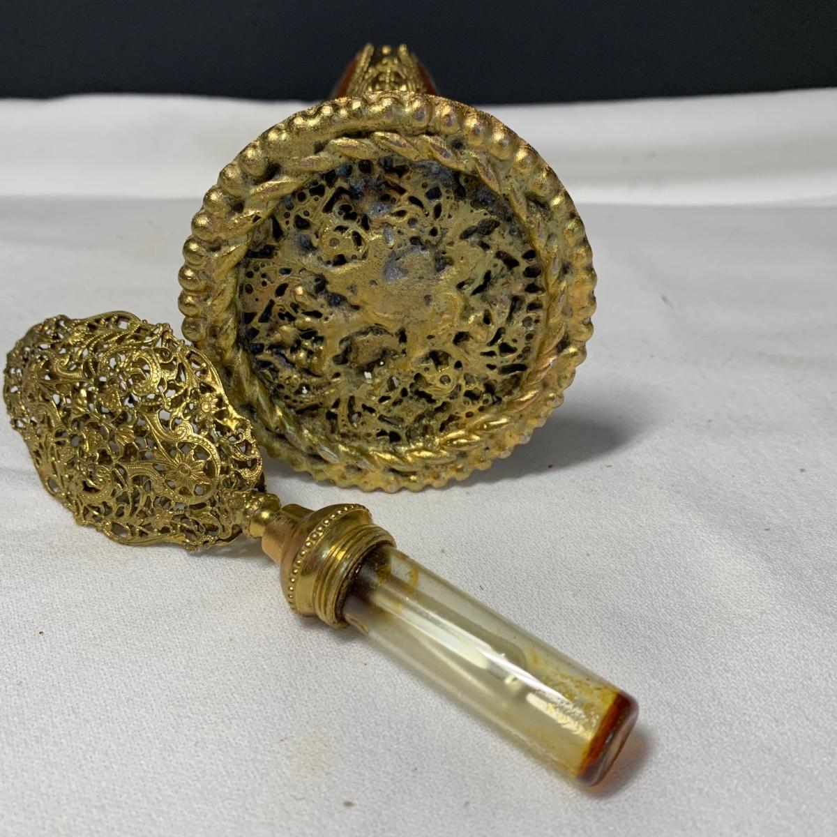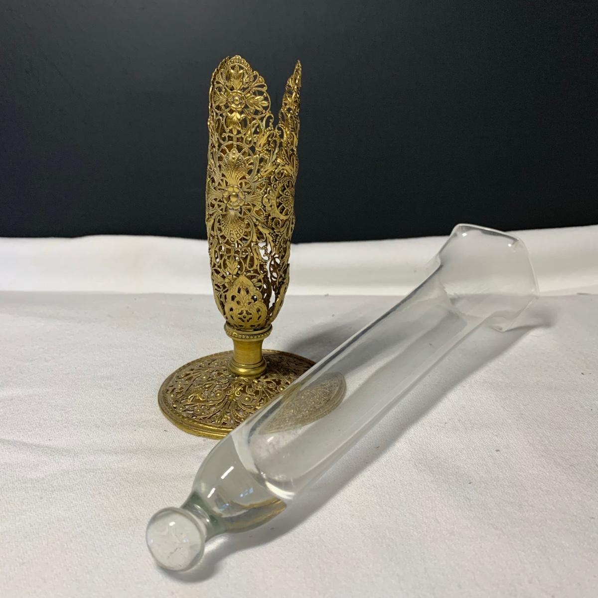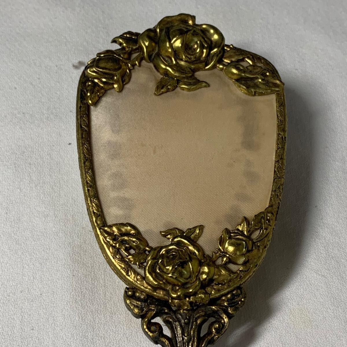 LOT 38R: Filigree Perfume Bottle & Vase, 24k Gold Plated Tissue Box, Ornate Dresser Mirror w/Angel Handles