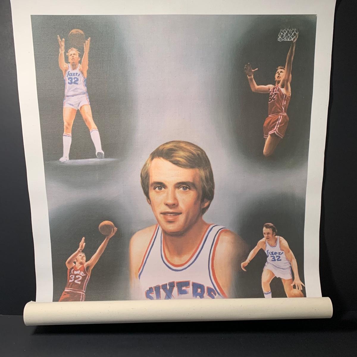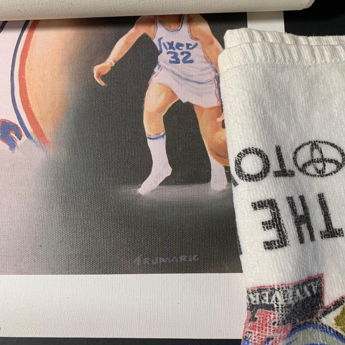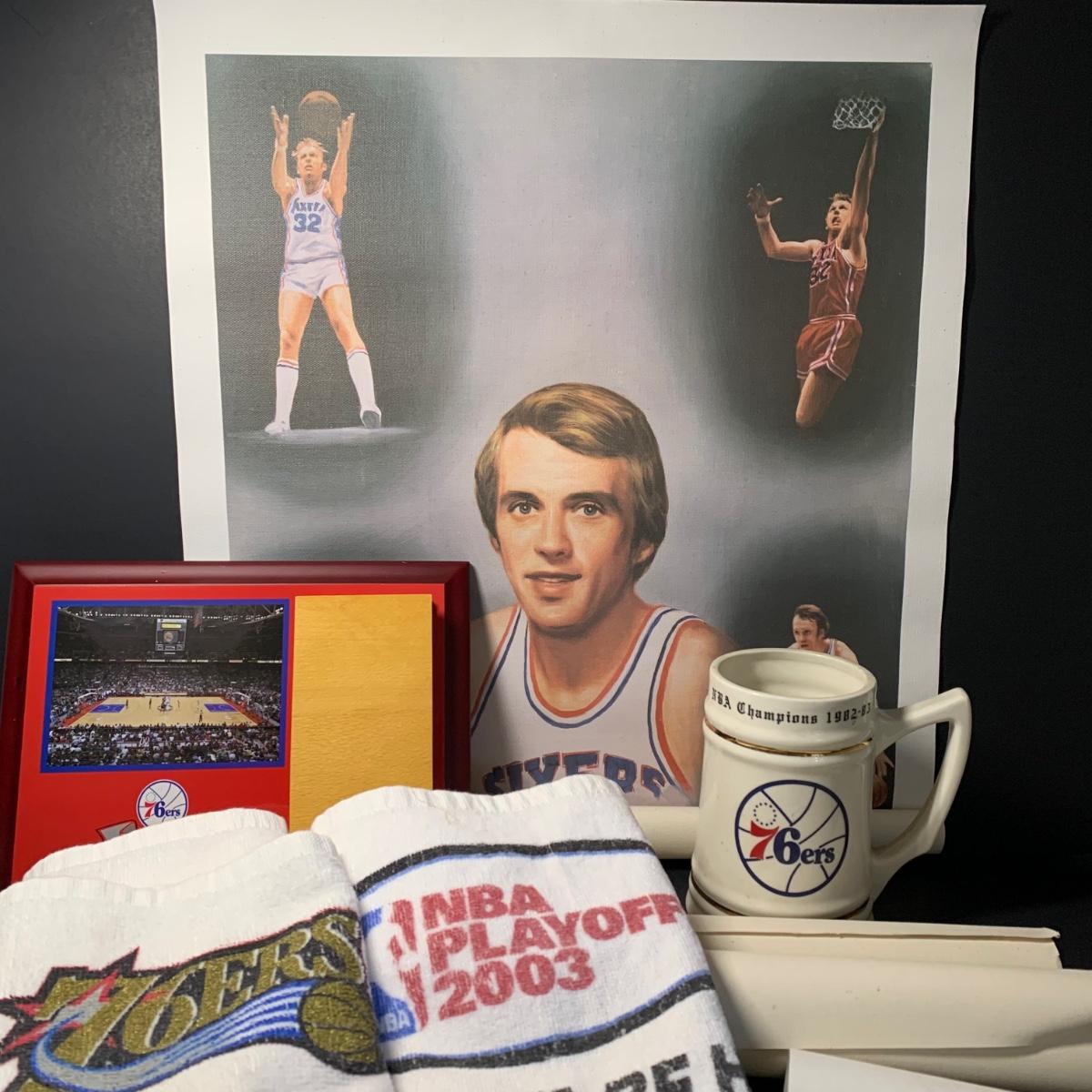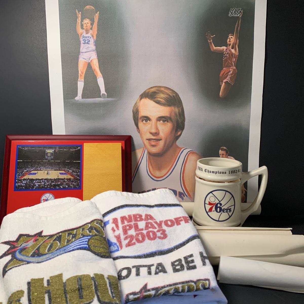 LOT 42R: Philadelphia 76ers Collection: Original Oil Portraits by Diamond Portraits, Final Spectrum Floor Board w/COA, Mug & Rally Towels