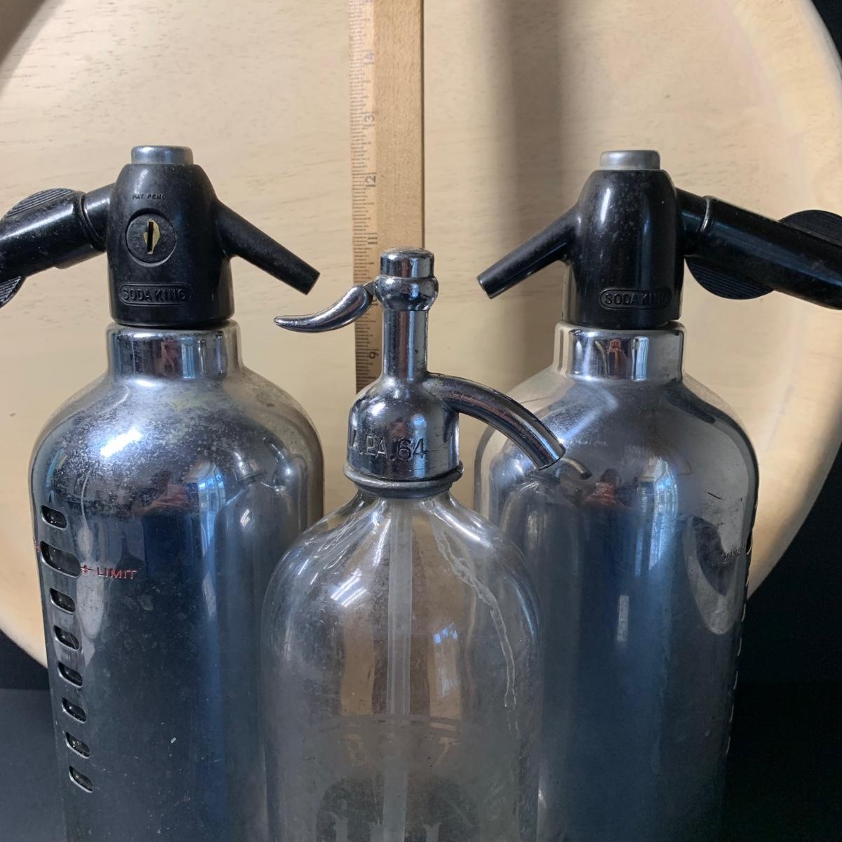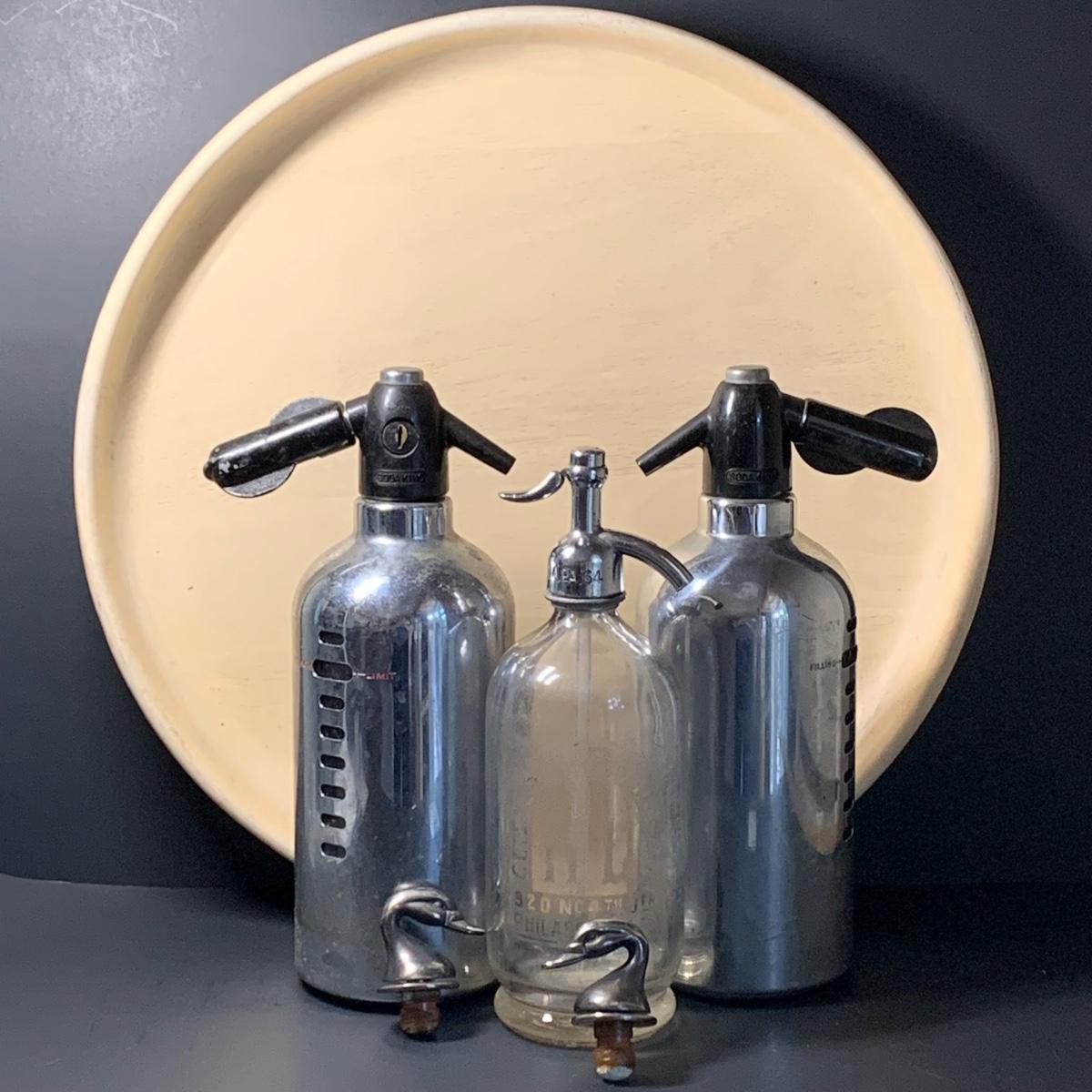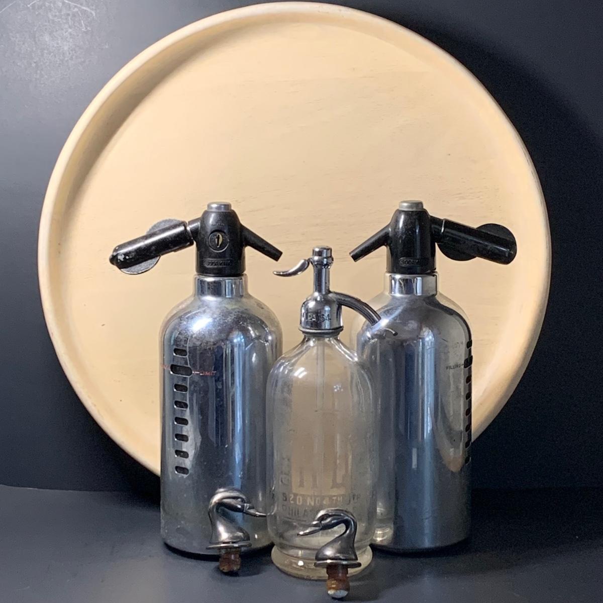 LOT 43R: Vintage Soda King Chrome Metal & Glass Seltzer Bottles, Etched Glass Seltzer Bottle, Silver Plated Bottle Stopper & Dansk Serving Tray