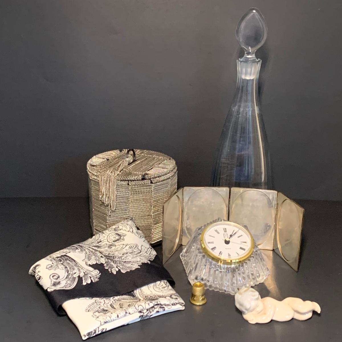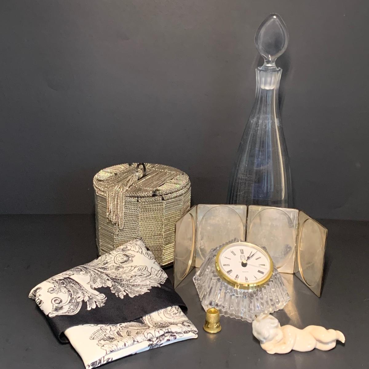 LOT 44R: Lladro Sleeping Baby Angel Figurine, Signed & Numbered Crystal Decanter, Silver Plated Picture Frame,  Anna Hutte Crystal Clock, New View Chain Trinket Box