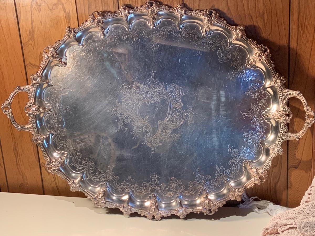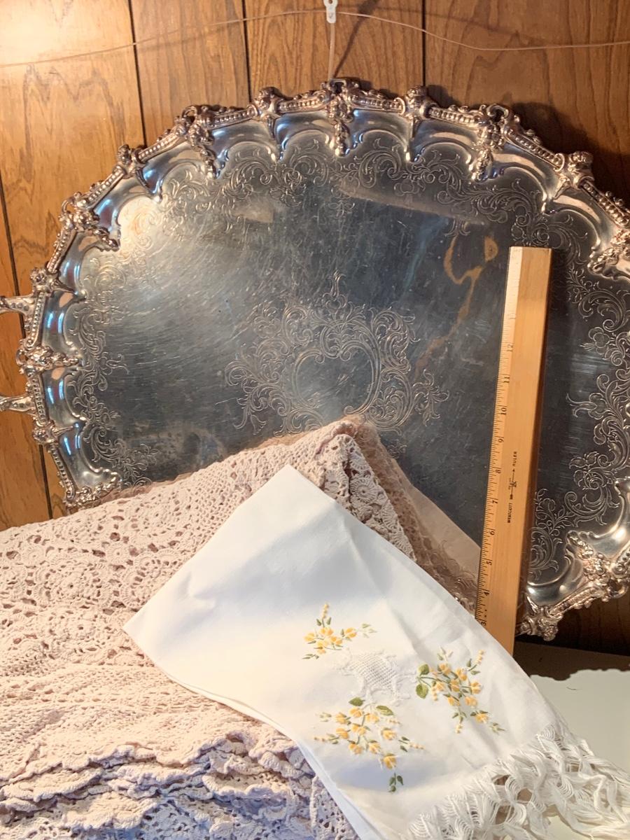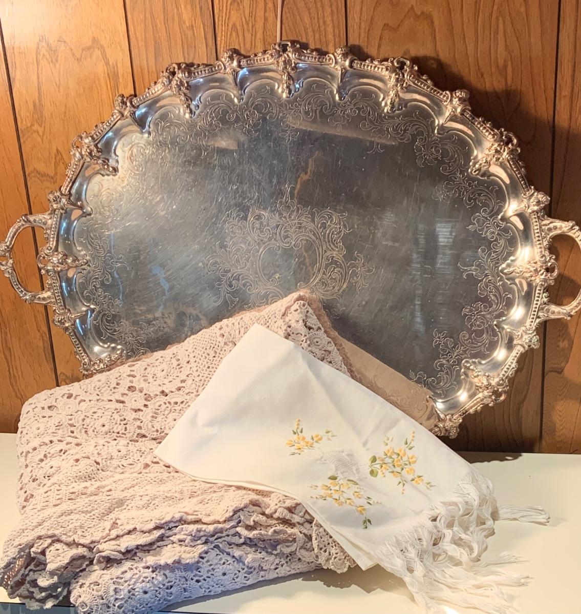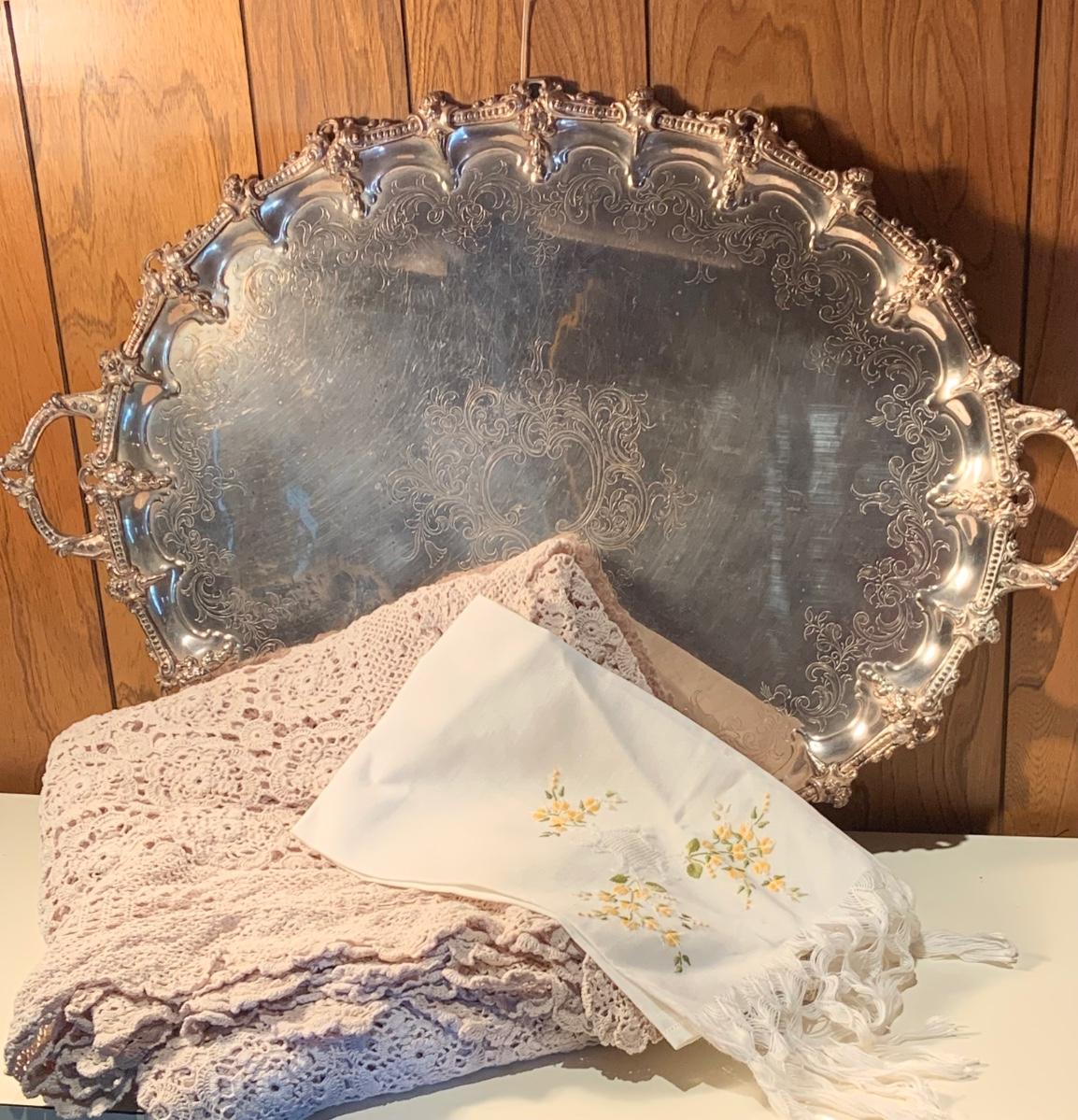 LOT::173G: Silver Tray Unmarked; Table Cloth and Napkin