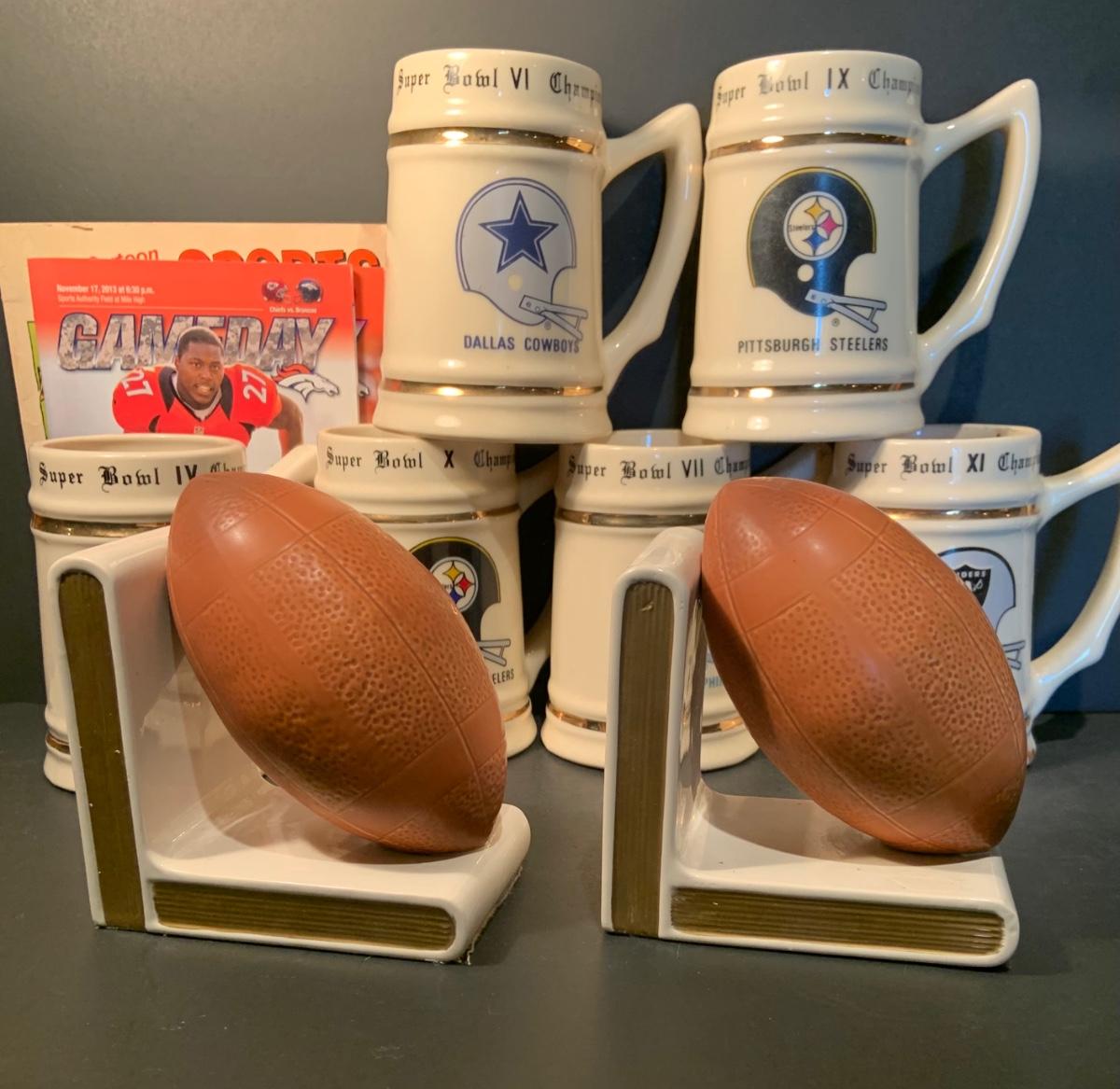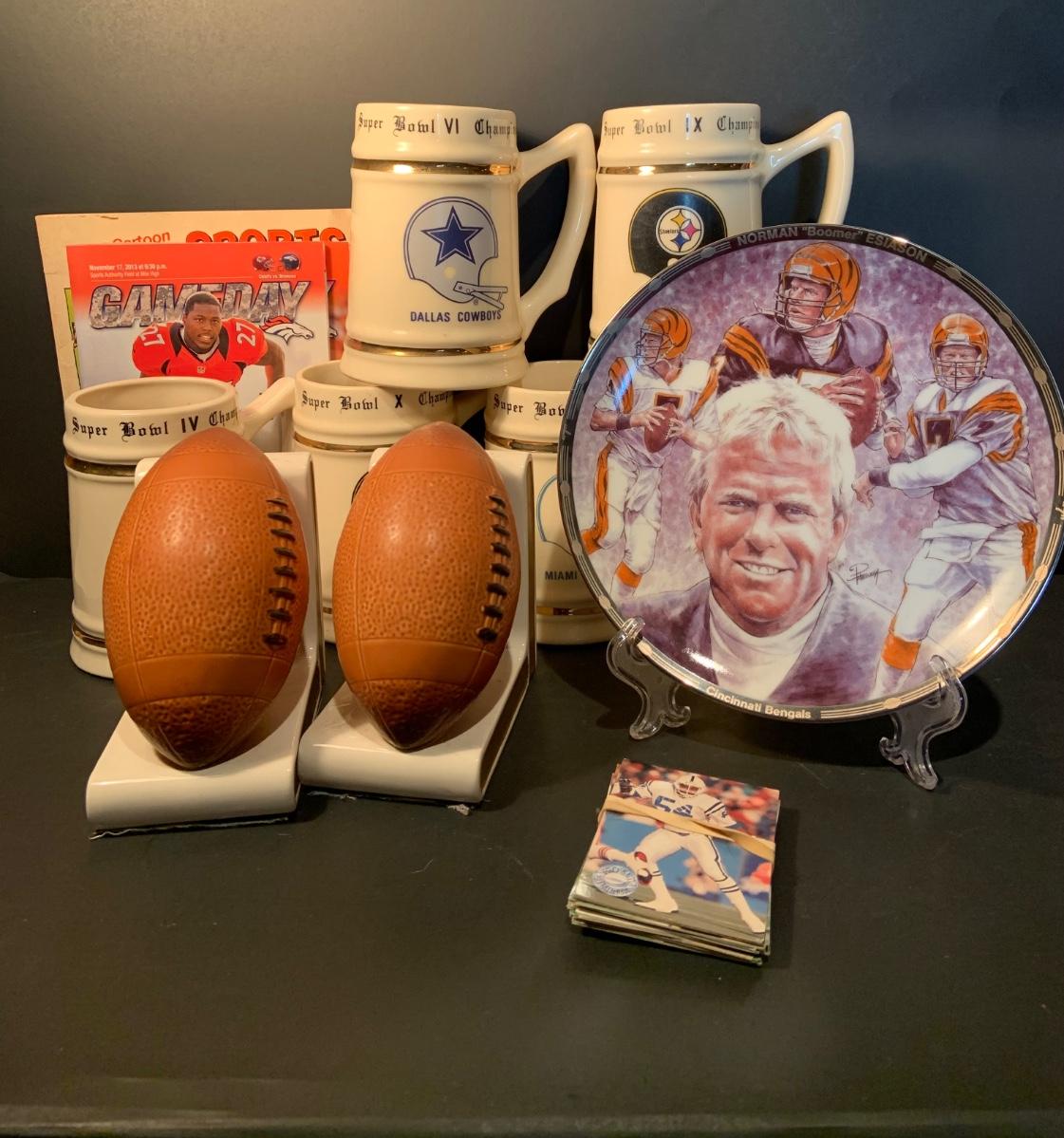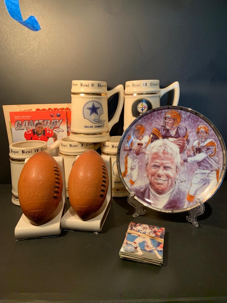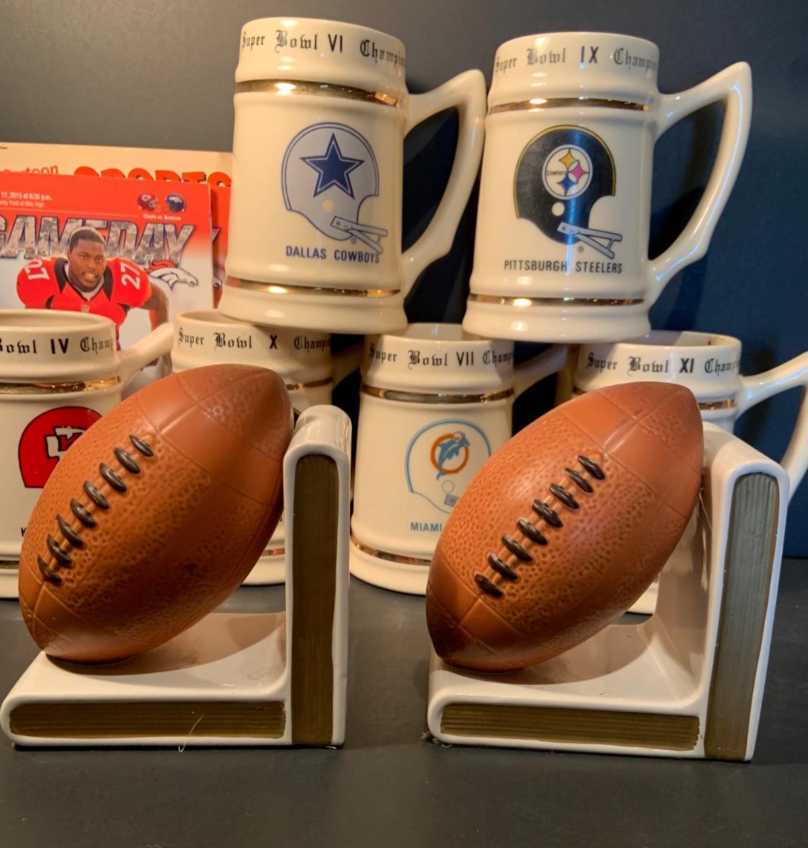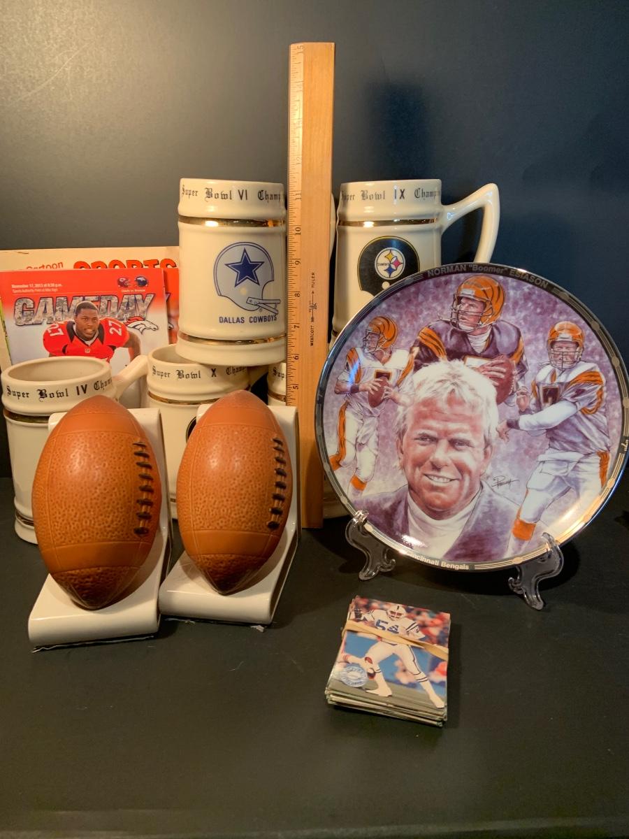 LOT::177G: Football Memorabillia Including Super Ball Mugs, Trading Cards, Football Bookends and More
