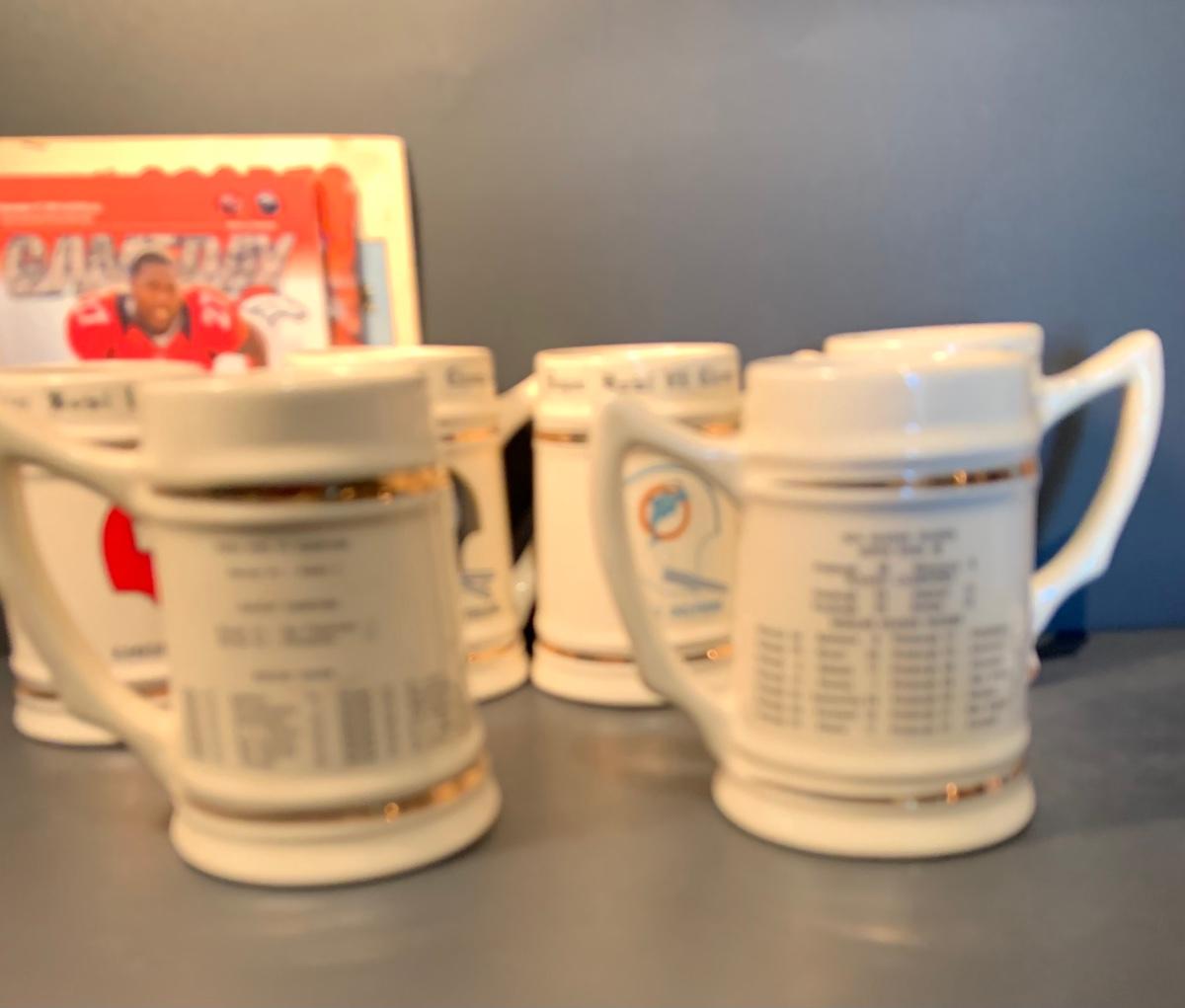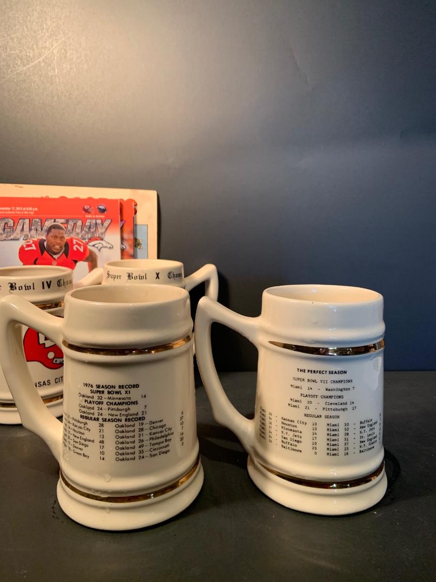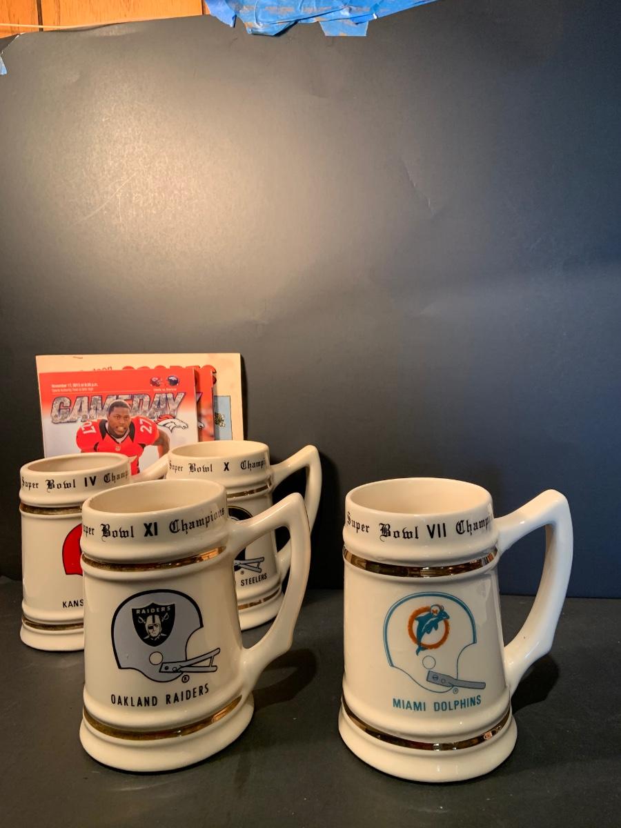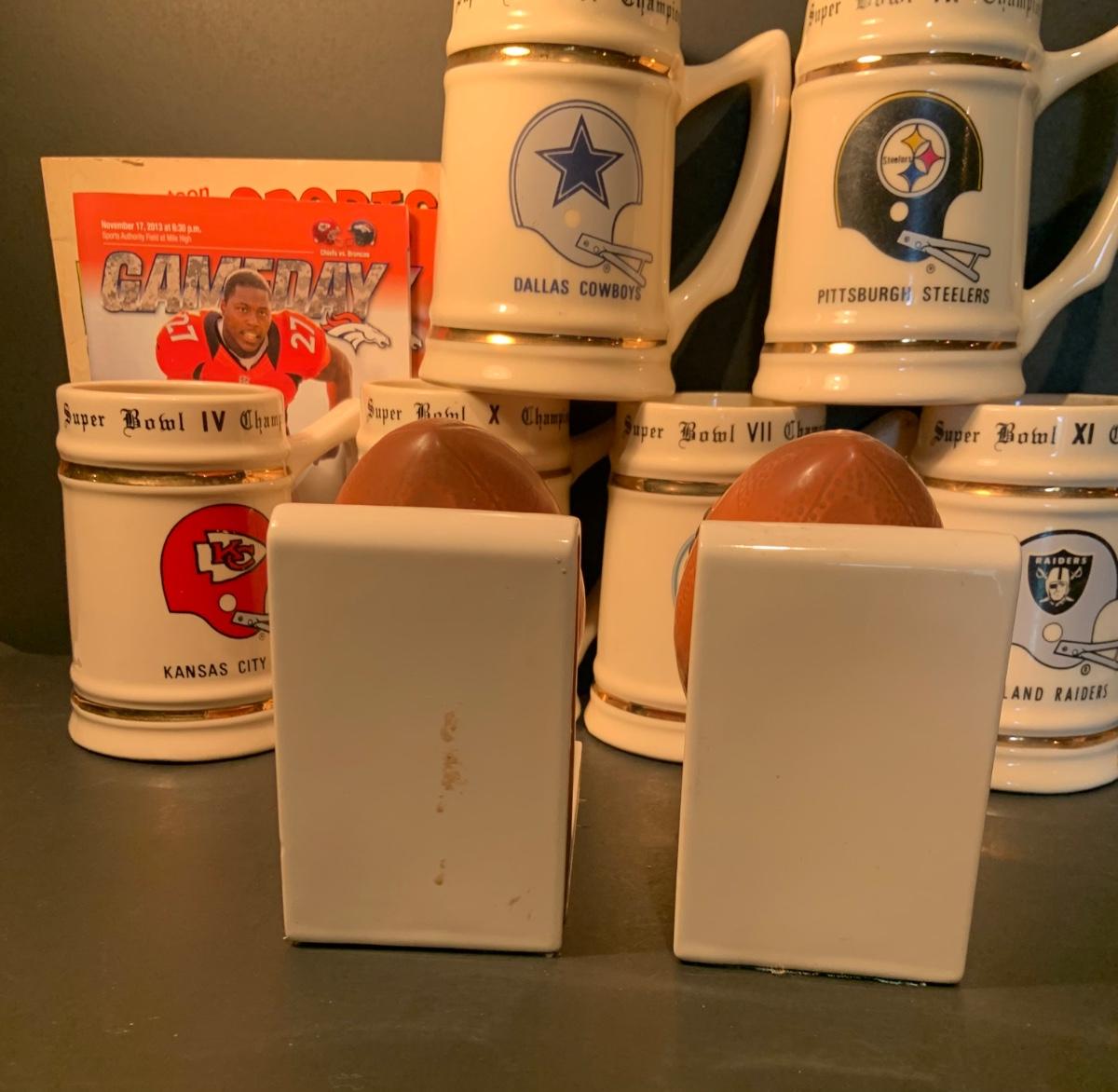 LOT::177G: Football Memorabillia Including Super Ball Mugs, Trading Cards, Football Bookends and More