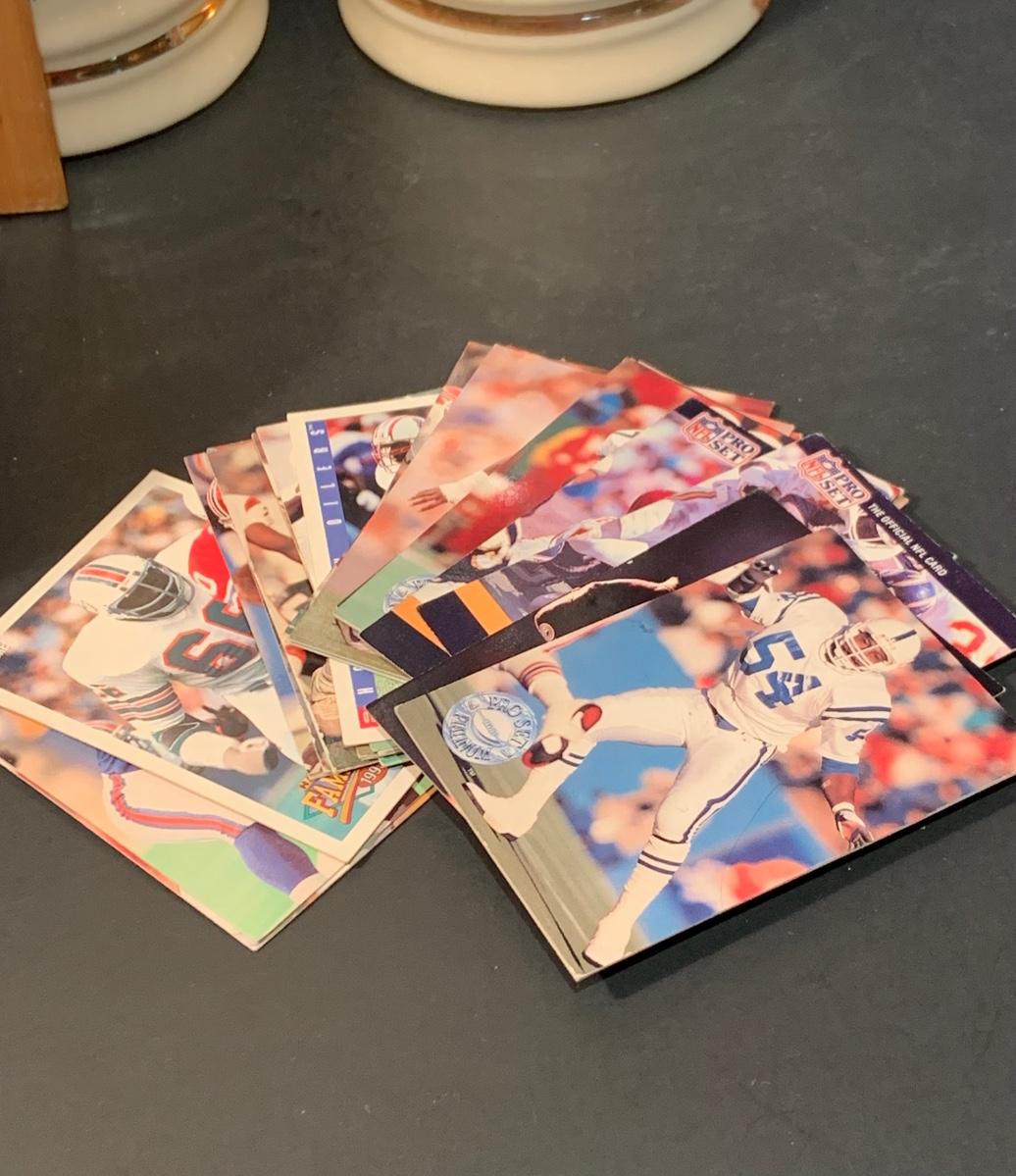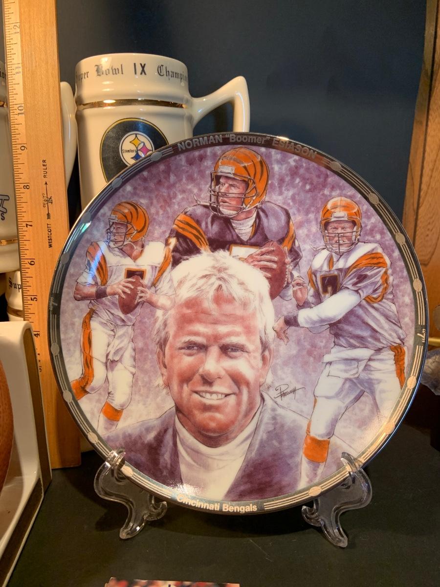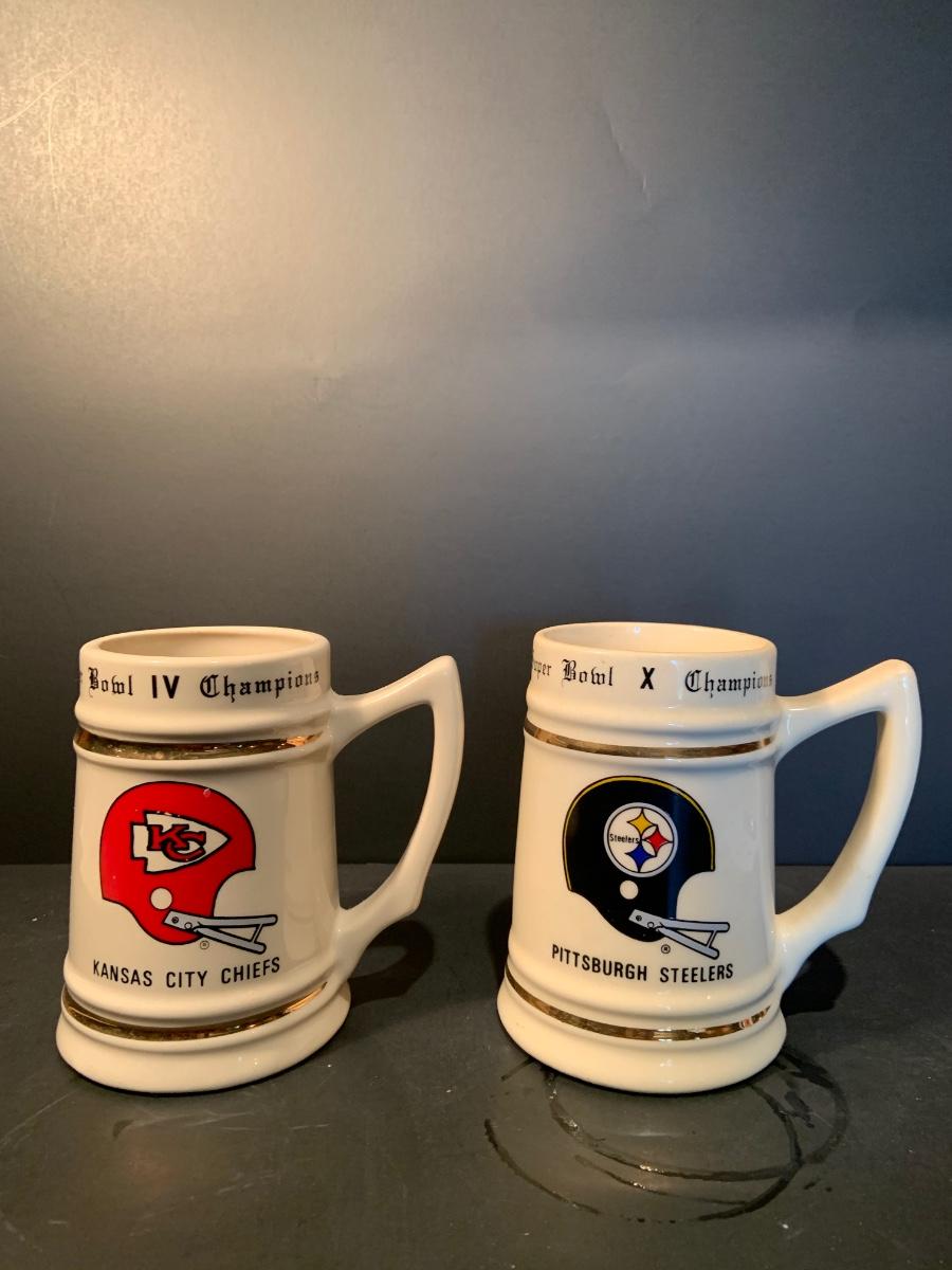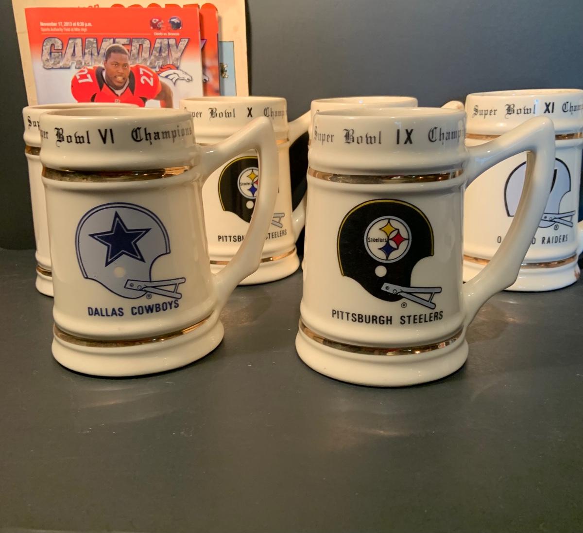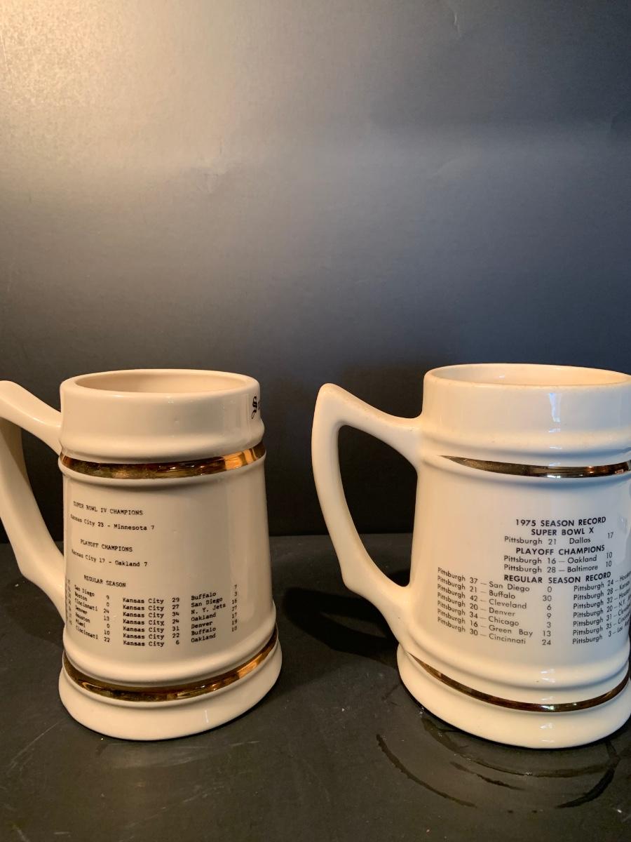 LOT::177G: Football Memorabillia Including Super Ball Mugs, Trading Cards, Football Bookends and More