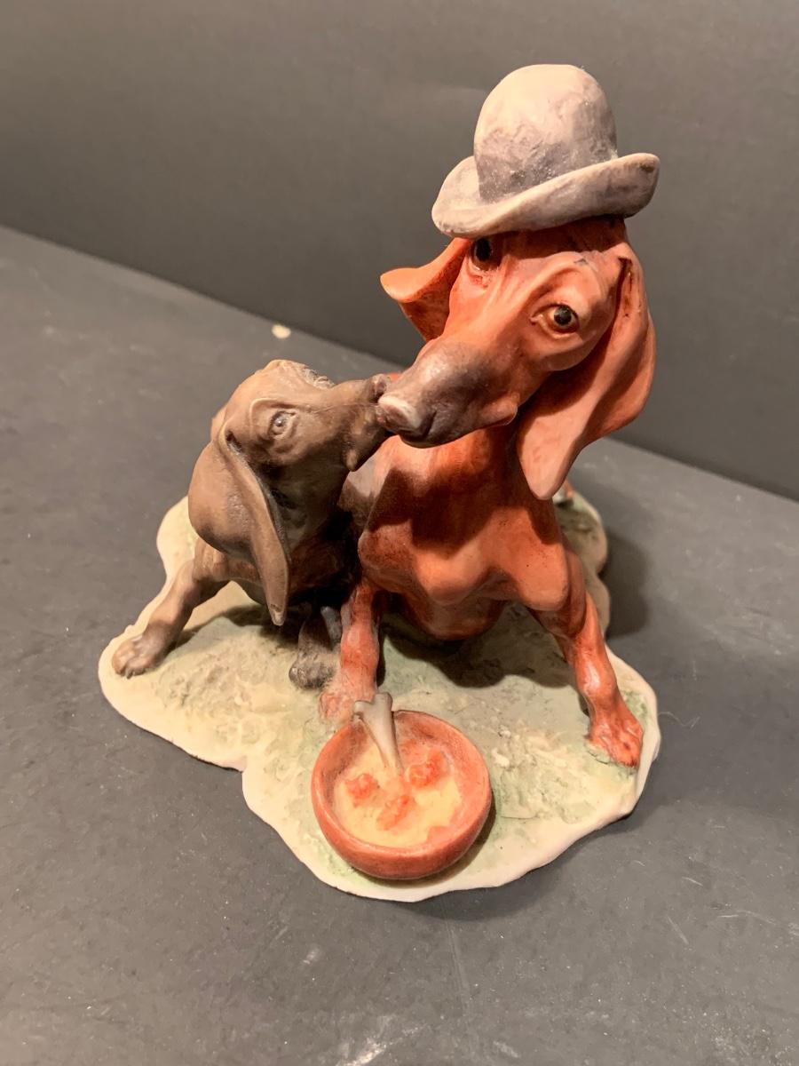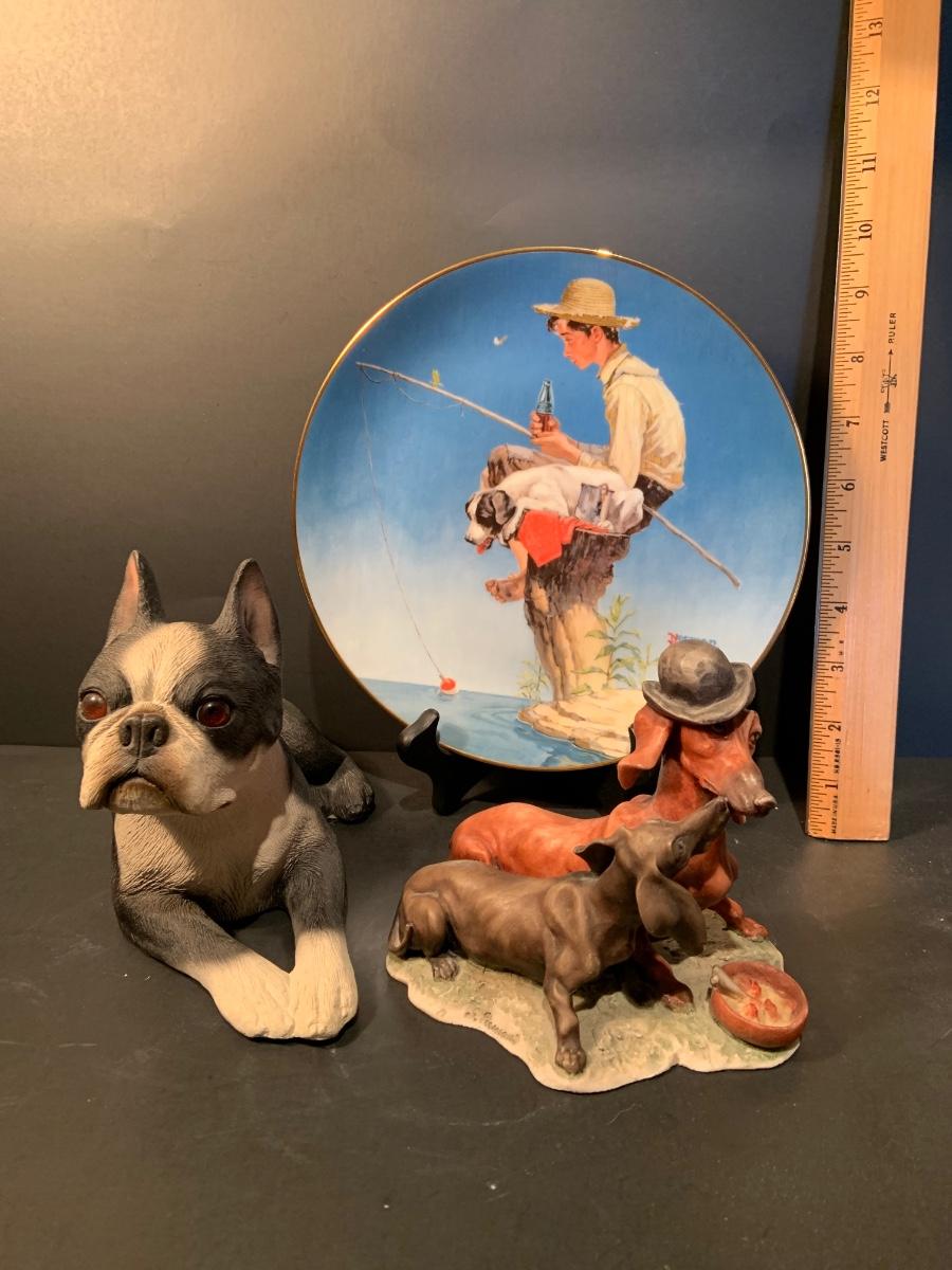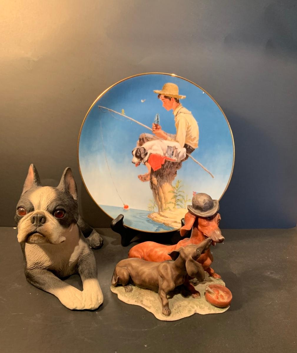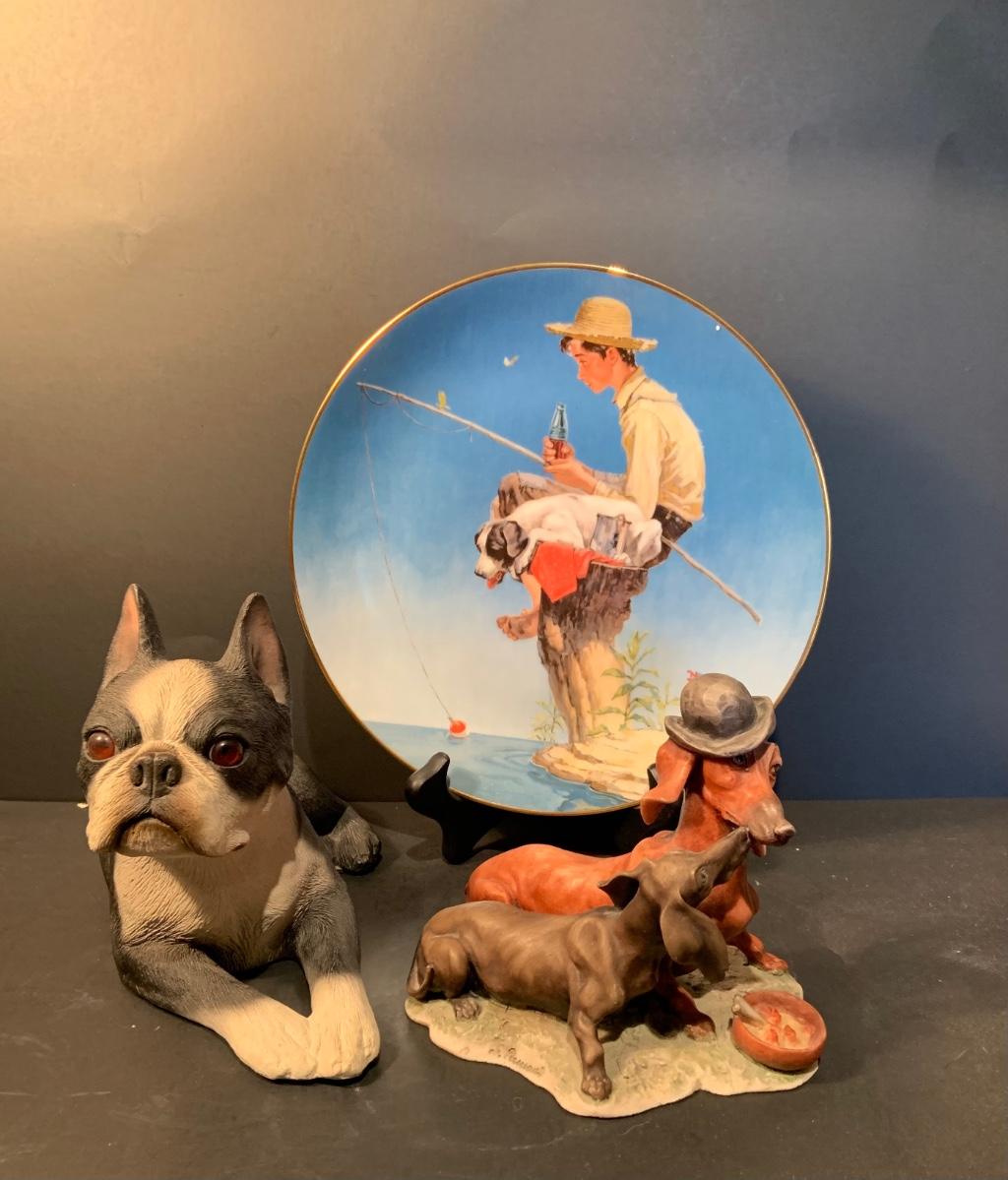 LOT:179G: Gieseppe Armani Porcelain Dachshund Dogs, SandiCast Boston Terrier and a Rockwell Coke Collector Plate
