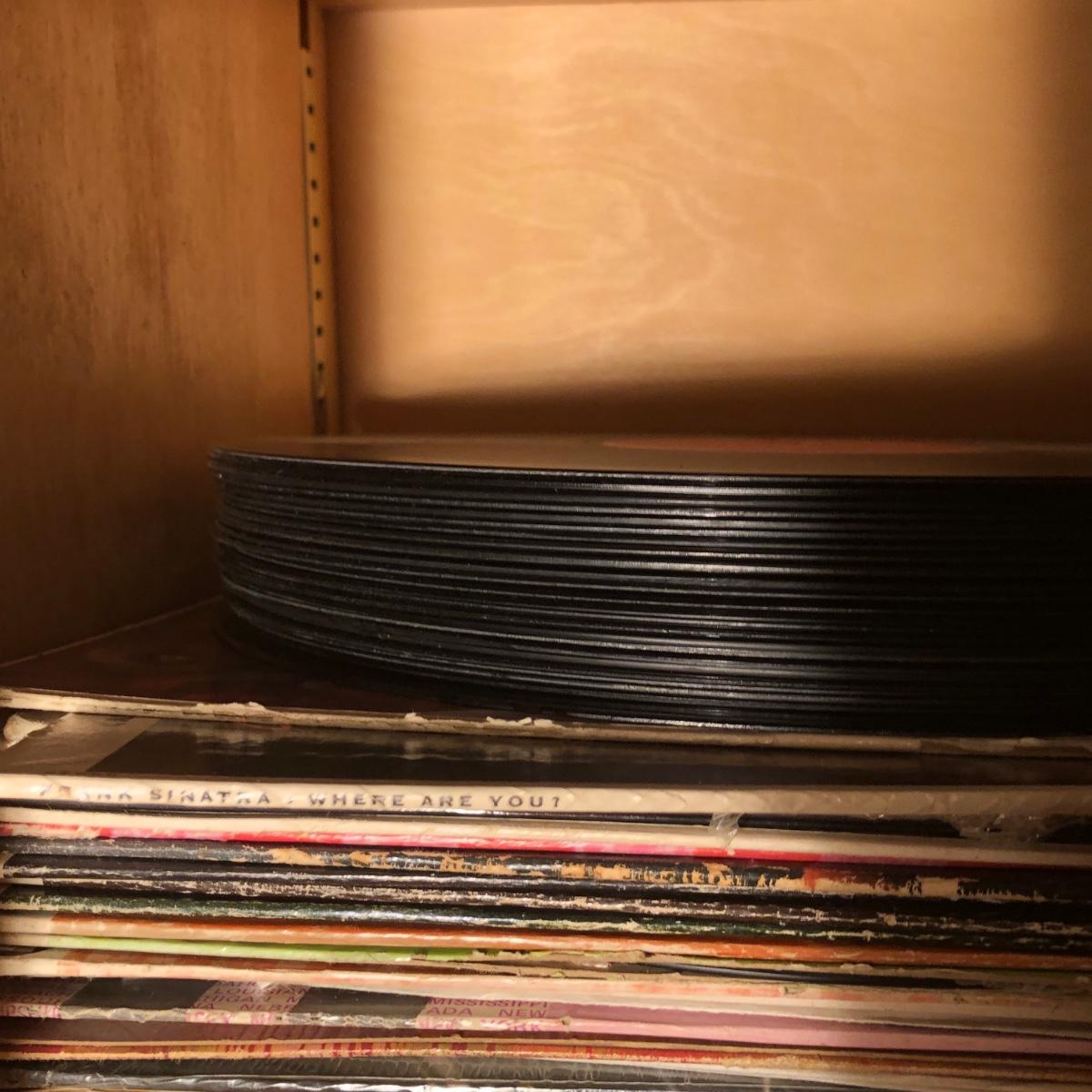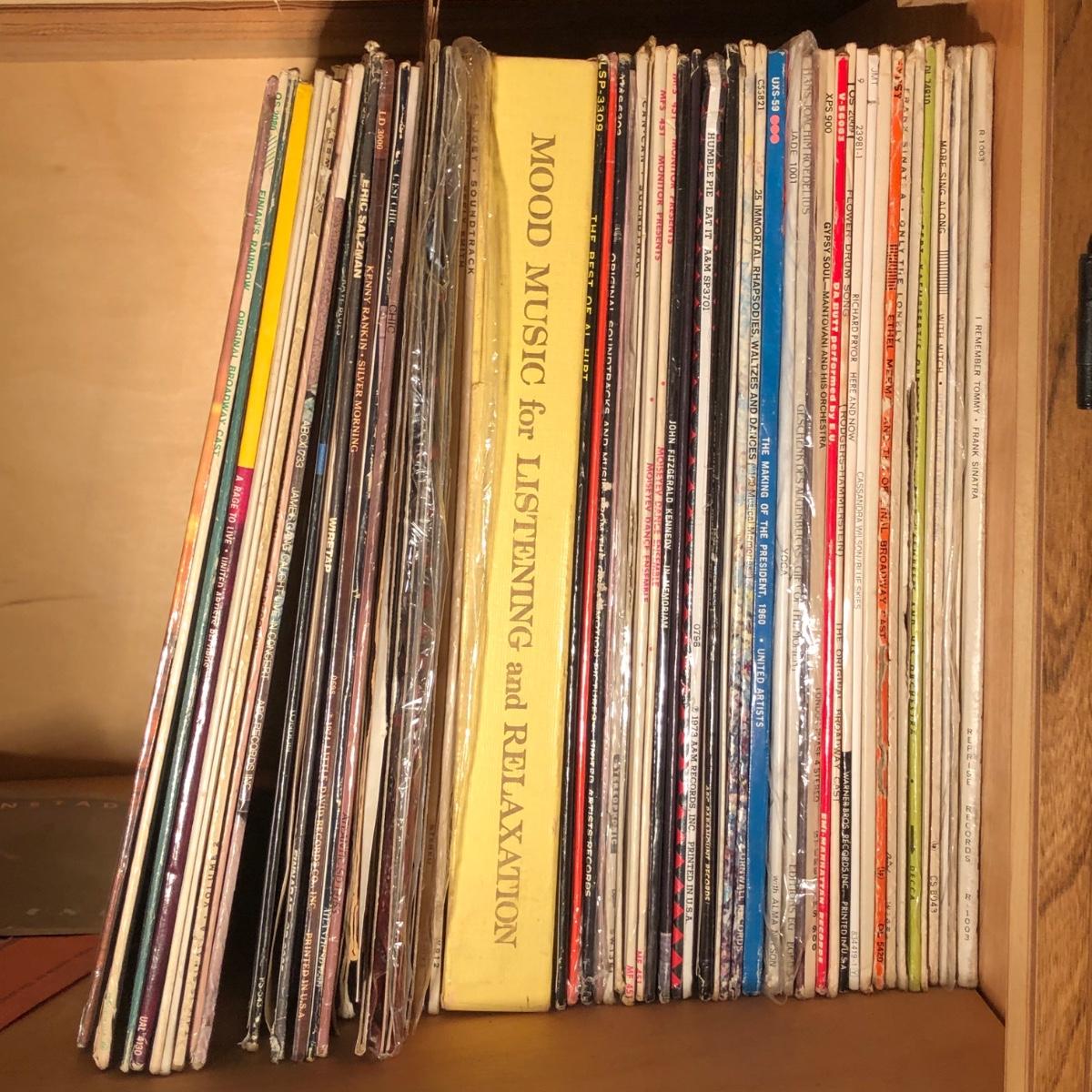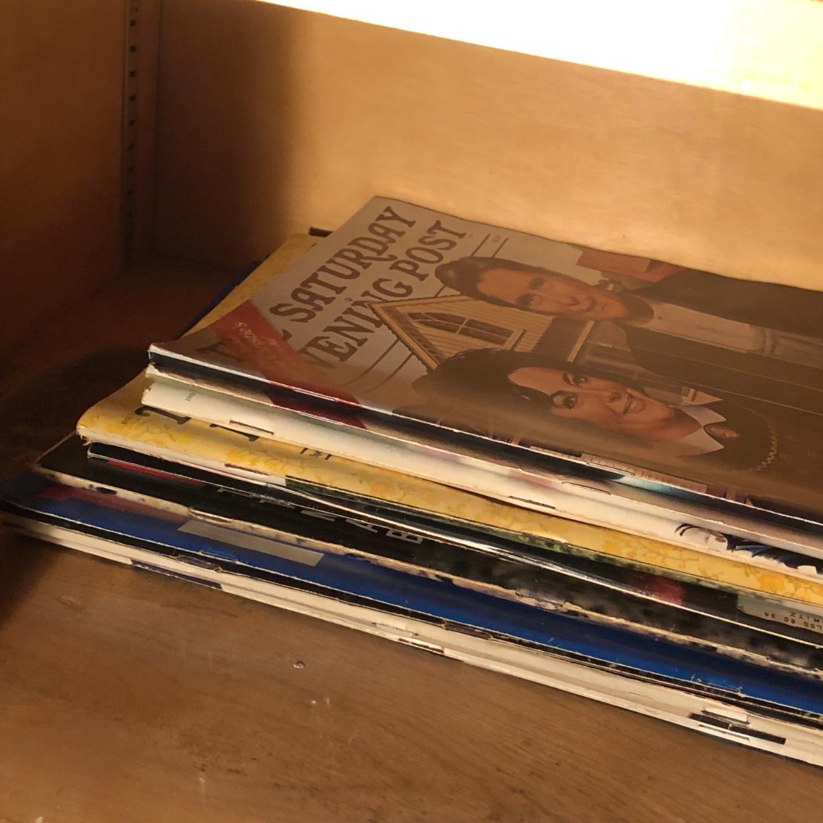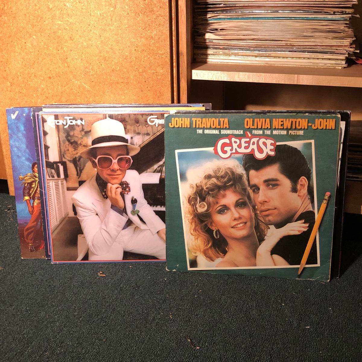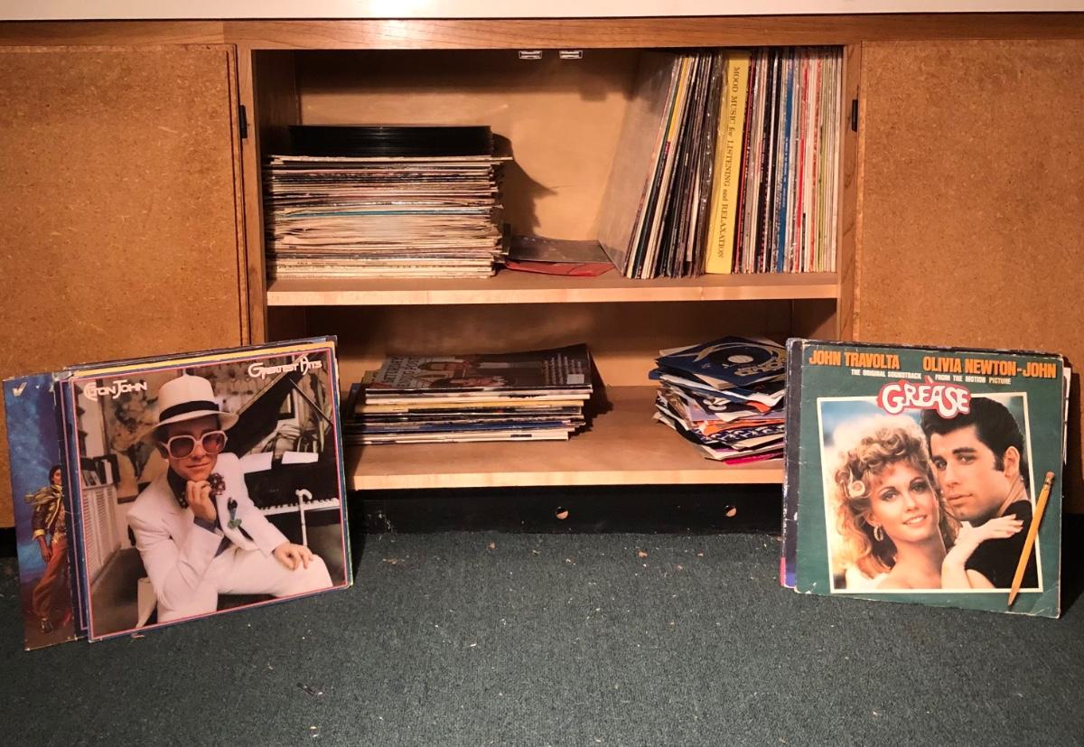 Grease soundtrack & Elton John record are in their sleeves. Records in the cabinet may or may not be present in collection. Stack of records pictured could belong to empty sleeves, but they may not. Includes a small array of magazines.