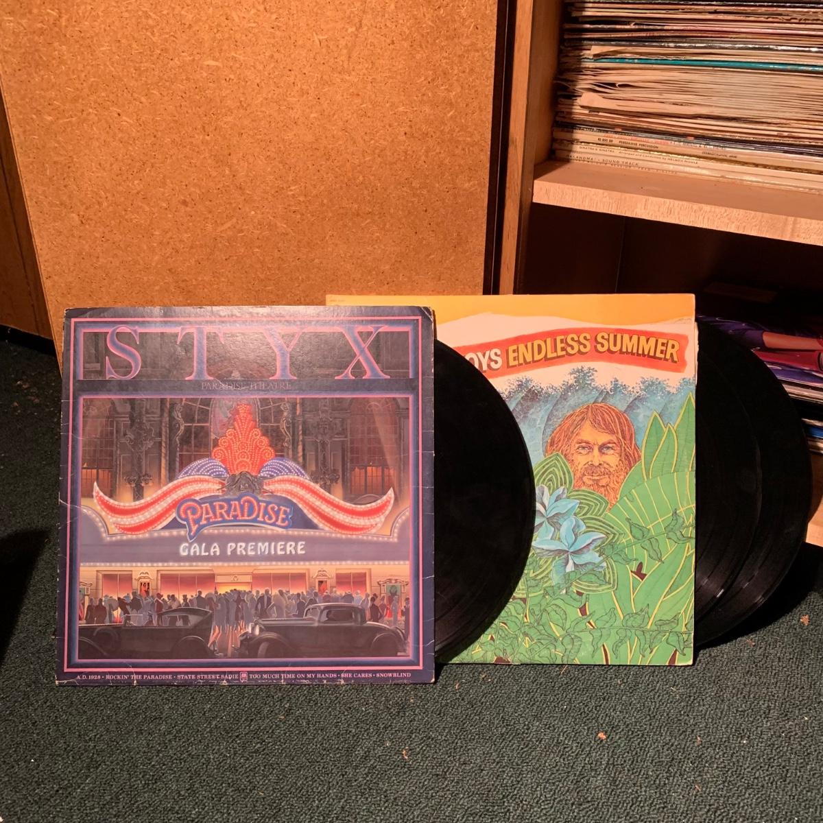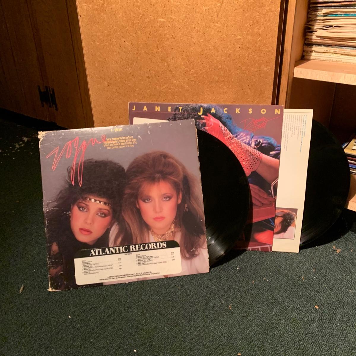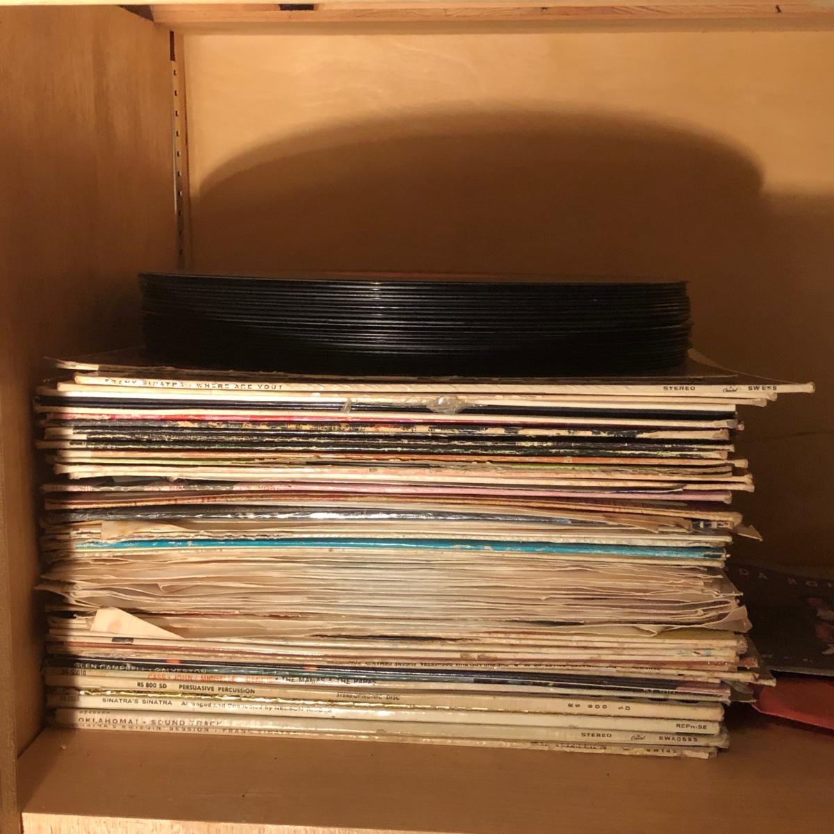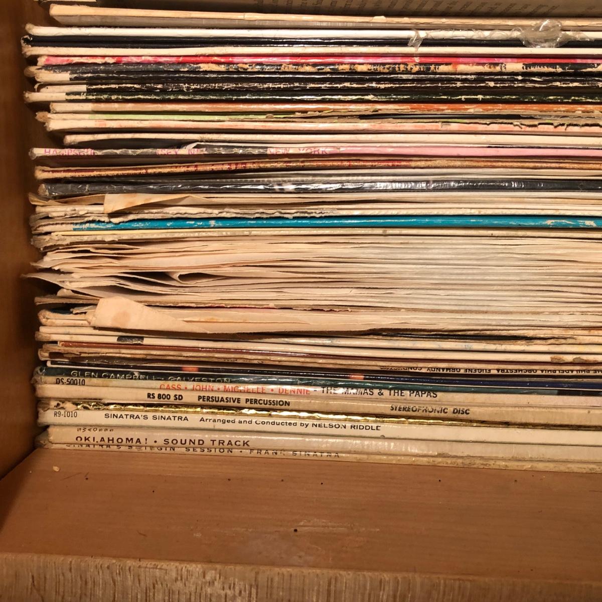 Grease soundtrack & Elton John record are in their sleeves. Records in the cabinet may or may not be present in collection. Stack of records pictured could belong to empty sleeves, but they may not. Includes a small array of magazines.