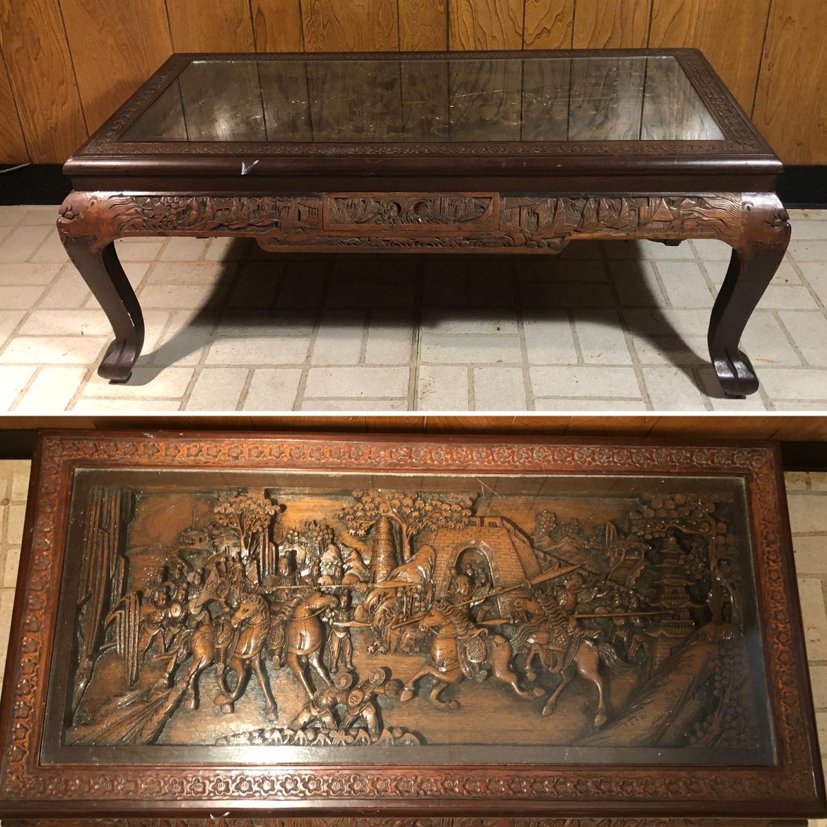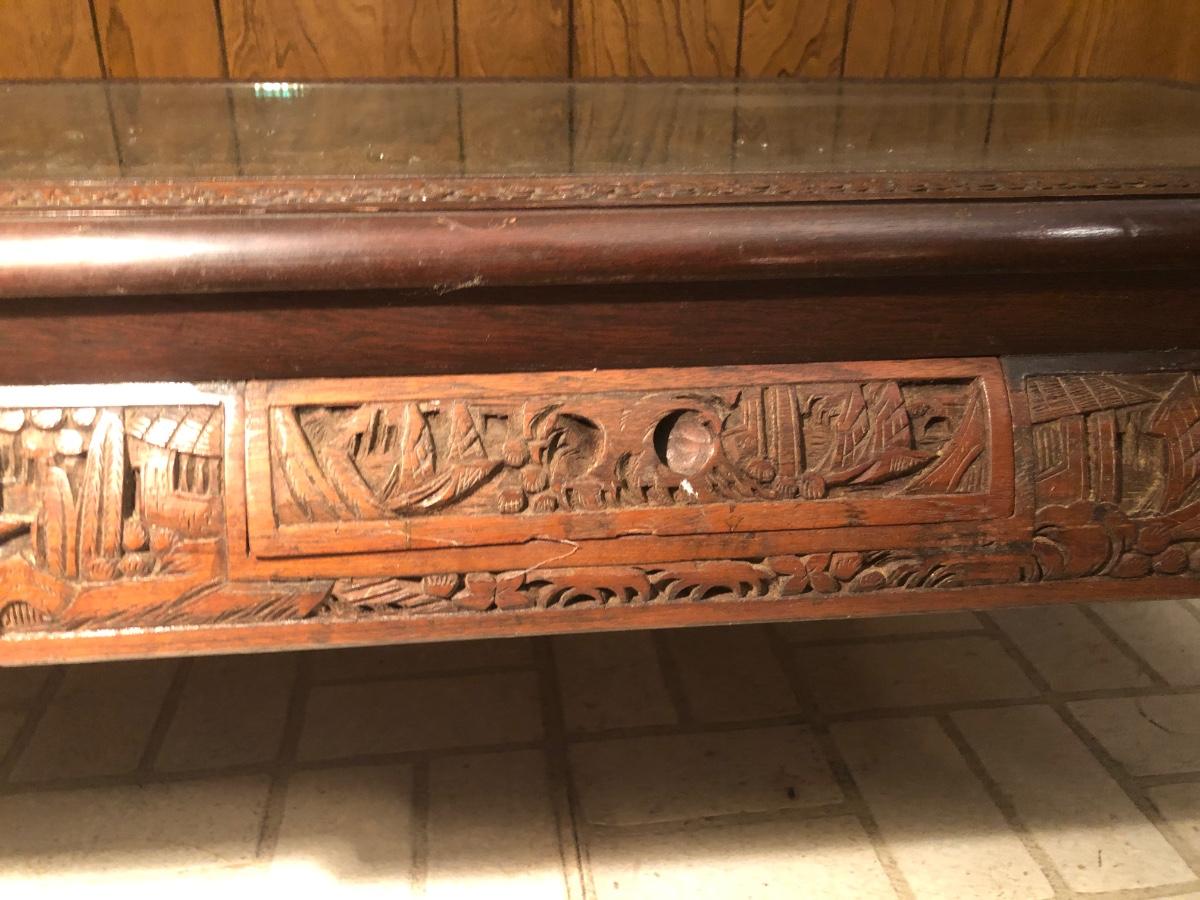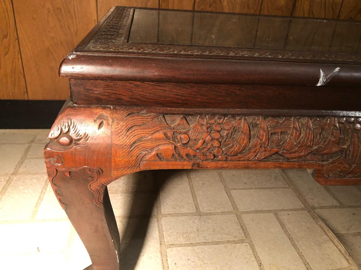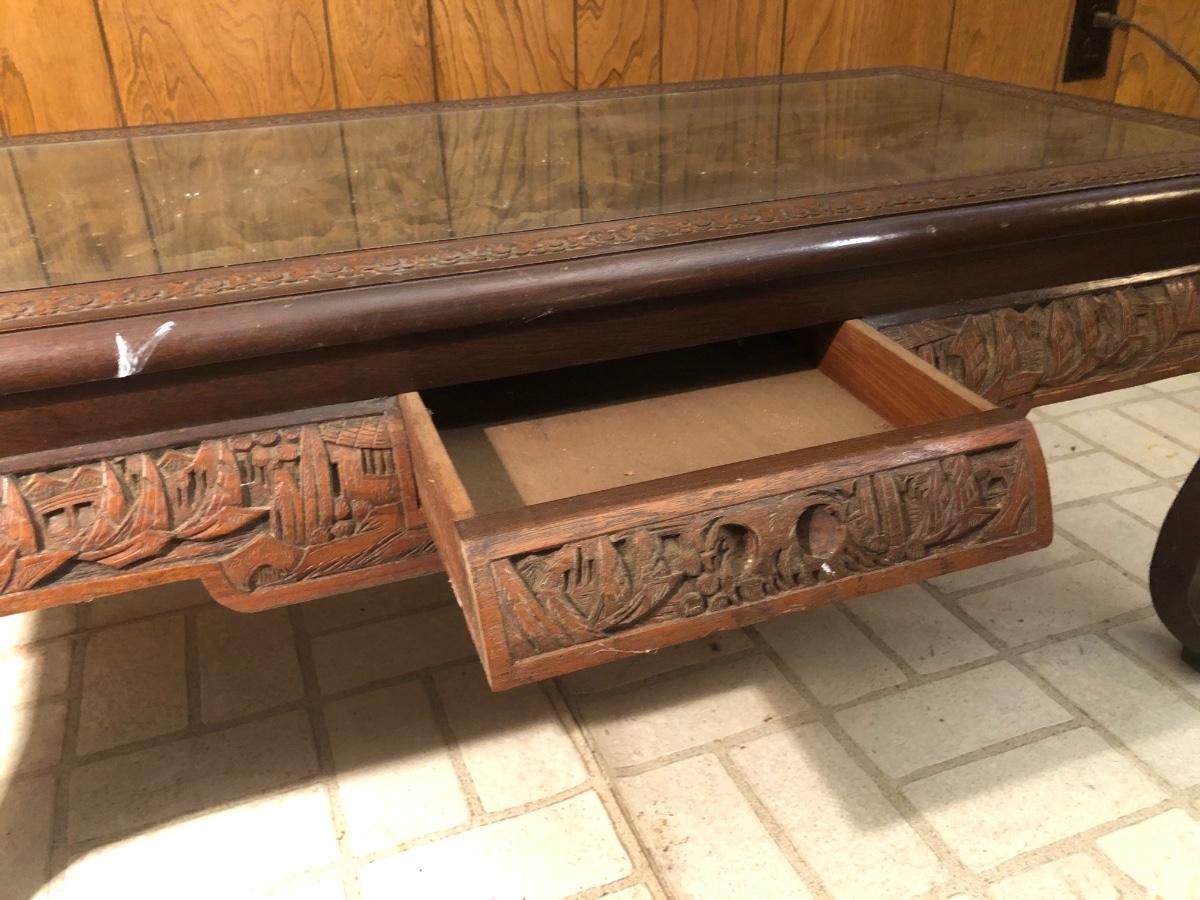 This piece is beautiful, carved on the top and sides with a battle scene and dragons. Glass inlay protects the top carving. There is a small drawer in the front of the table. Table measures 40W x 20D x 17H. There is a small paint mark on the table (see photos).
