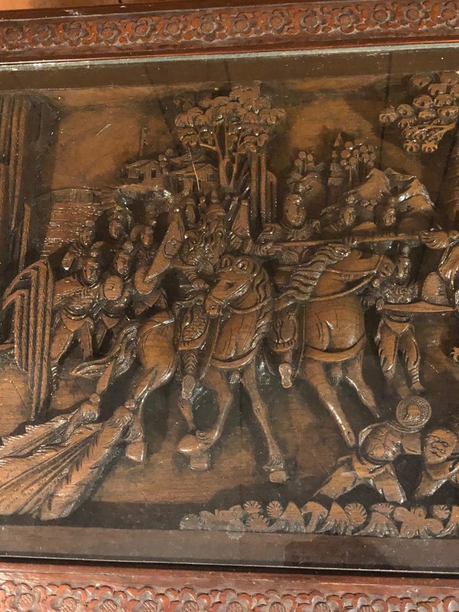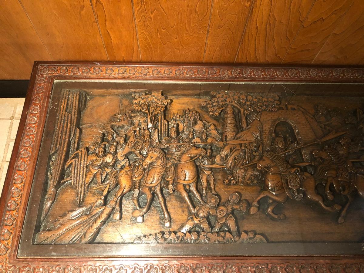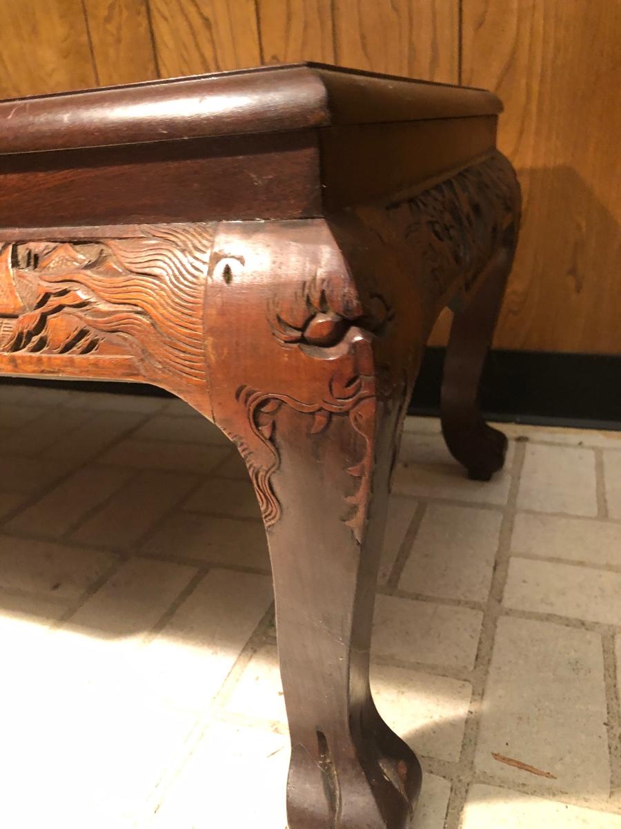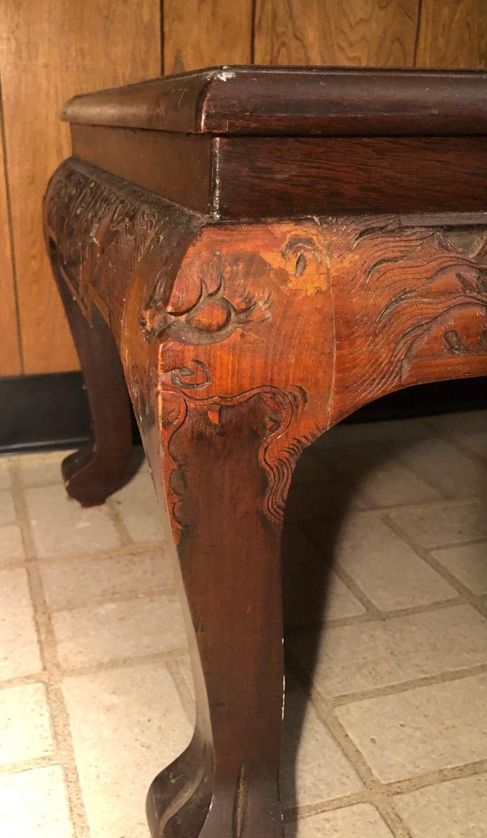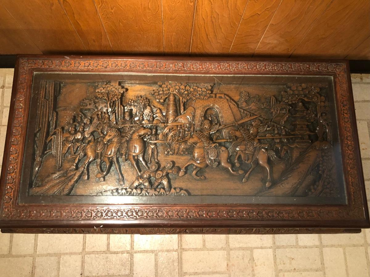 This piece is beautiful, carved on the top and sides with a battle scene and dragons. Glass inlay protects the top carving. There is a small drawer in the front of the table. Table measures 40W x 20D x 17H. There is a small paint mark on the table (see photos).