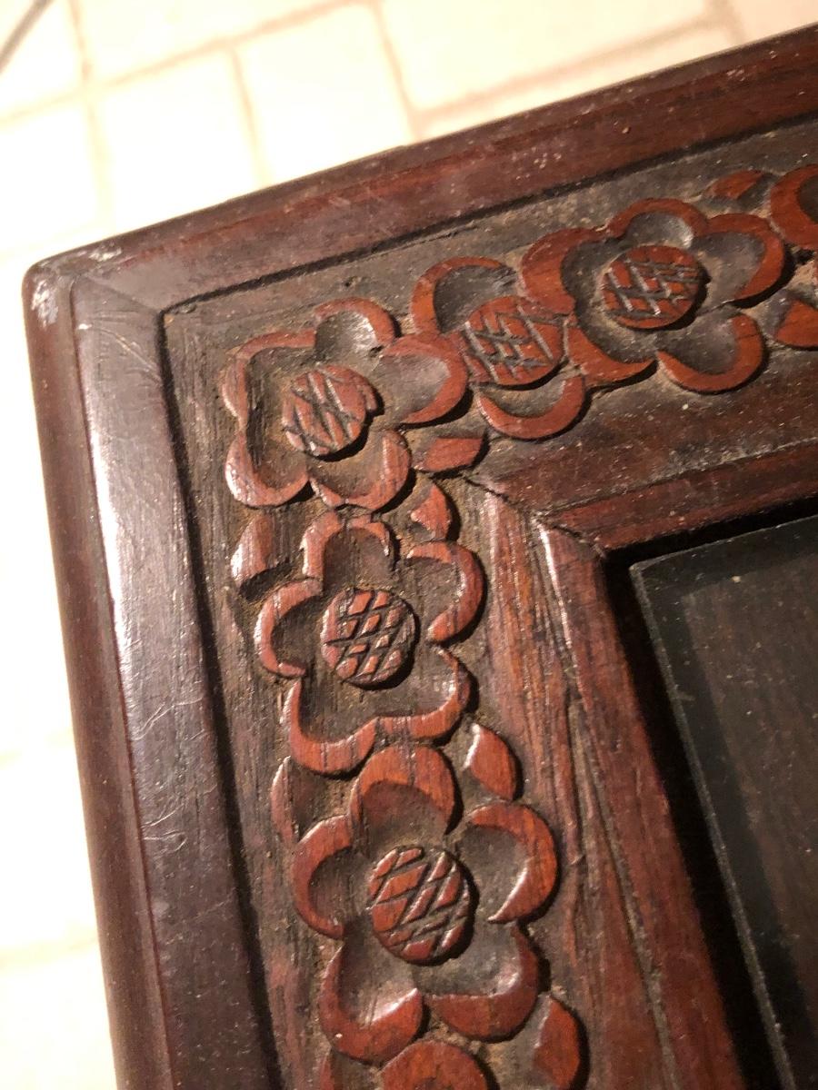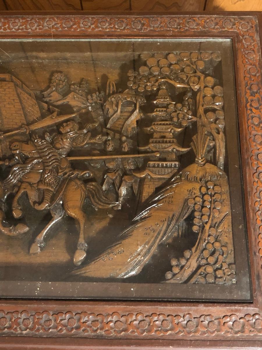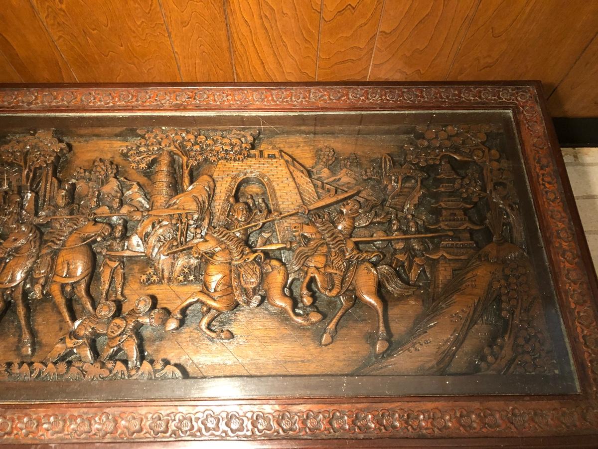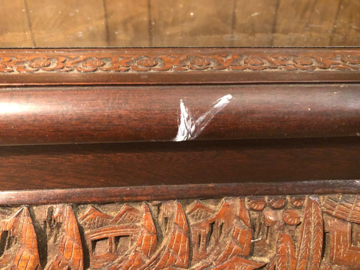 This piece is beautiful, carved on the top and sides with a battle scene and dragons. Glass inlay protects the top carving. There is a small drawer in the front of the table. Table measures 40W x 20D x 17H. There is a small paint mark on the table (see photos).