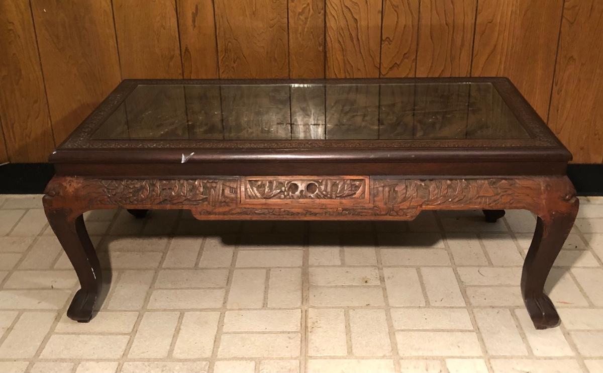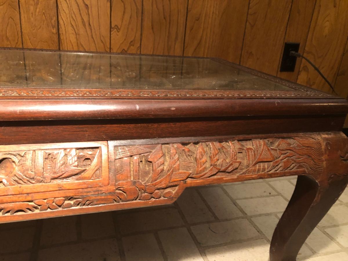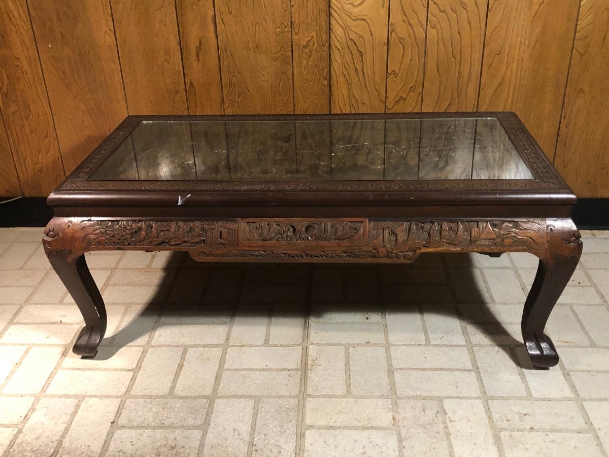 LOT 193M: Intricately Carved Wooden Coffee Table w/ Glass Cover