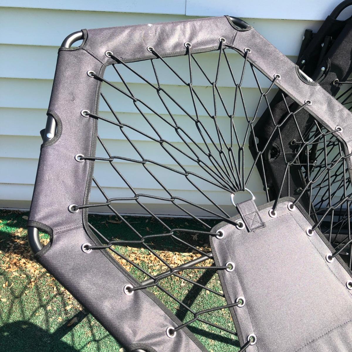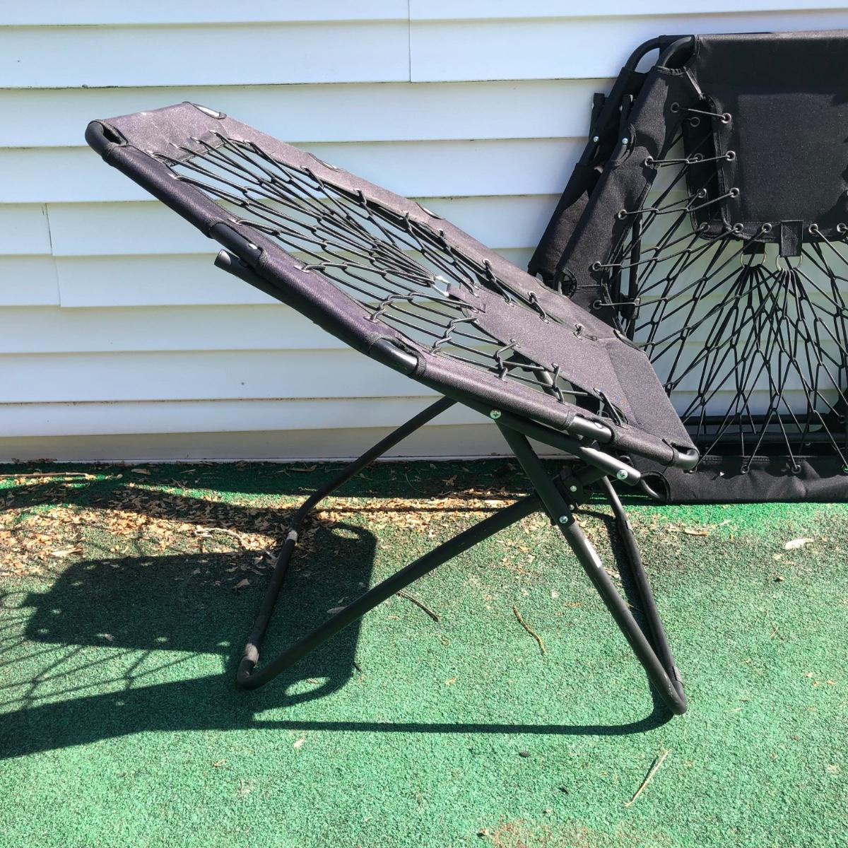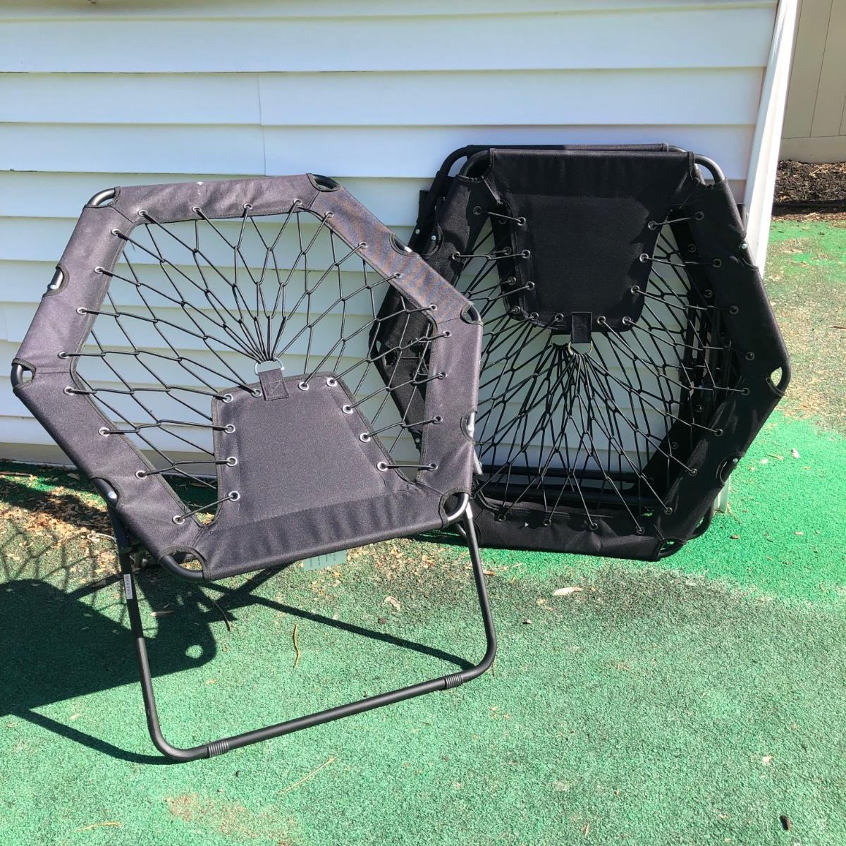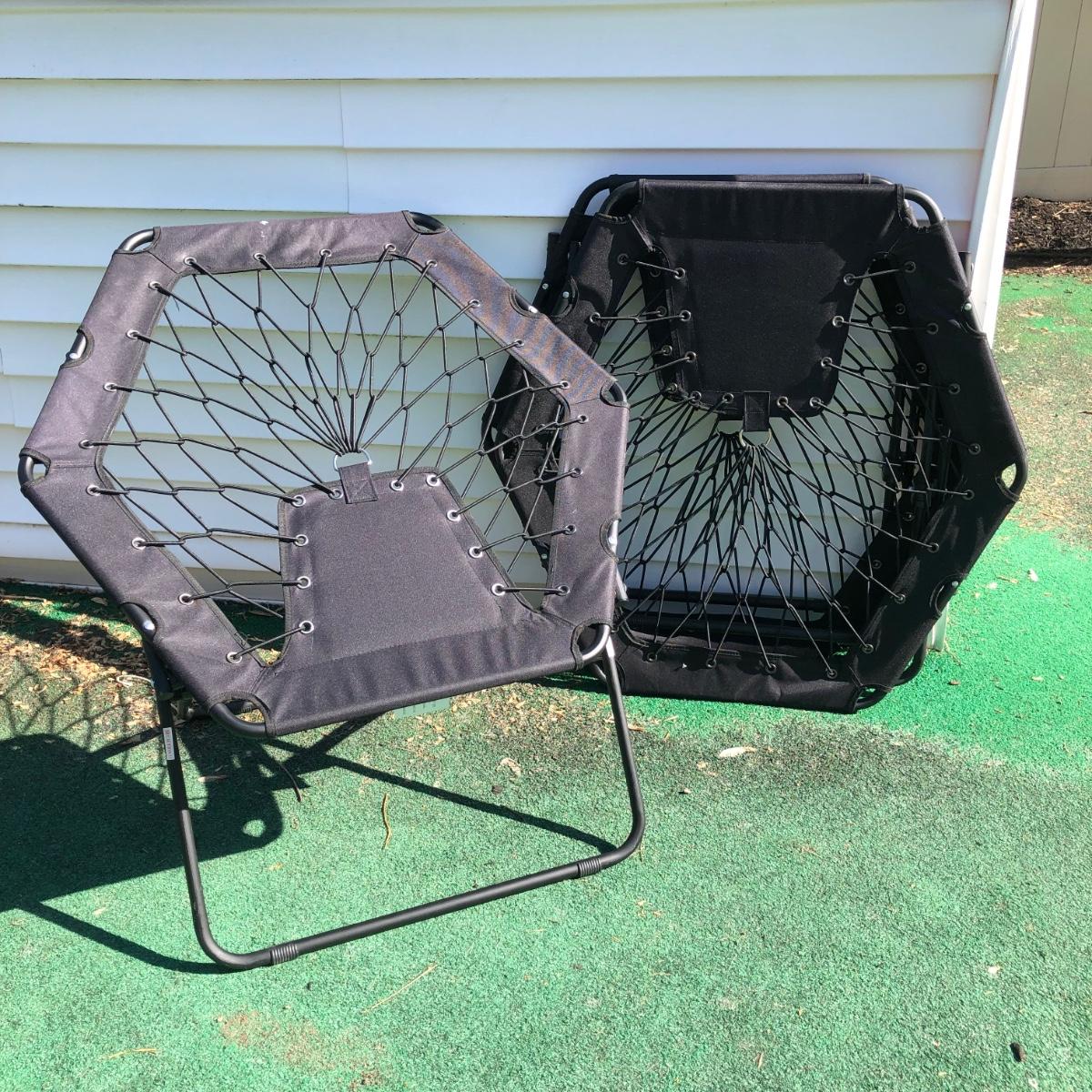 The chairs are foldable and great for a patio or rec room. They are made of a bungee like material and have padding on the seat of the chair. Three included in the set.