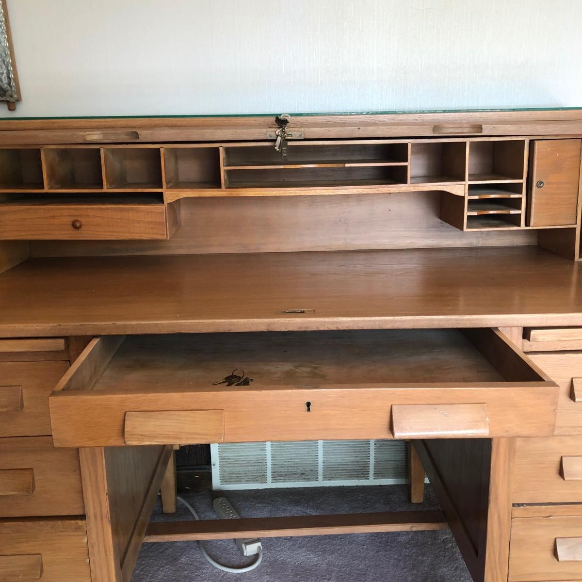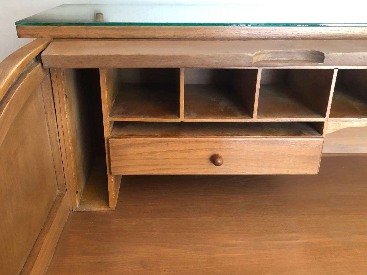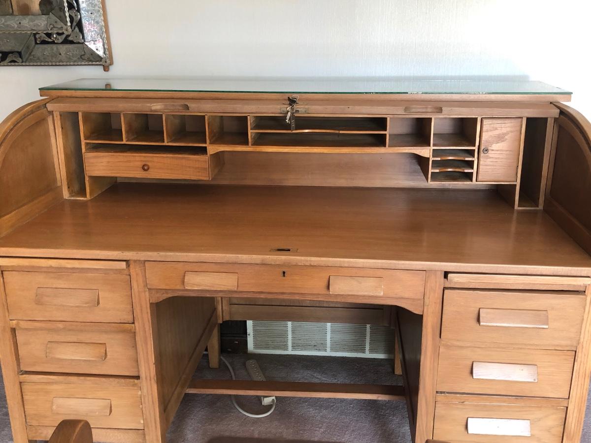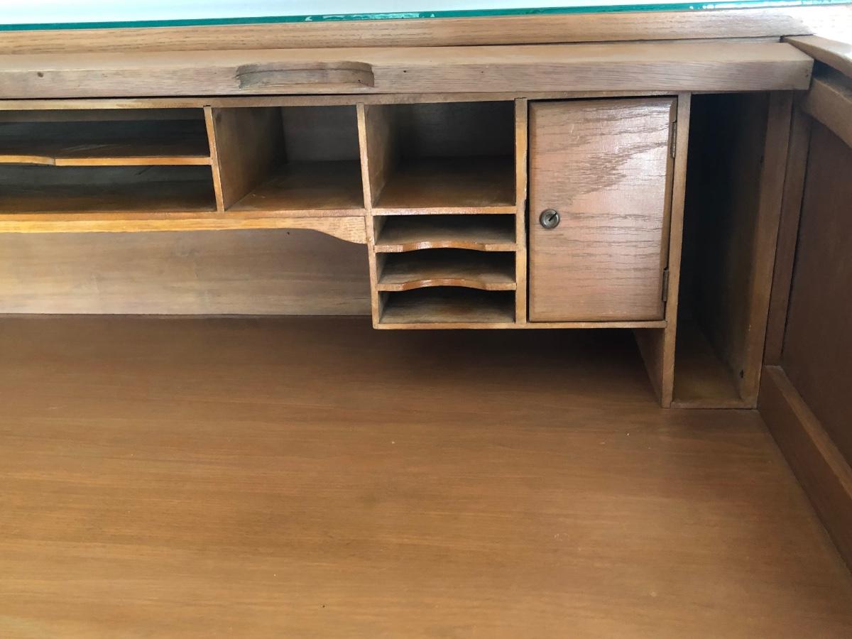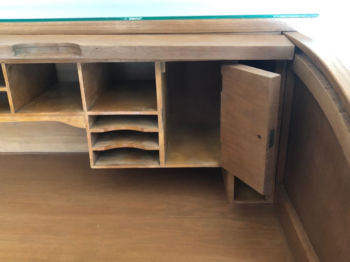 This desk has shelves and storage behind the roll-top and six side drawers with a seventh pull out in the middle. Desk includes keys to lock and unlock the roll top. Chair has condition issues with a broken leg support. Desk measures 60W x 30D x 42H. Chair measures 22W x 17D x 33H.