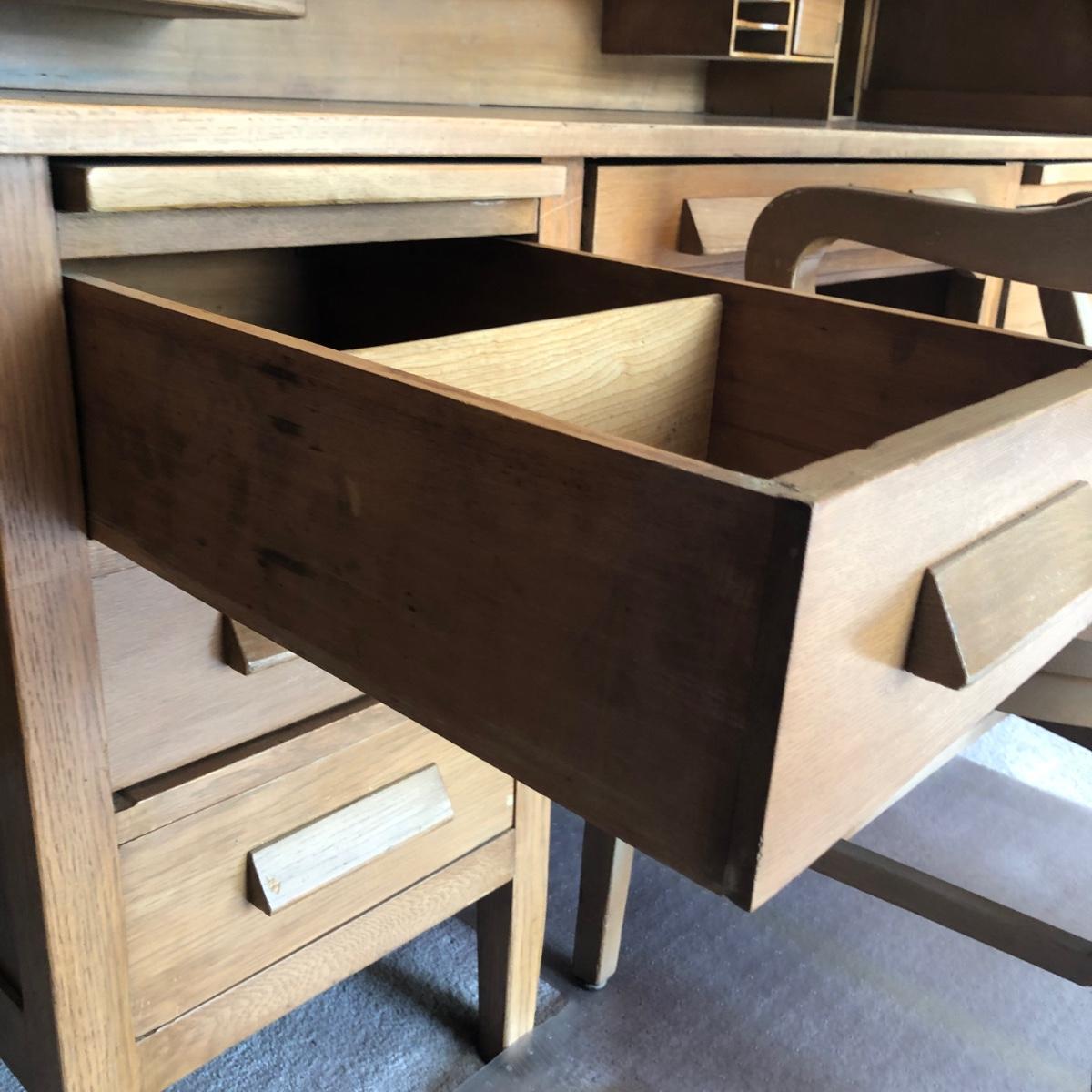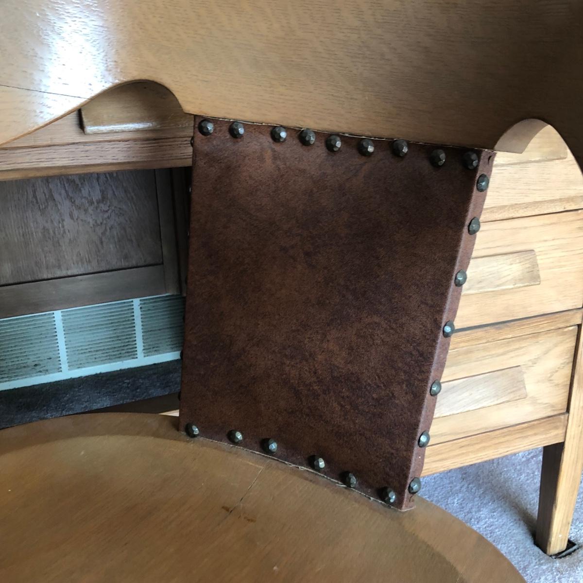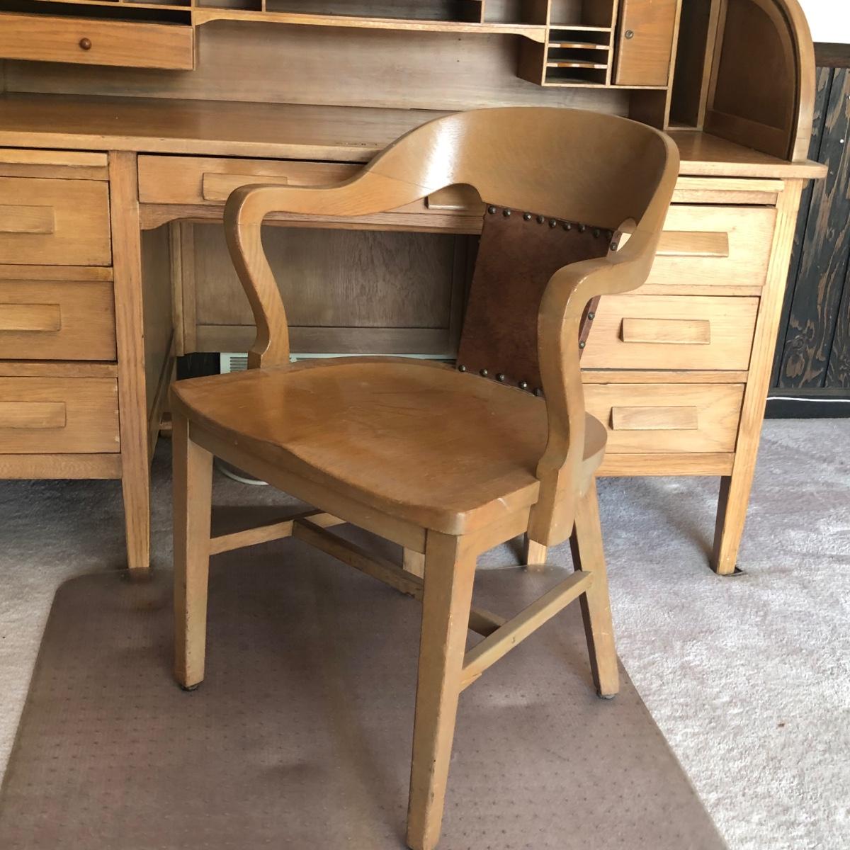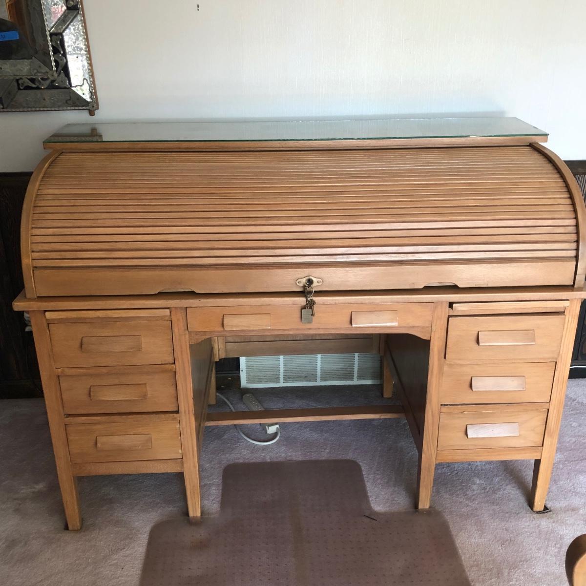 This desk has shelves and storage behind the roll-top and six side drawers with a seventh pull out in the middle. Desk includes keys to lock and unlock the roll top. Chair has condition issues with a broken leg support. Desk measures 60W x 30D x 42H. Chair measures 22W x 17D x 33H.