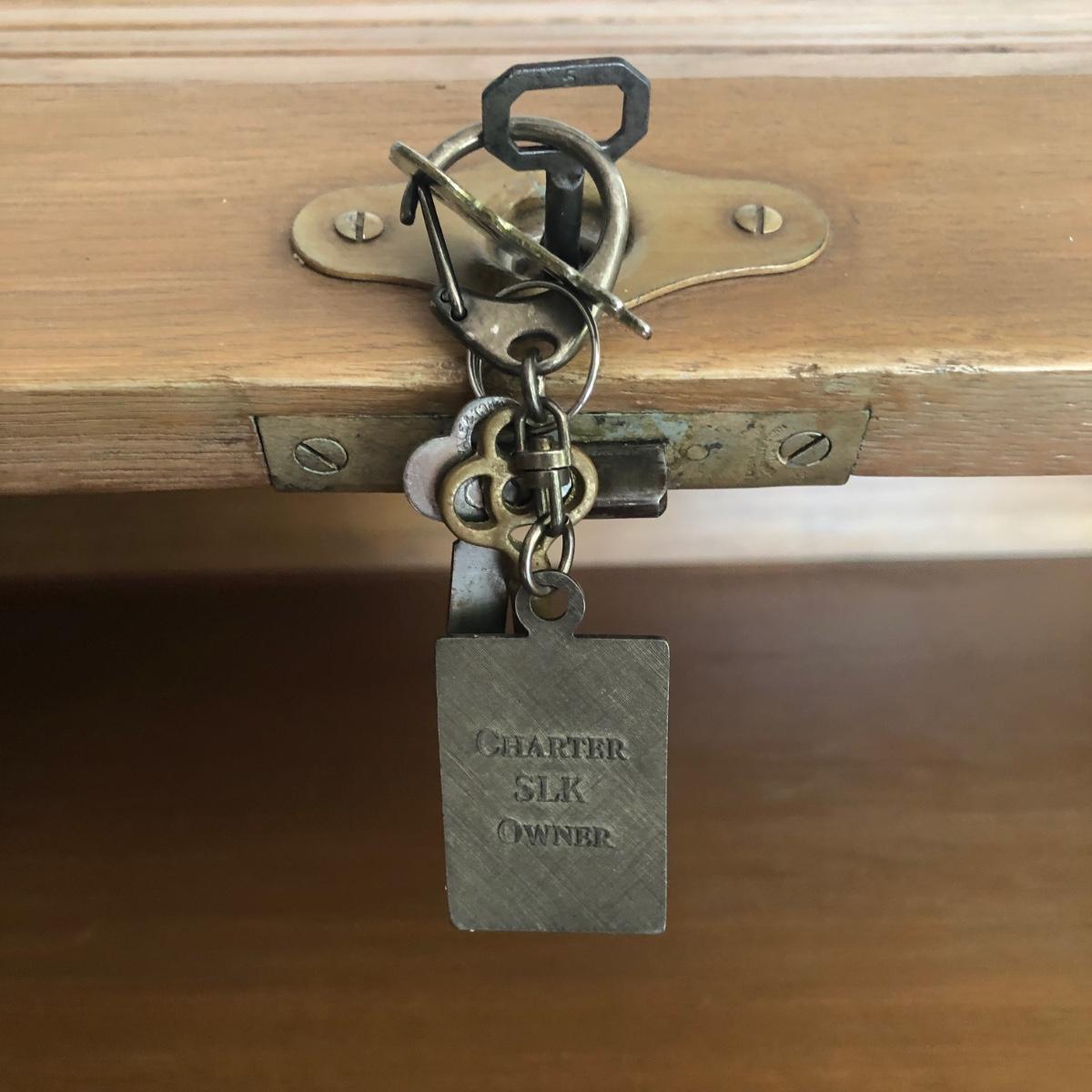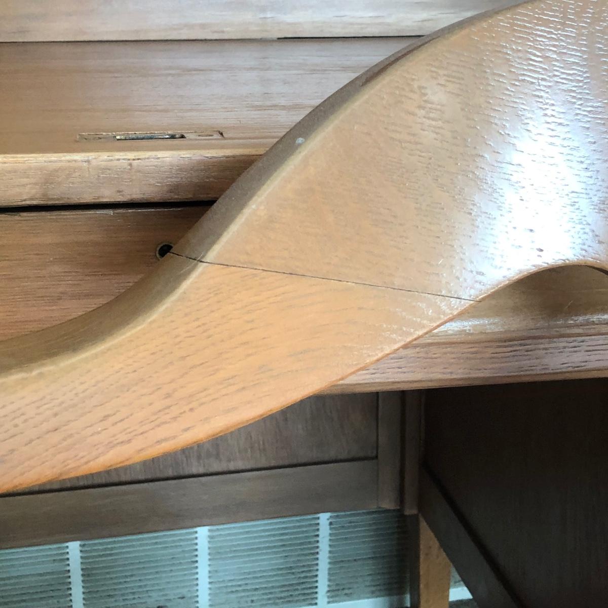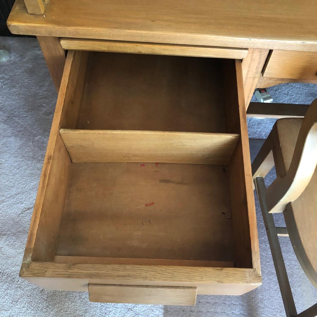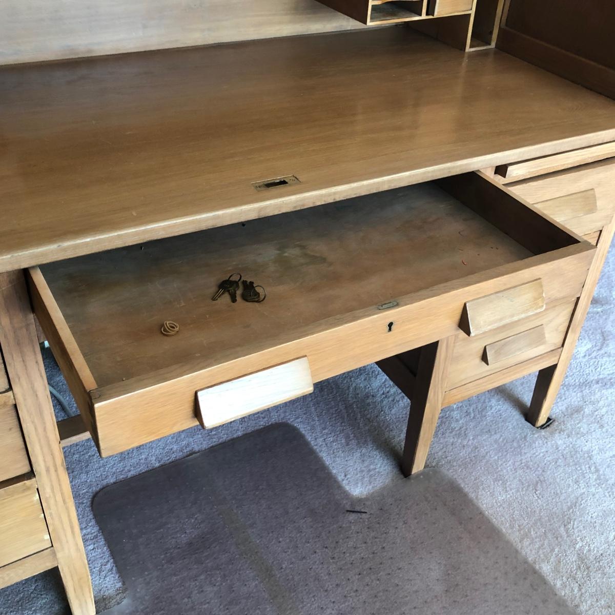 This desk has shelves and storage behind the roll-top and six side drawers with a seventh pull out in the middle. Desk includes keys to lock and unlock the roll top. Chair has condition issues with a broken leg support. Desk measures 60W x 30D x 42H. Chair measures 22W x 17D x 33H.