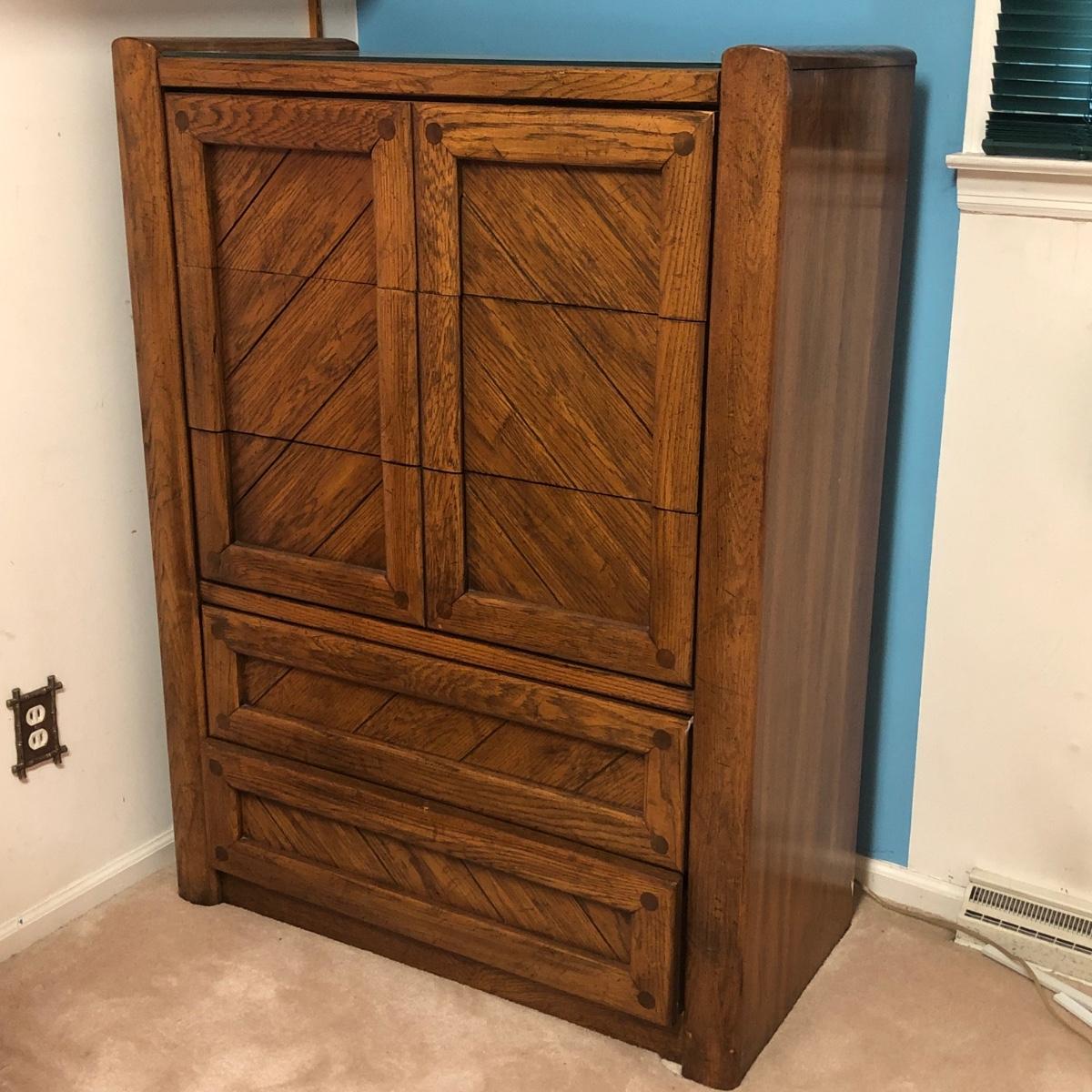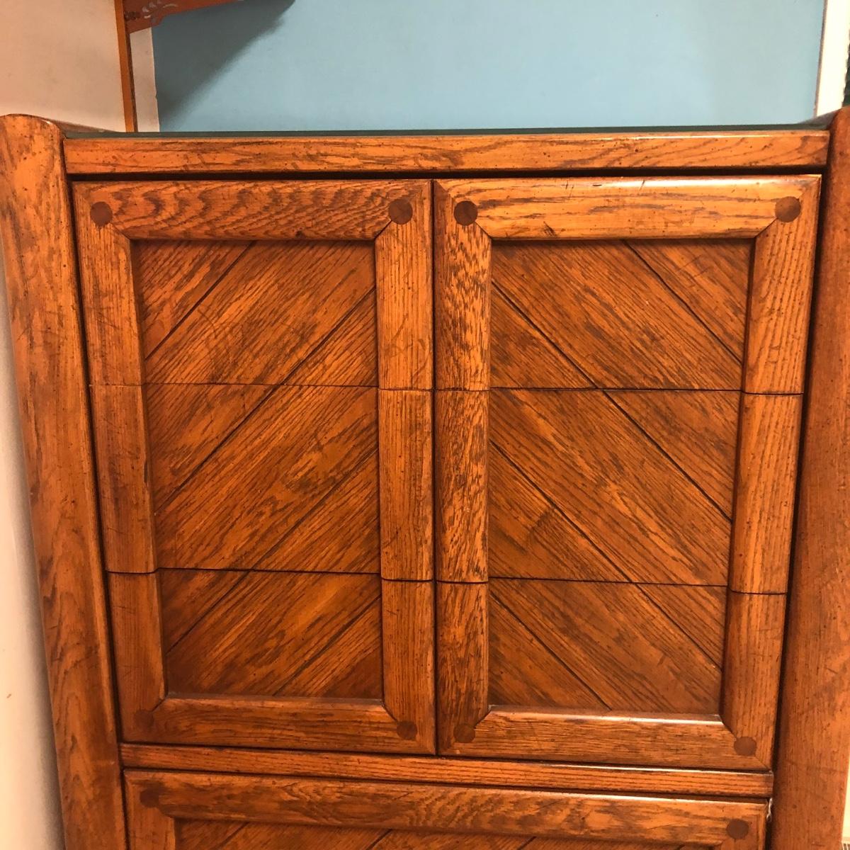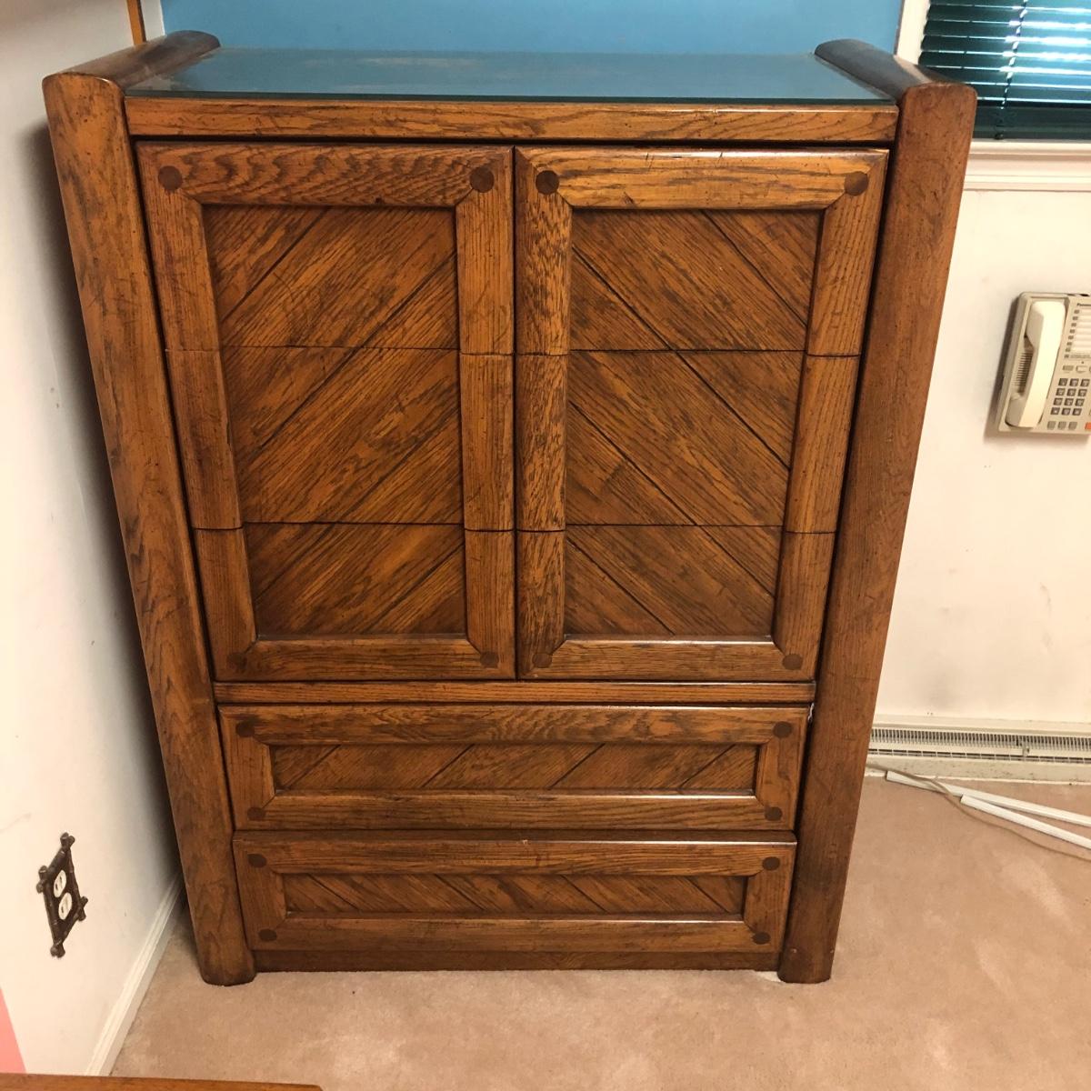 Dresser has a faux door look on the front that breaks into 3 drawers. Includes a glass cover for the top of the dresser. Measures 38W x 18D x 51H.