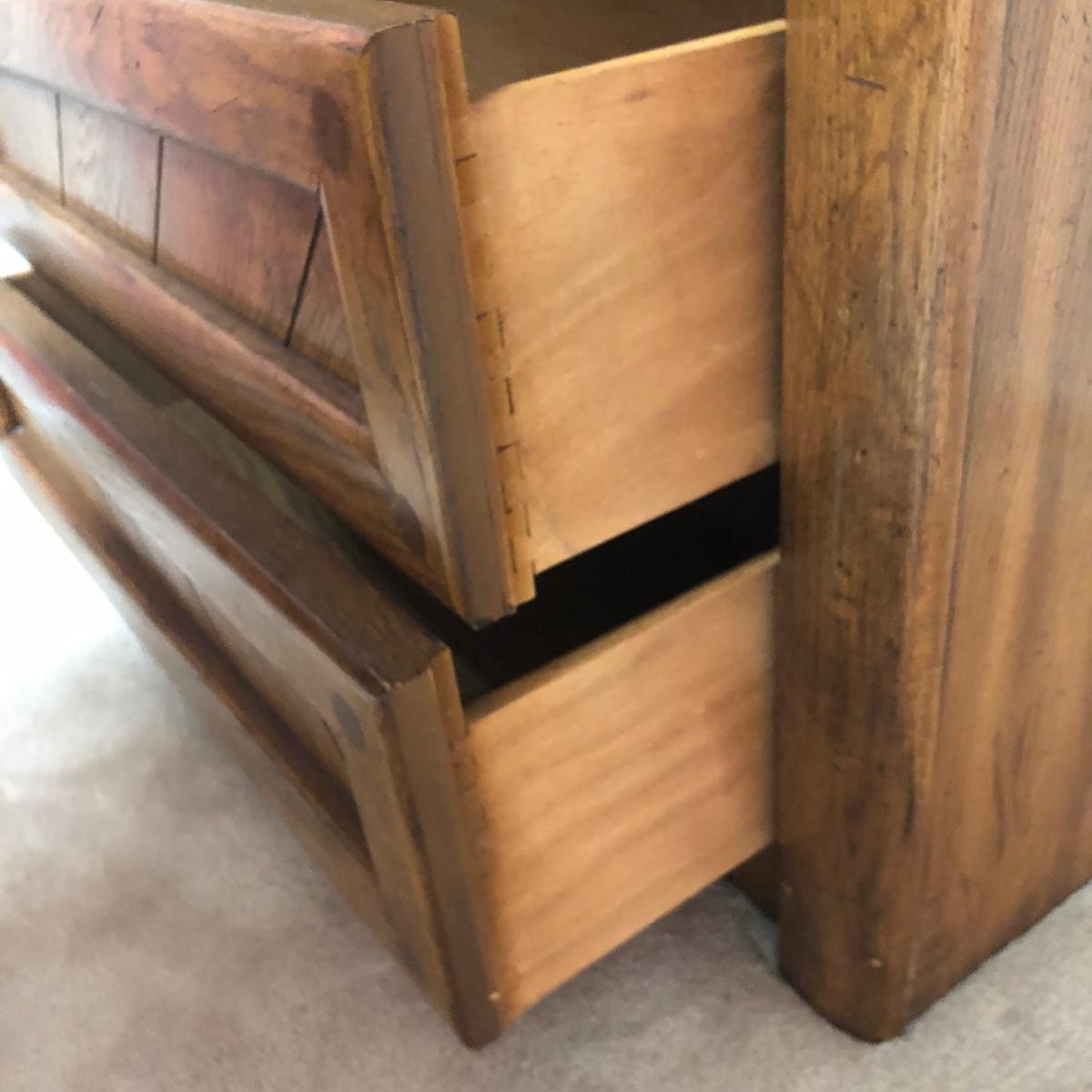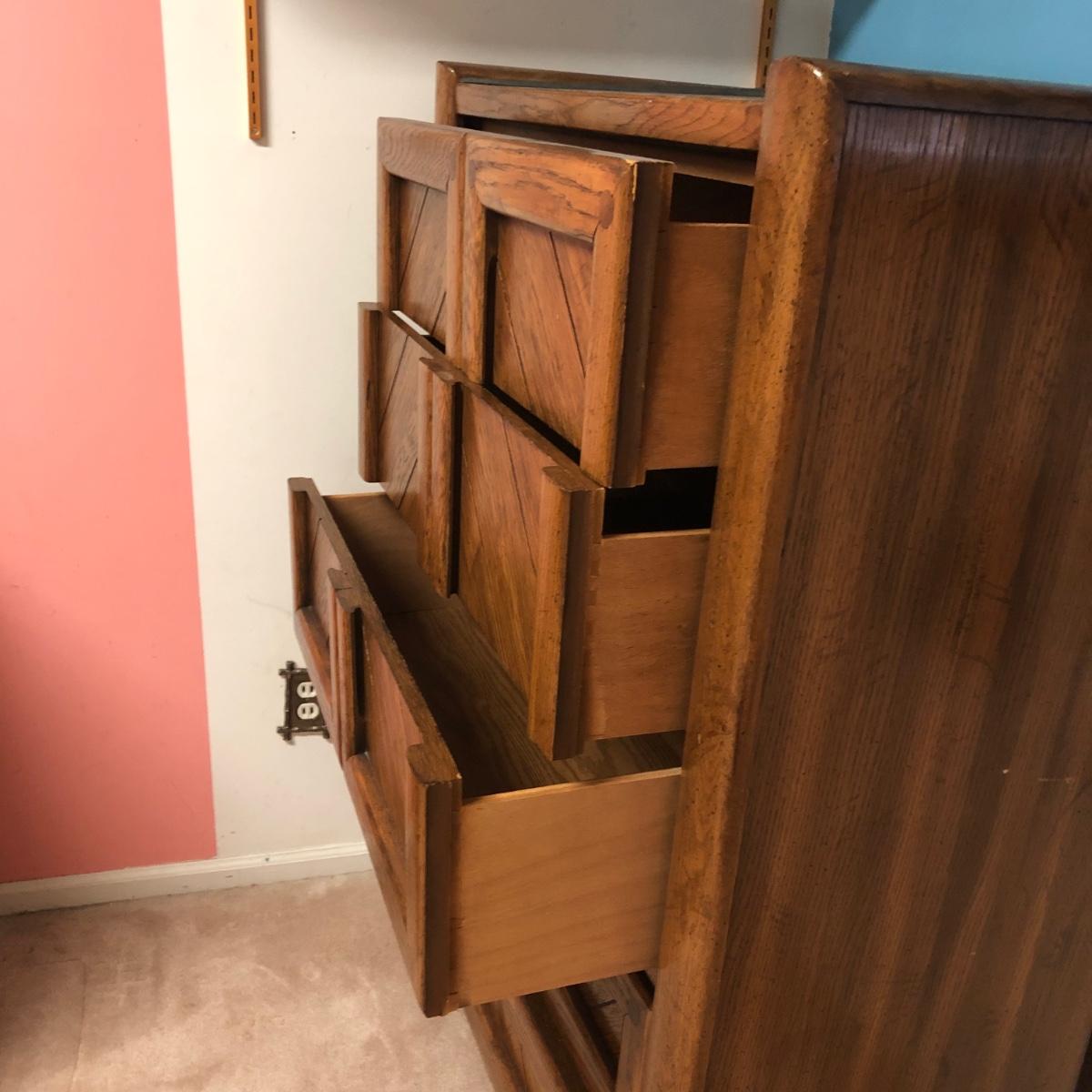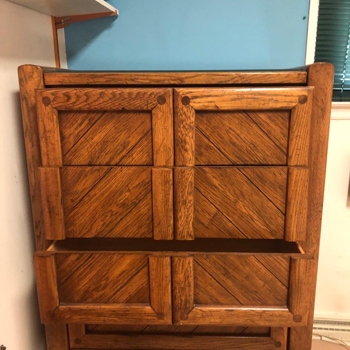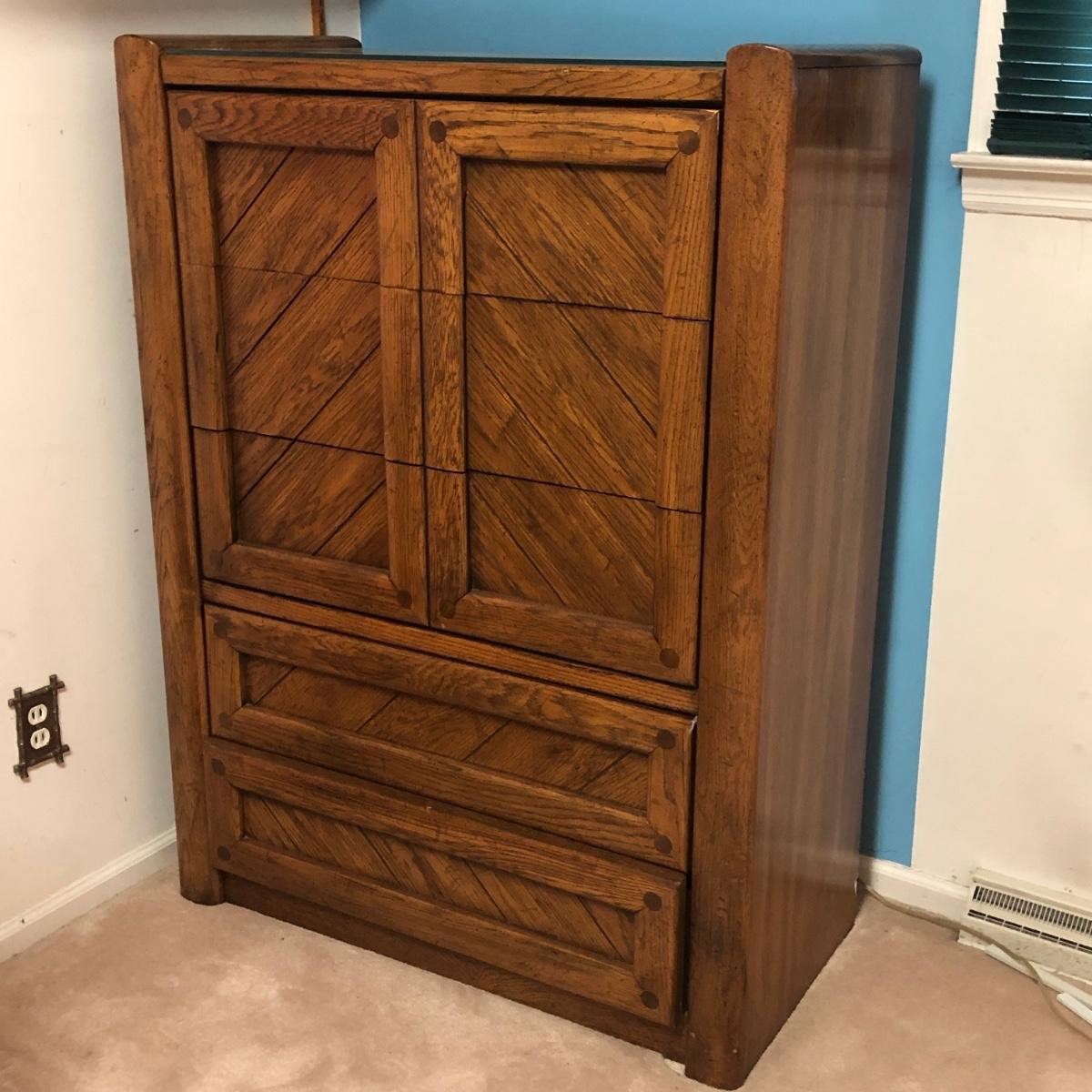Dresser has a faux door look on the front that breaks into 3 drawers. Includes a glass cover for the top of the dresser. Measures 38W x 18D x 51H.