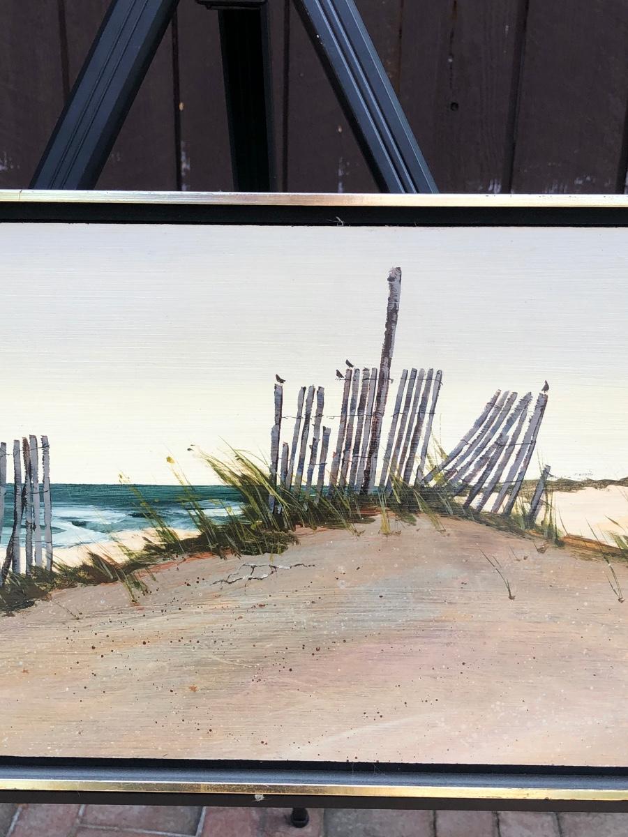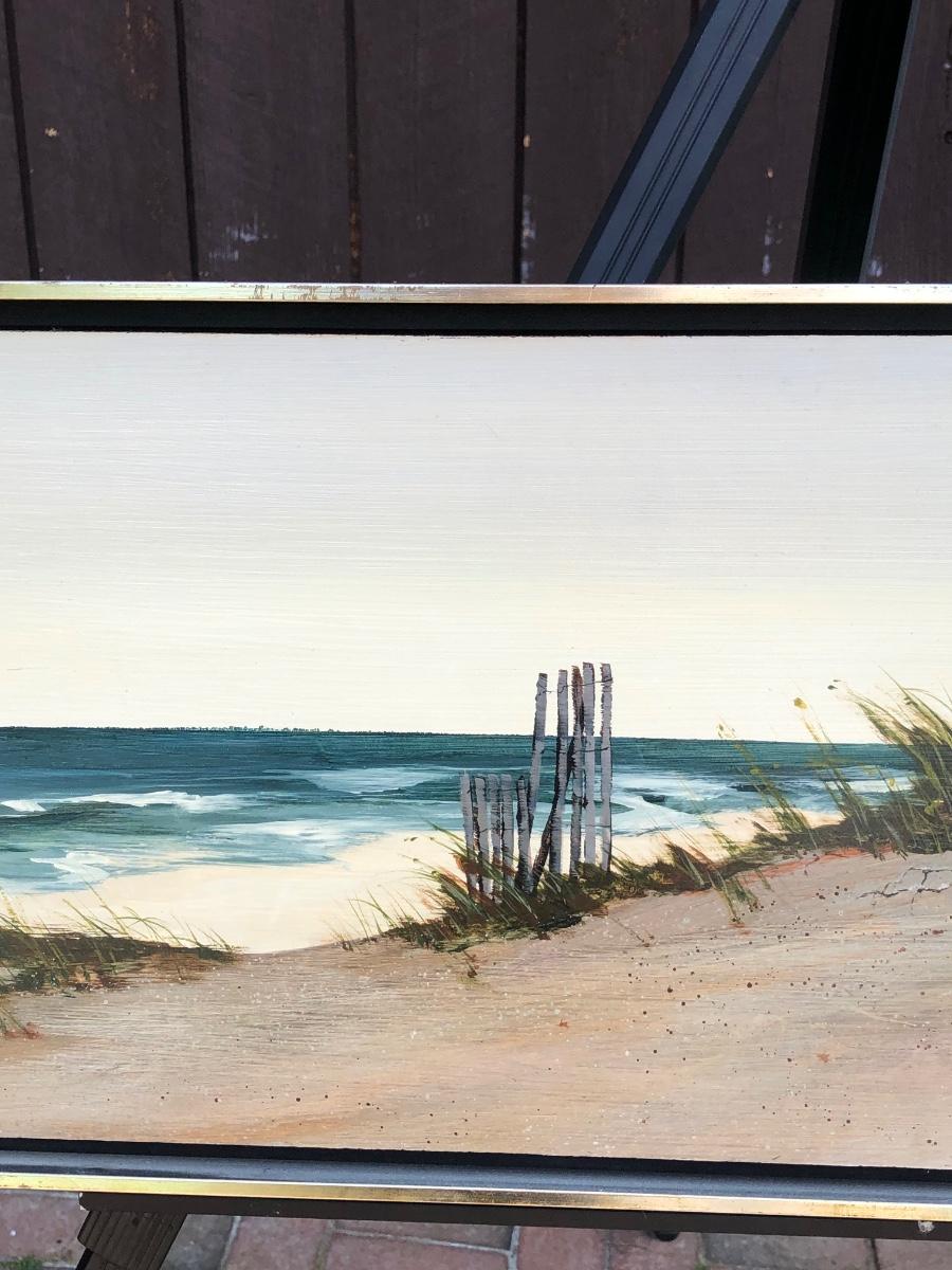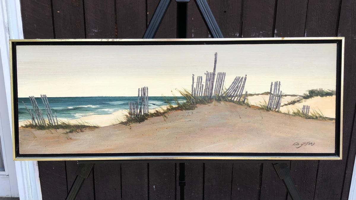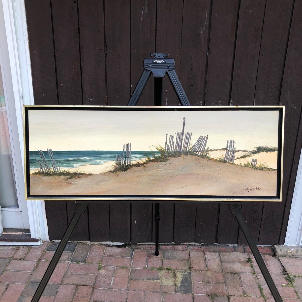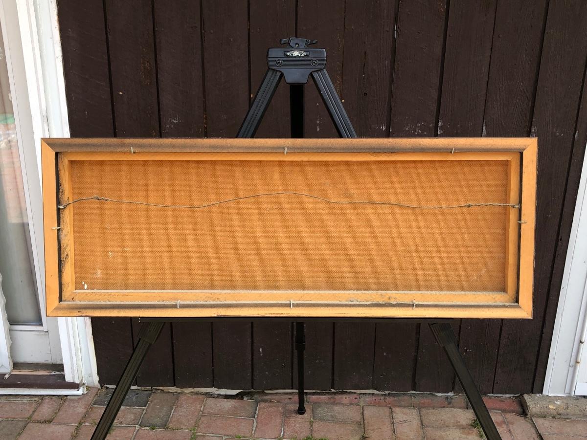 Painting features the artists signature and is mounted in a shadowbox type frame. Measures 30 x 11 inches.