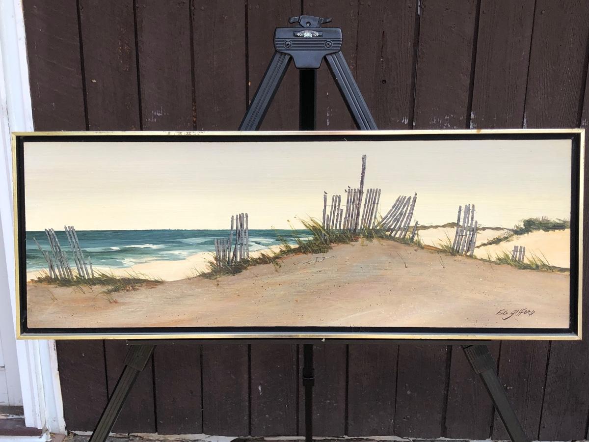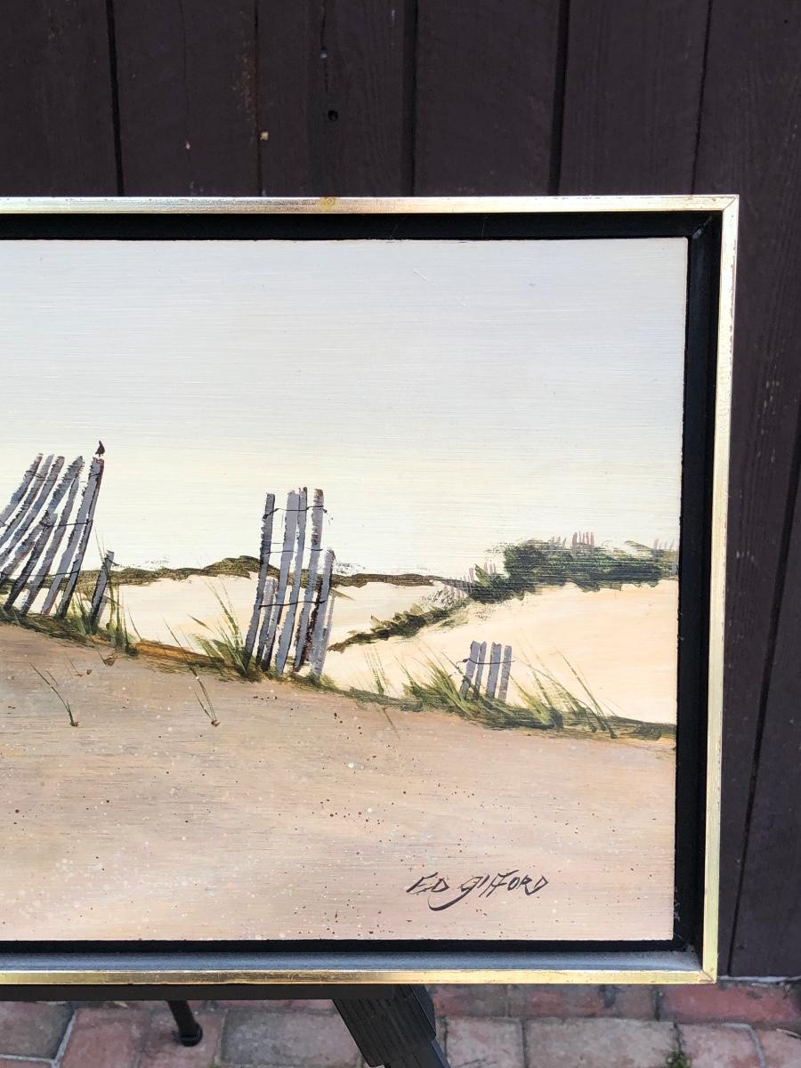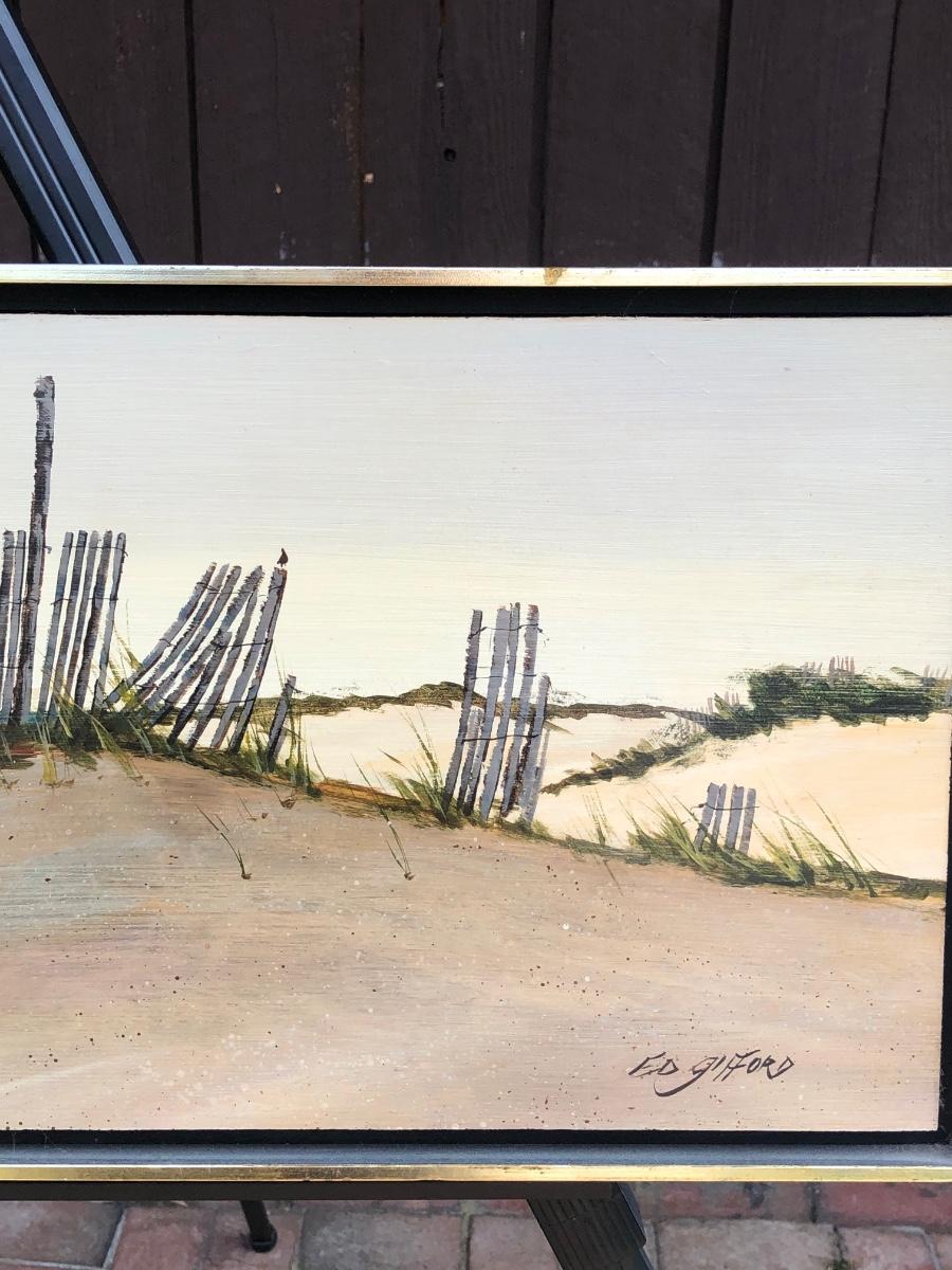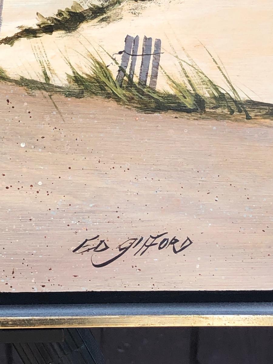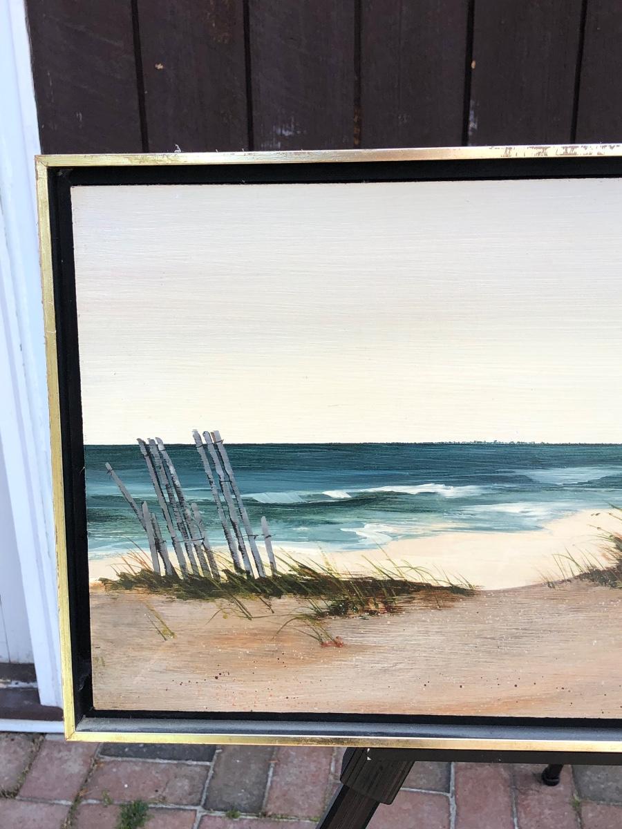 Painting features the artists signature and is mounted in a shadowbox type frame. Measures 30 x 11 inches.