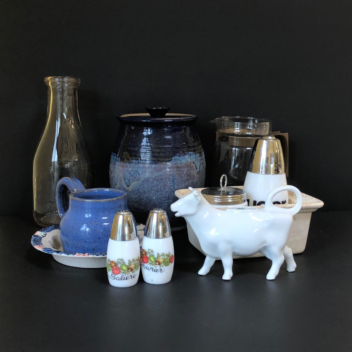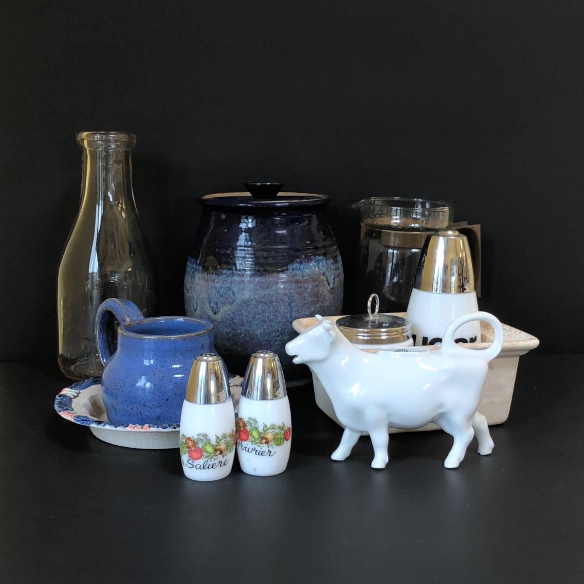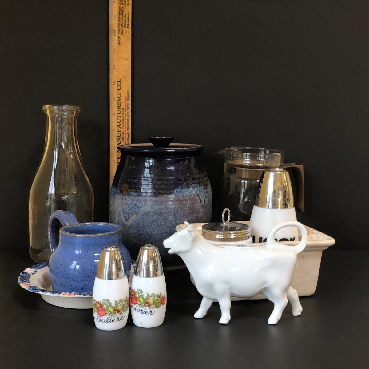 Also includes a small glass pitcher, pottery mug, a lidded stoneware pot, sugar shaker & small lidded dish.