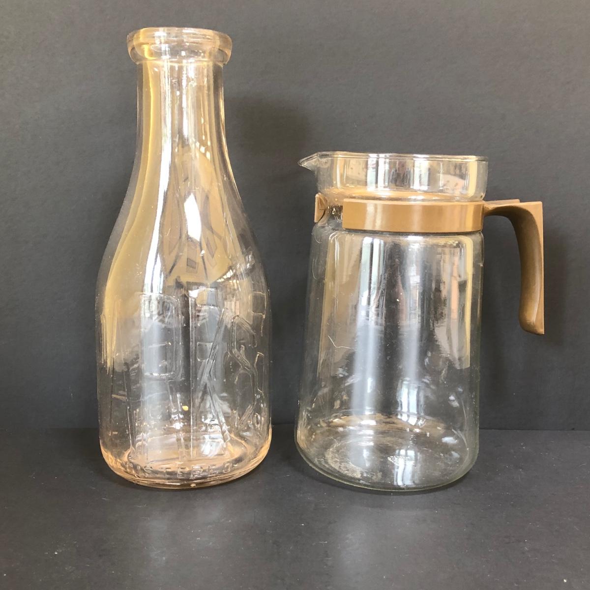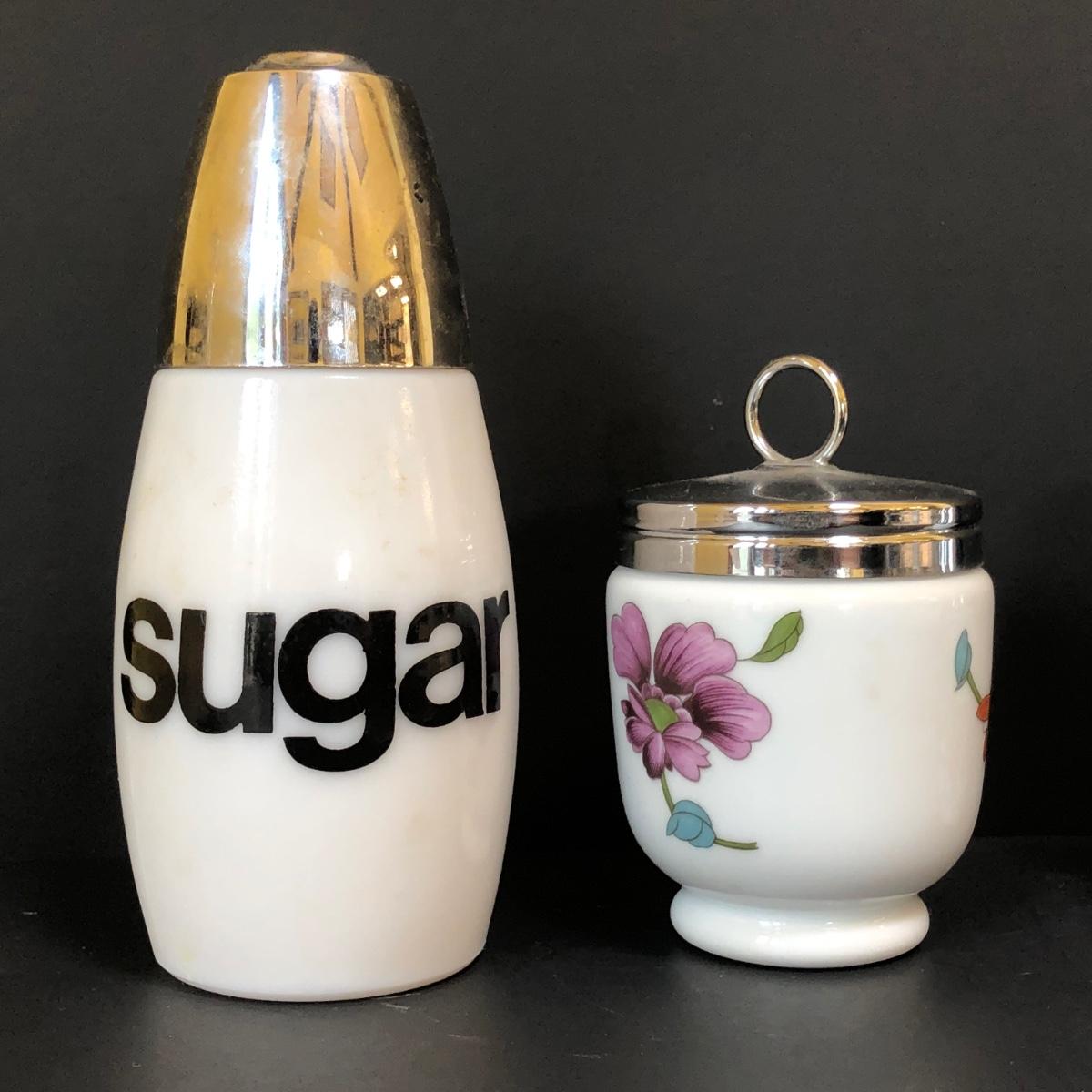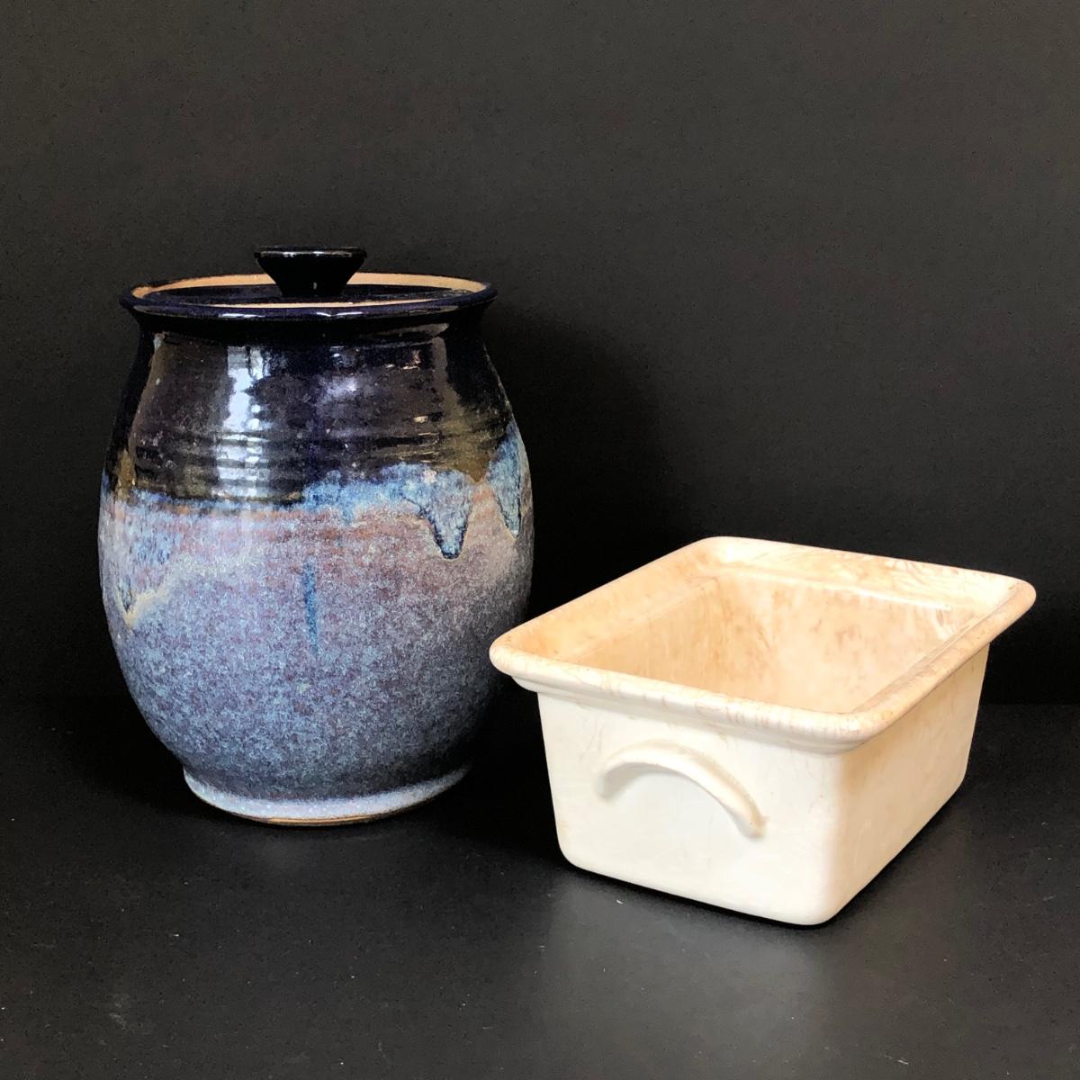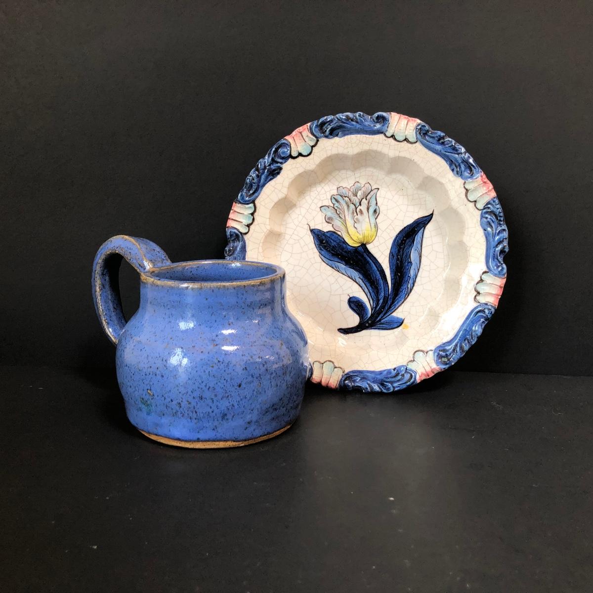 Also includes a small glass pitcher, pottery mug, a lidded stoneware pot, sugar shaker & small lidded dish.