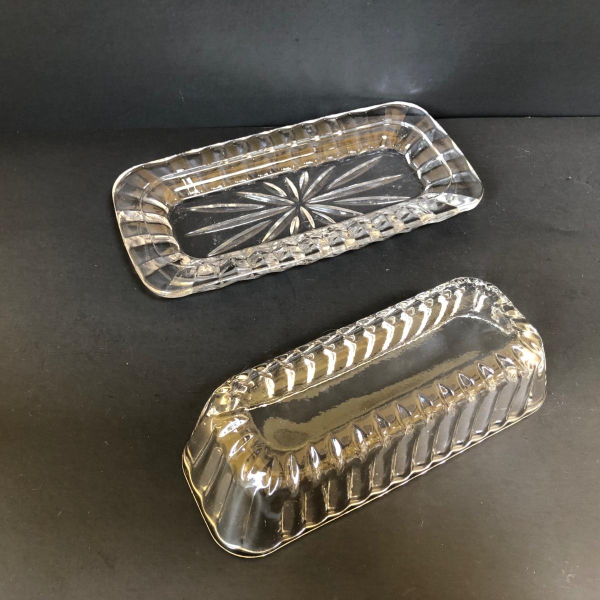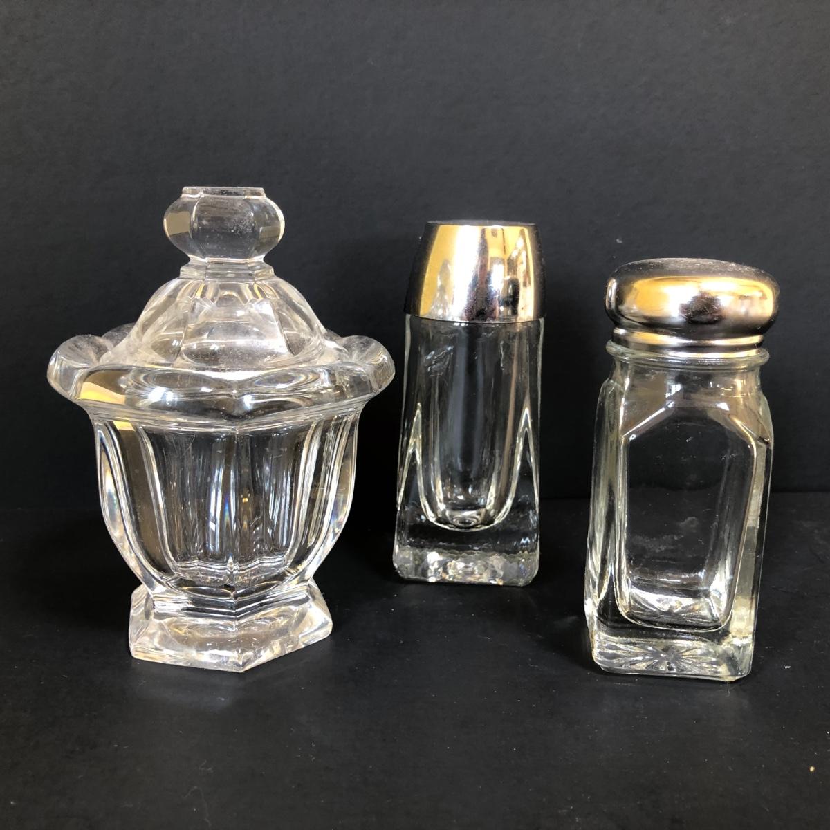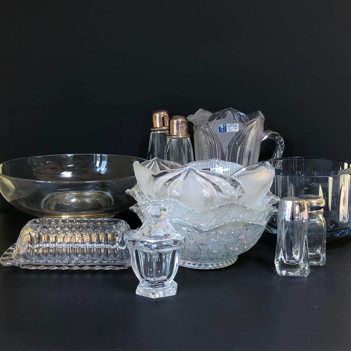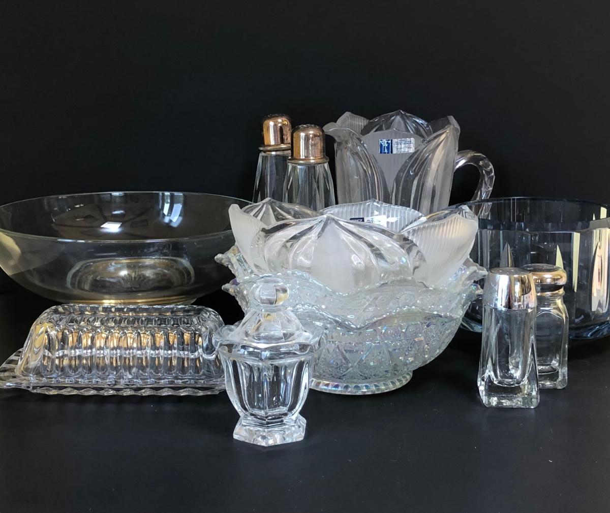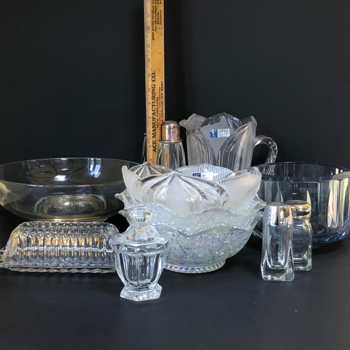 Also includes a glass bowl with gold tone accents, crystal salt and pepper shakers, a blue tone crystal bowl, a small candy dish with a lid, a butter dish.