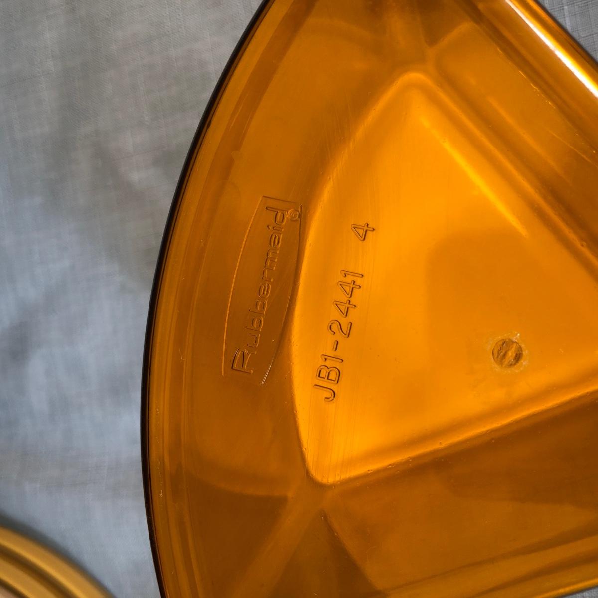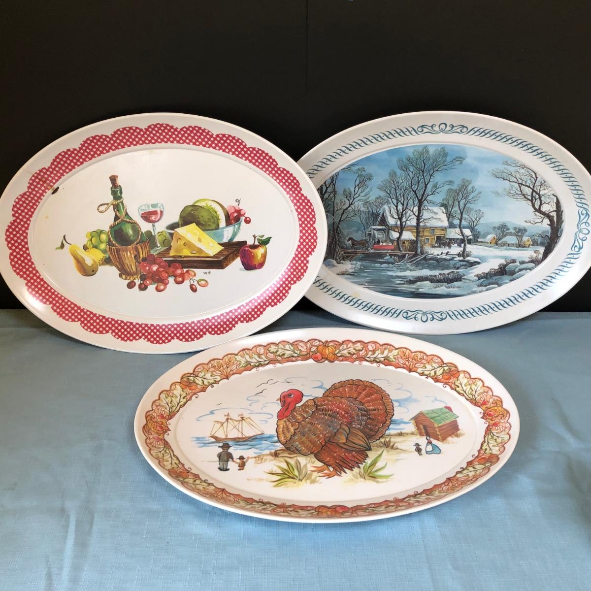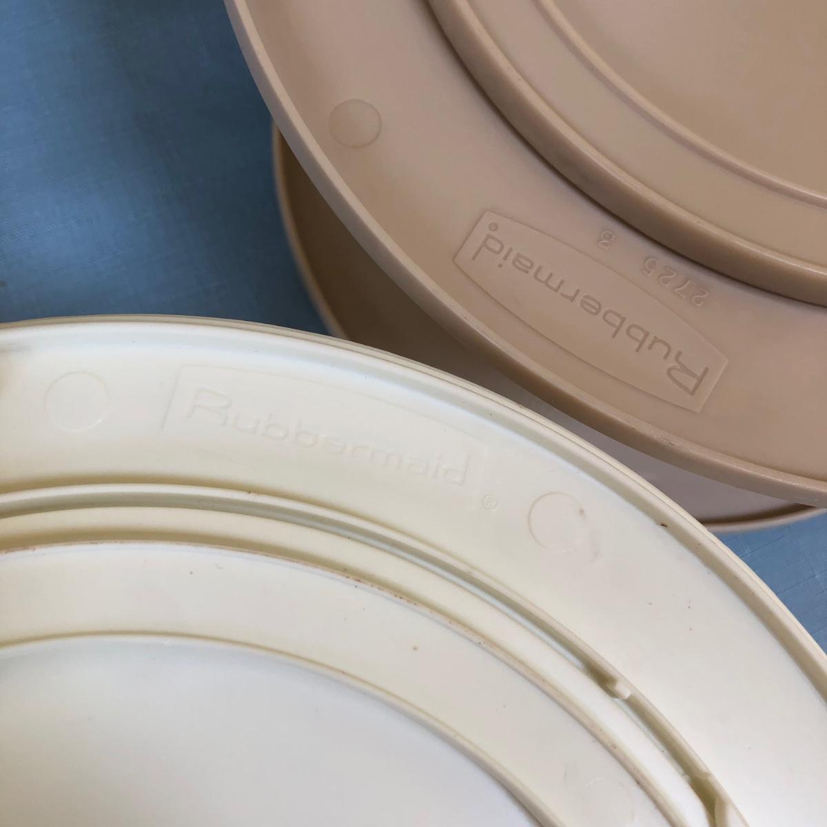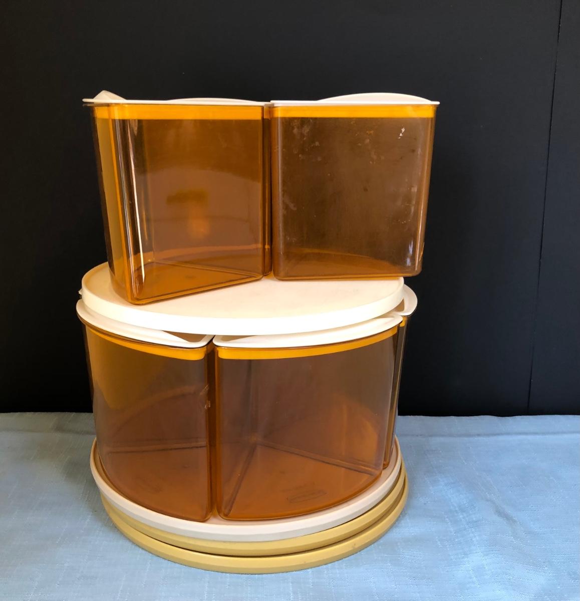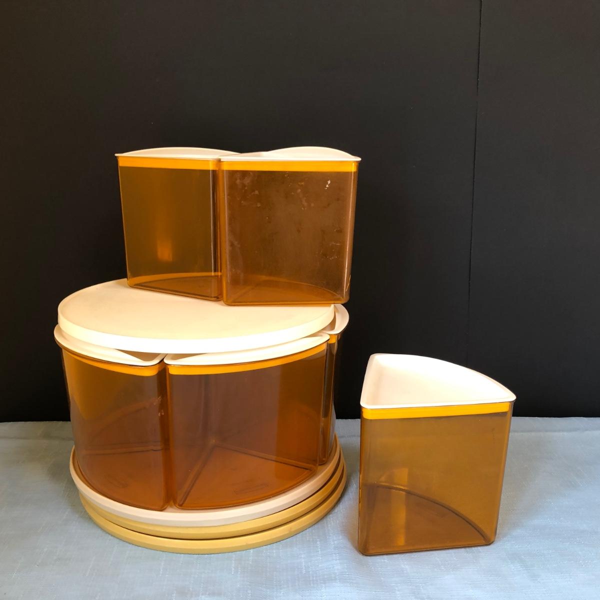 Includes three large plastic platters, two lazy suzans, 8 triangular Rubbermaid containers that fit on a rotating disk and stack, a green Thermos with insulation, two small yellow thermoses, a Poly Hot-Pot with its cord (untested), and two small lidded crocks.