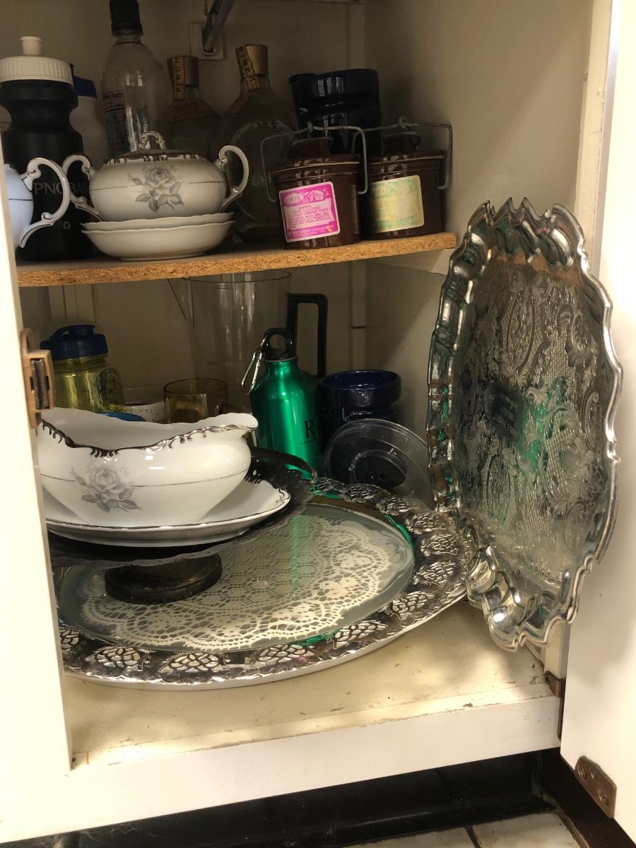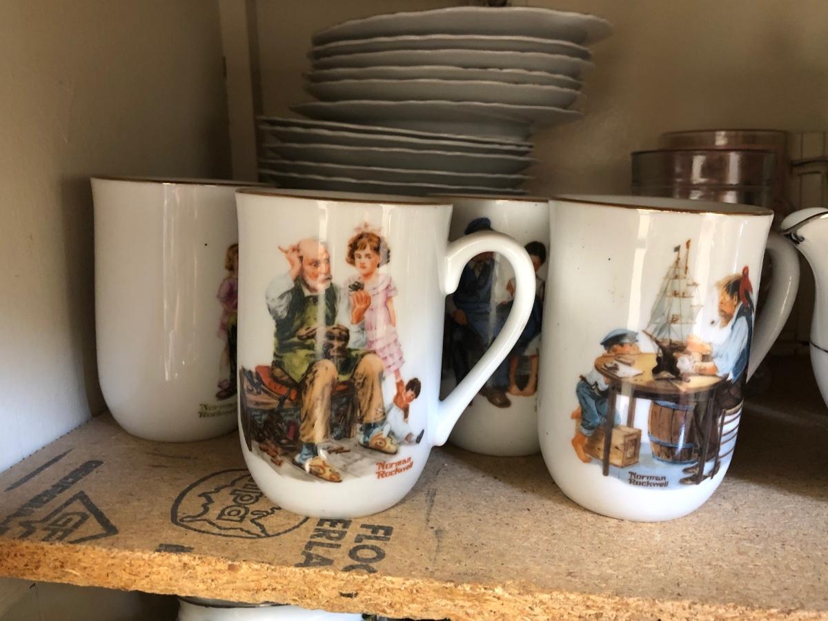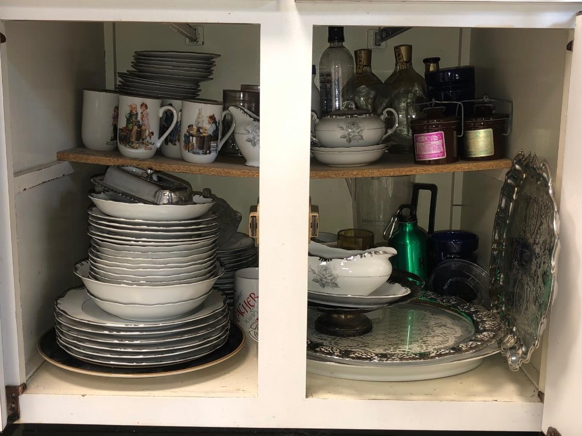 LOT 278M: Entire Kitchen Cabinet of China, Norman Rockwell Mugs, Decanters, Silver Plate & More