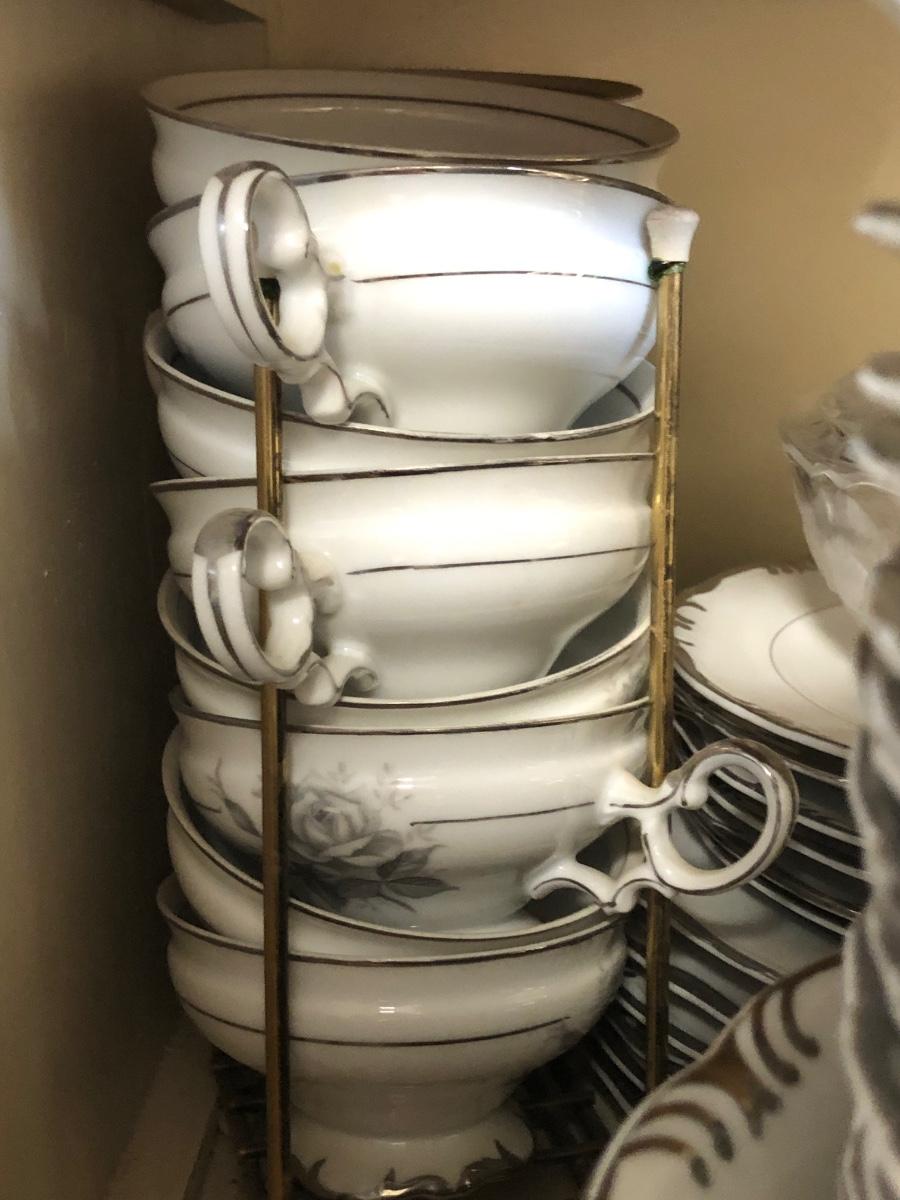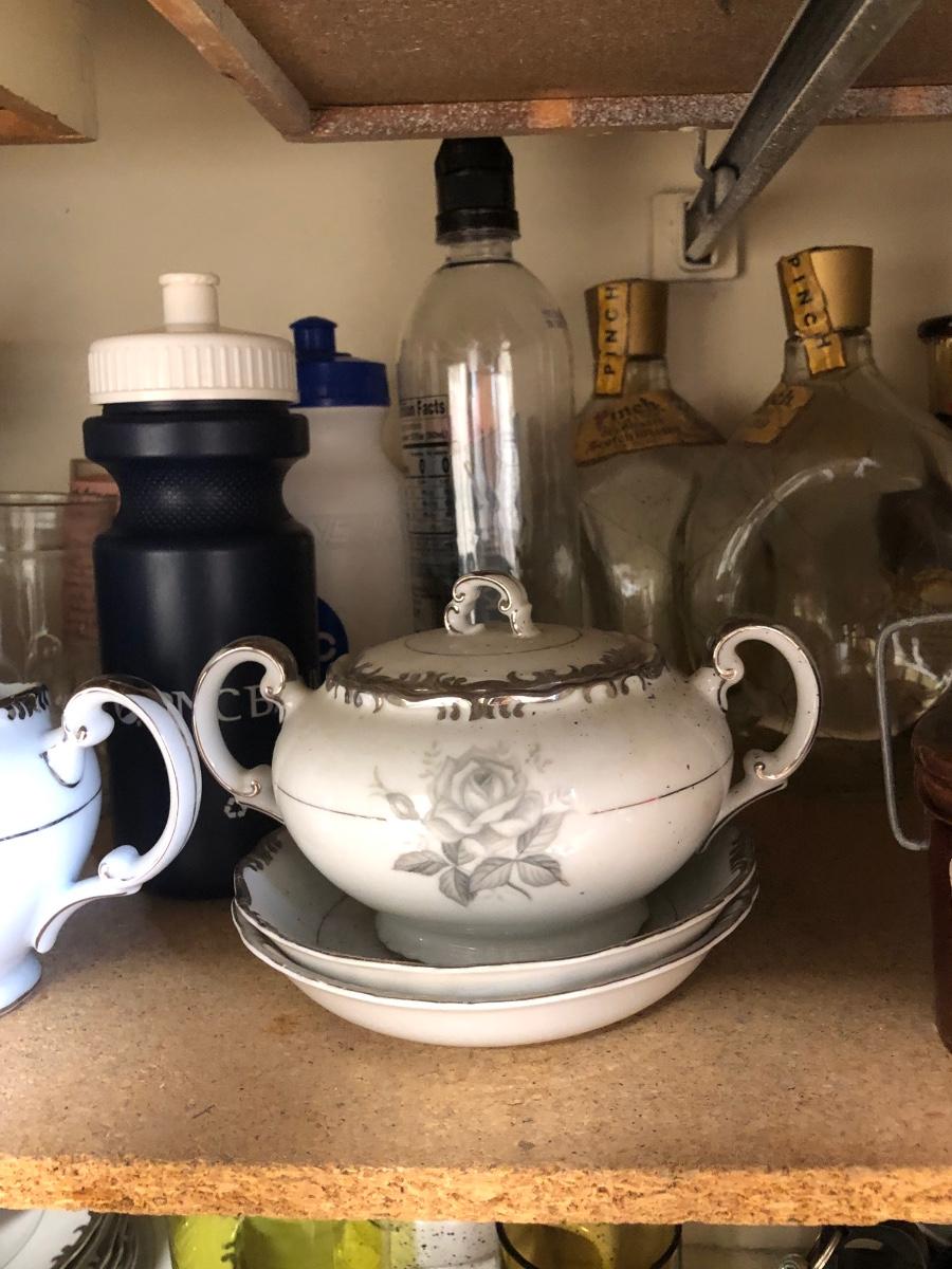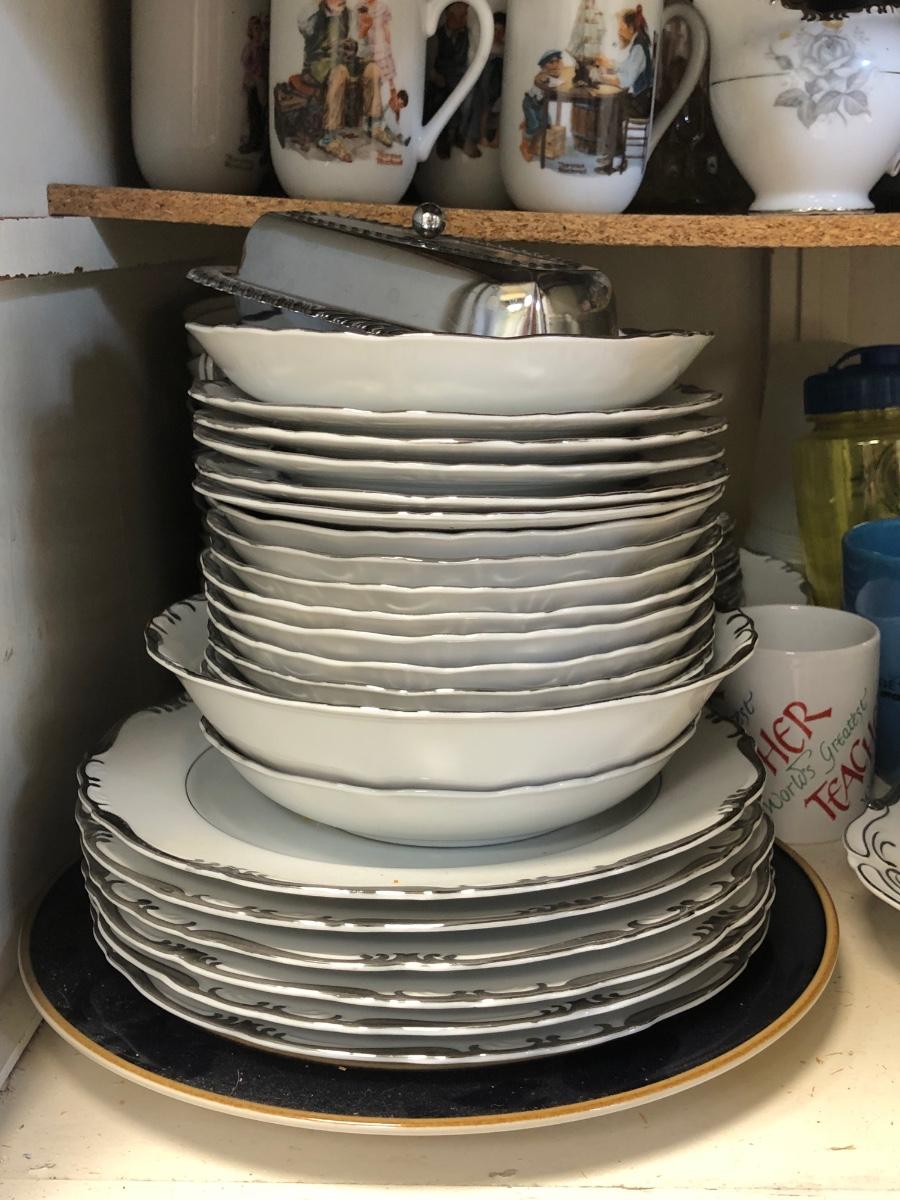 LOT 278M: Entire Kitchen Cabinet of China, Norman Rockwell Mugs, Decanters, Silver Plate & More