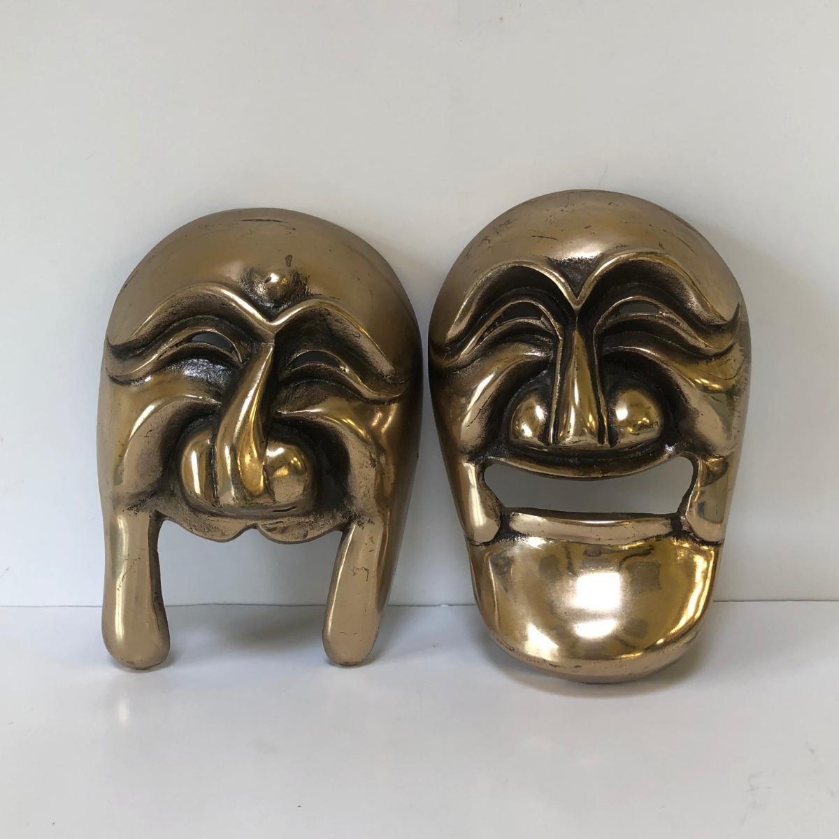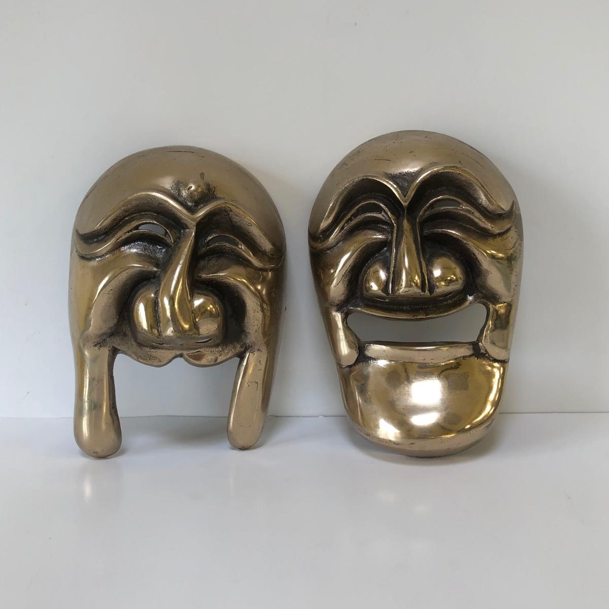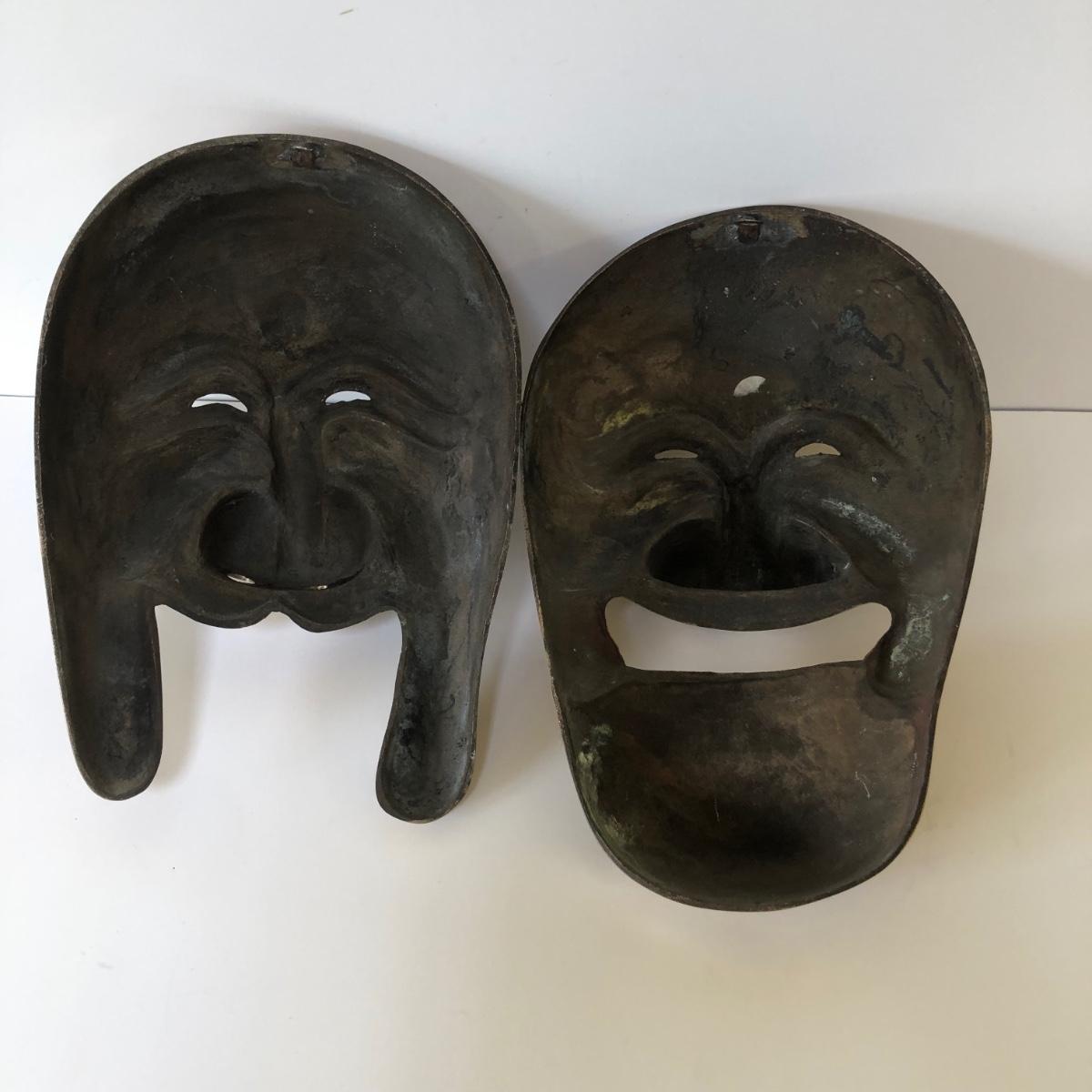 Two masks with stylized faces made in bronze.