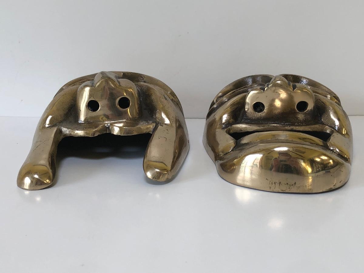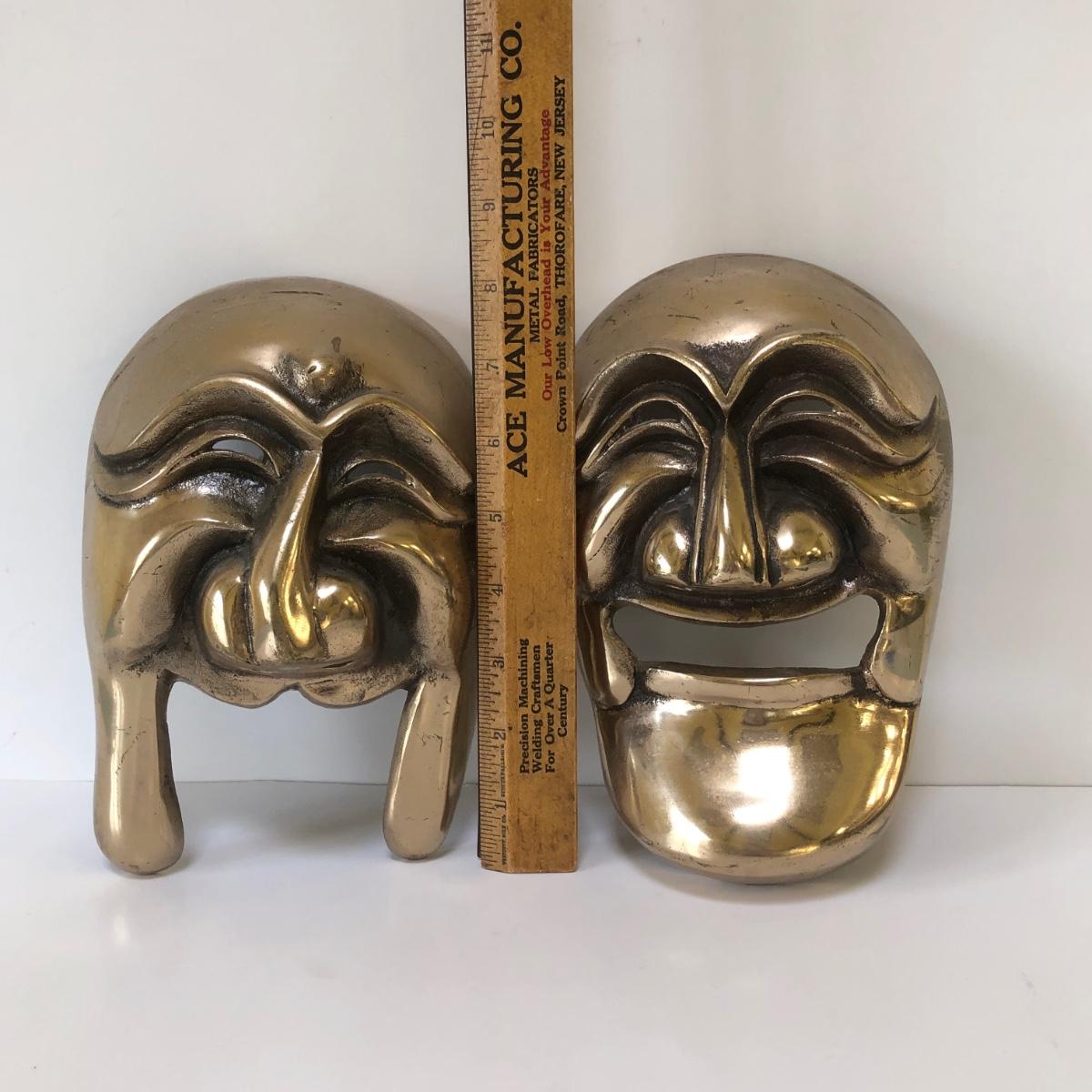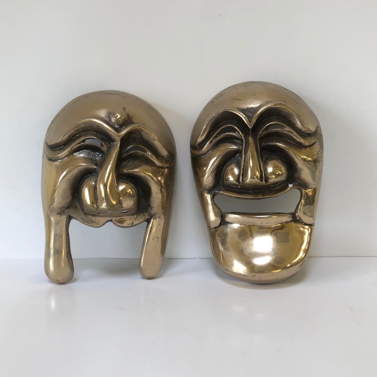 Two masks with stylized faces made in bronze.