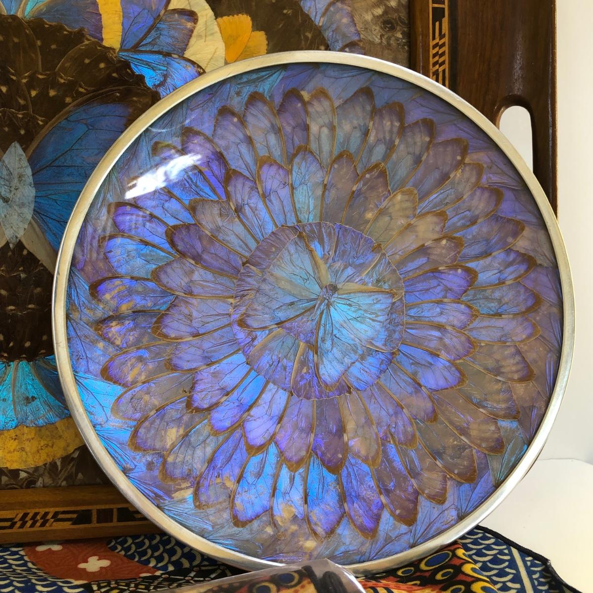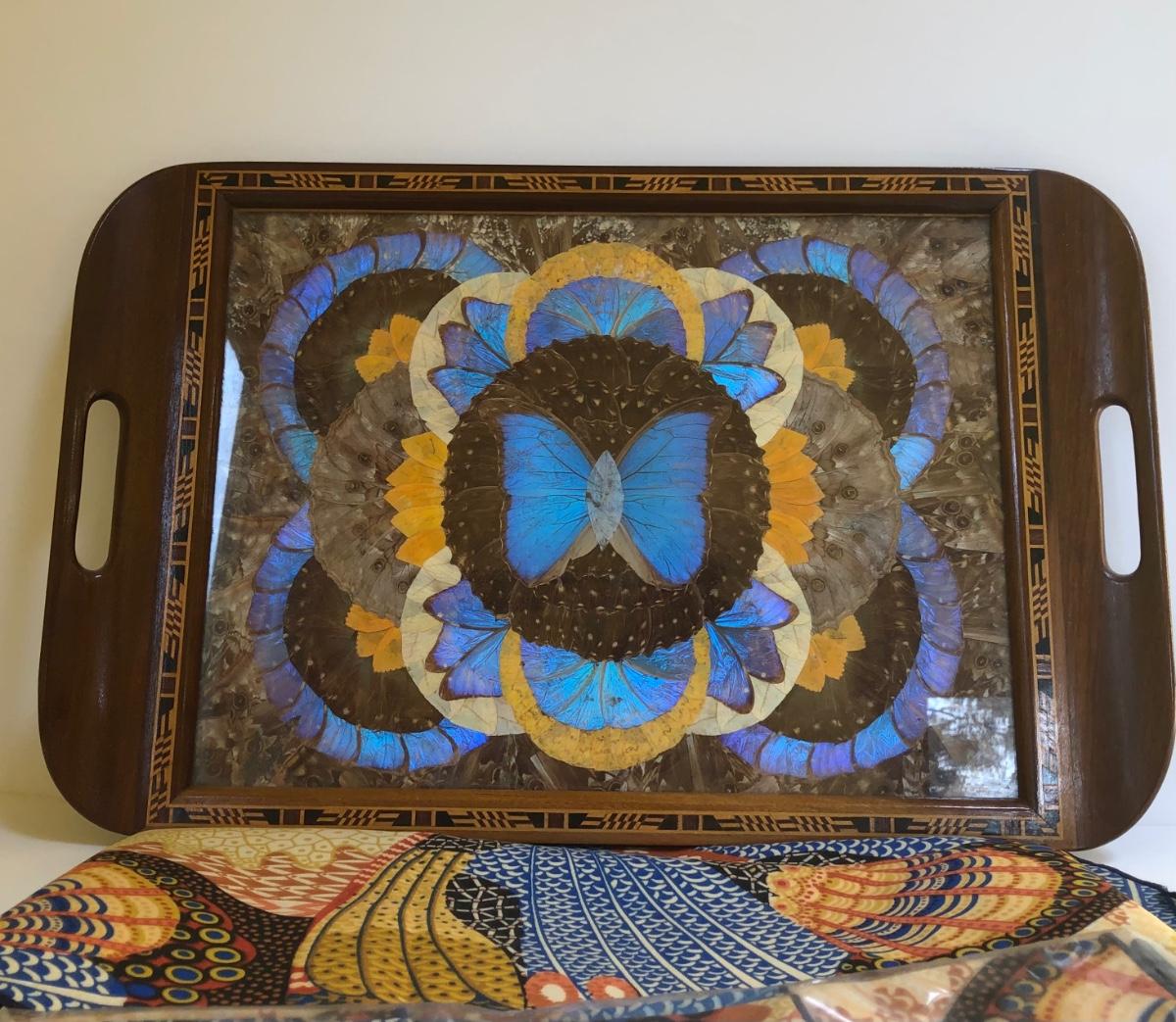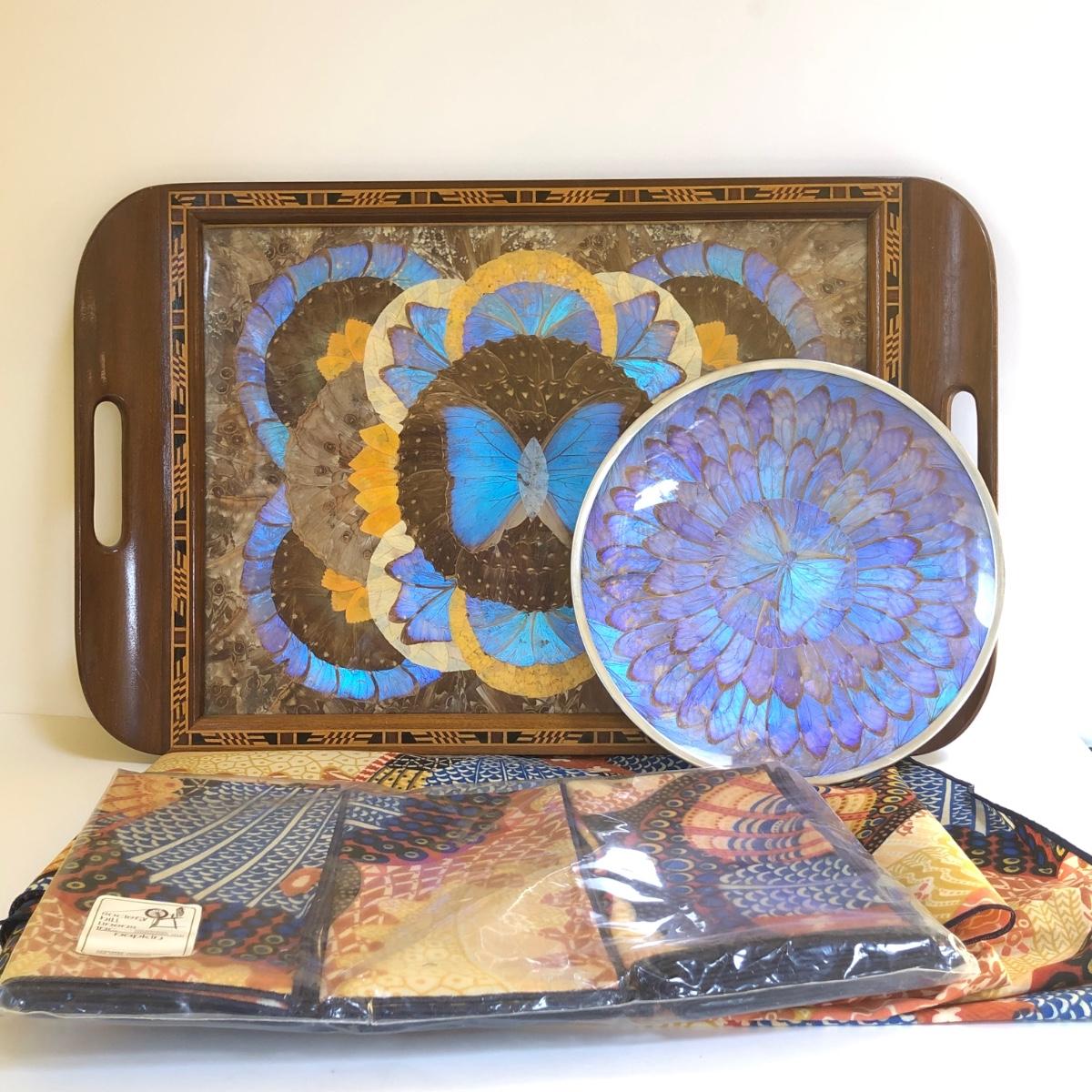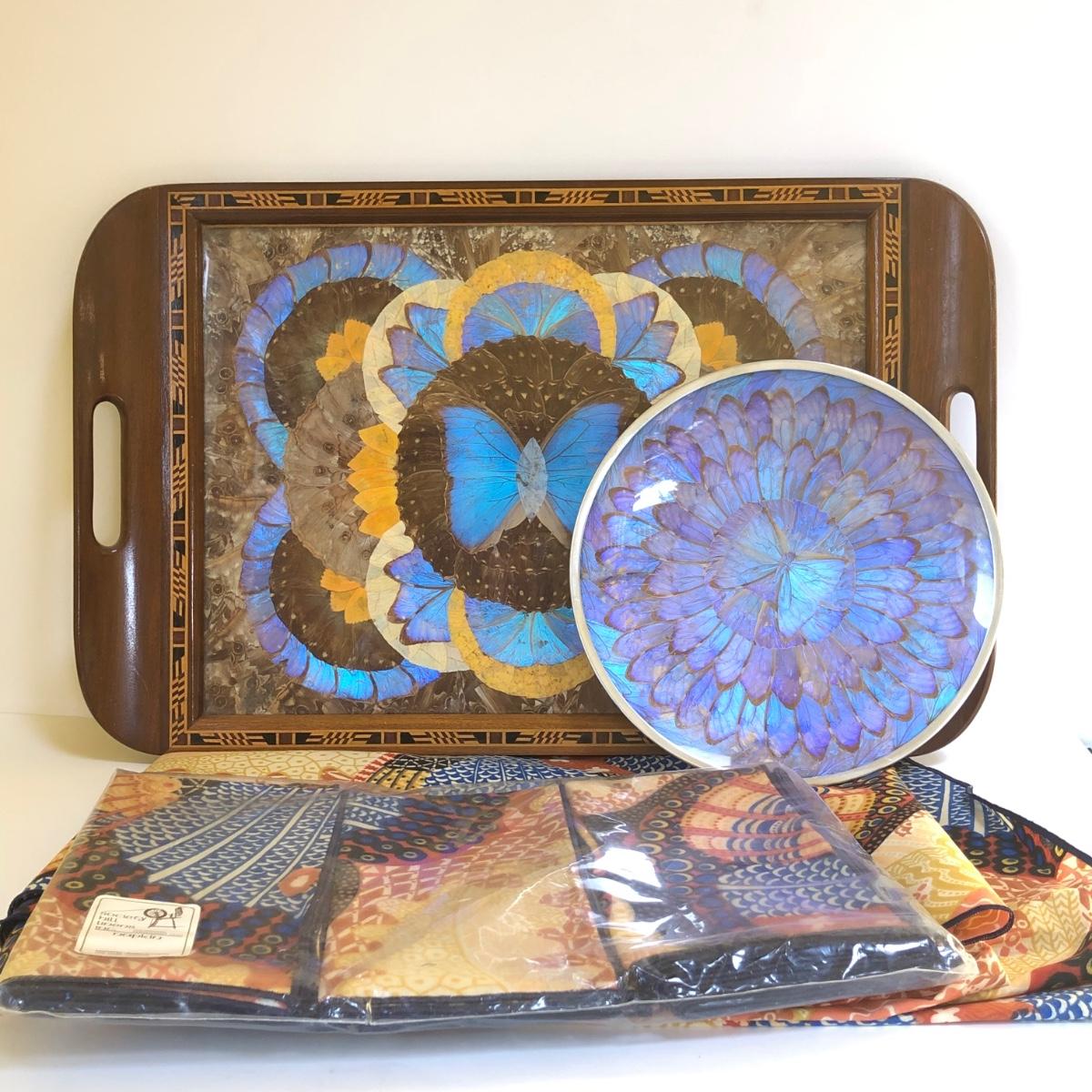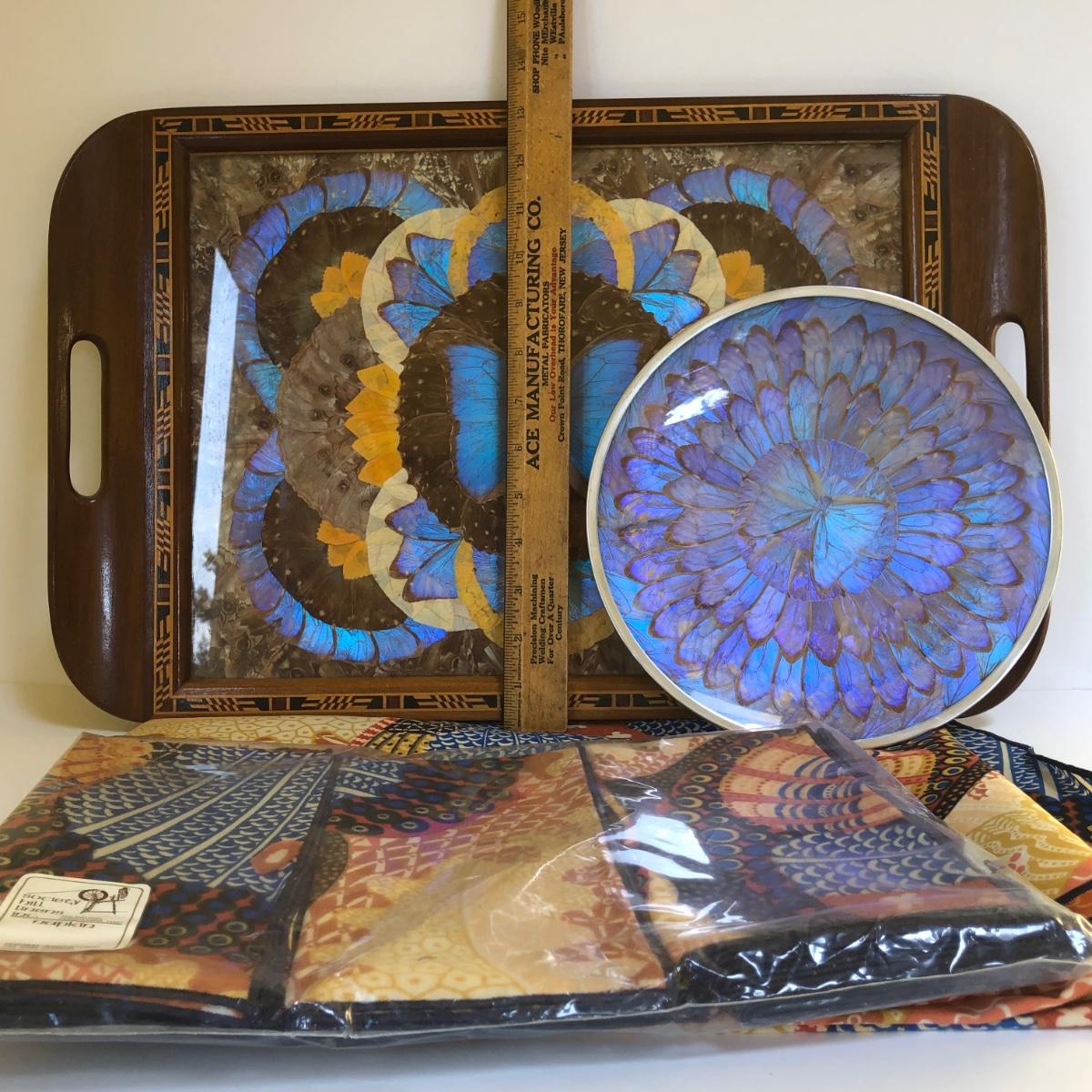 Napkins and table cloth match. Tray is made of wood with butterfly wing design inlaid and covered, measures 21 x 13 inches. Plate is iridescent colored.