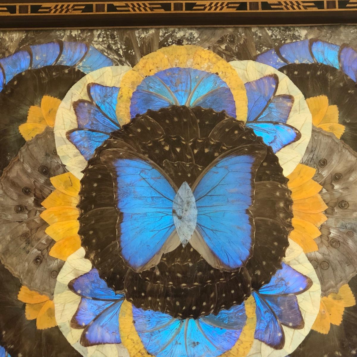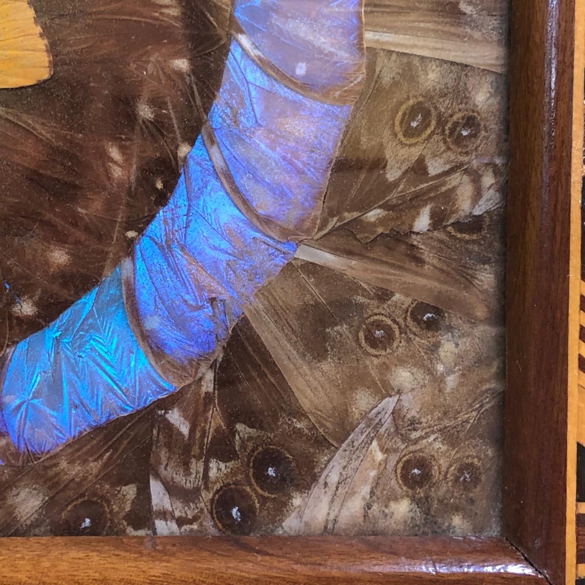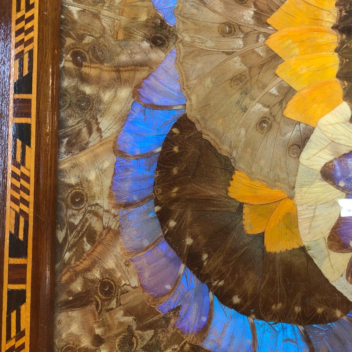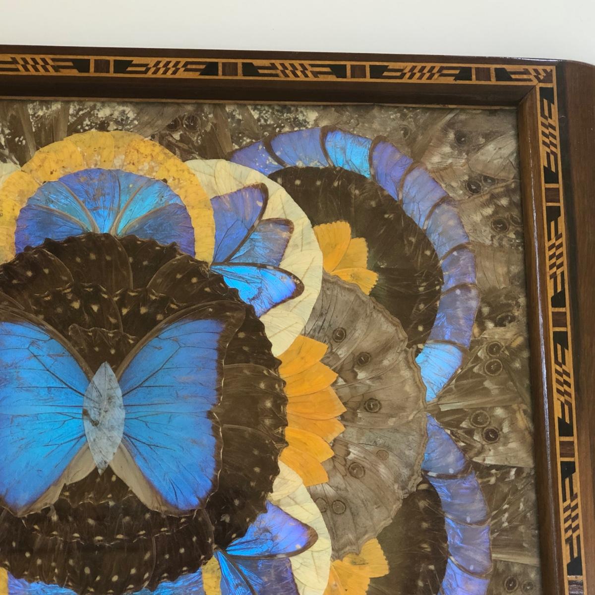 Napkins and table cloth match. Tray is made of wood with butterfly wing design inlaid and covered, measures 21 x 13 inches. Plate is iridescent colored.