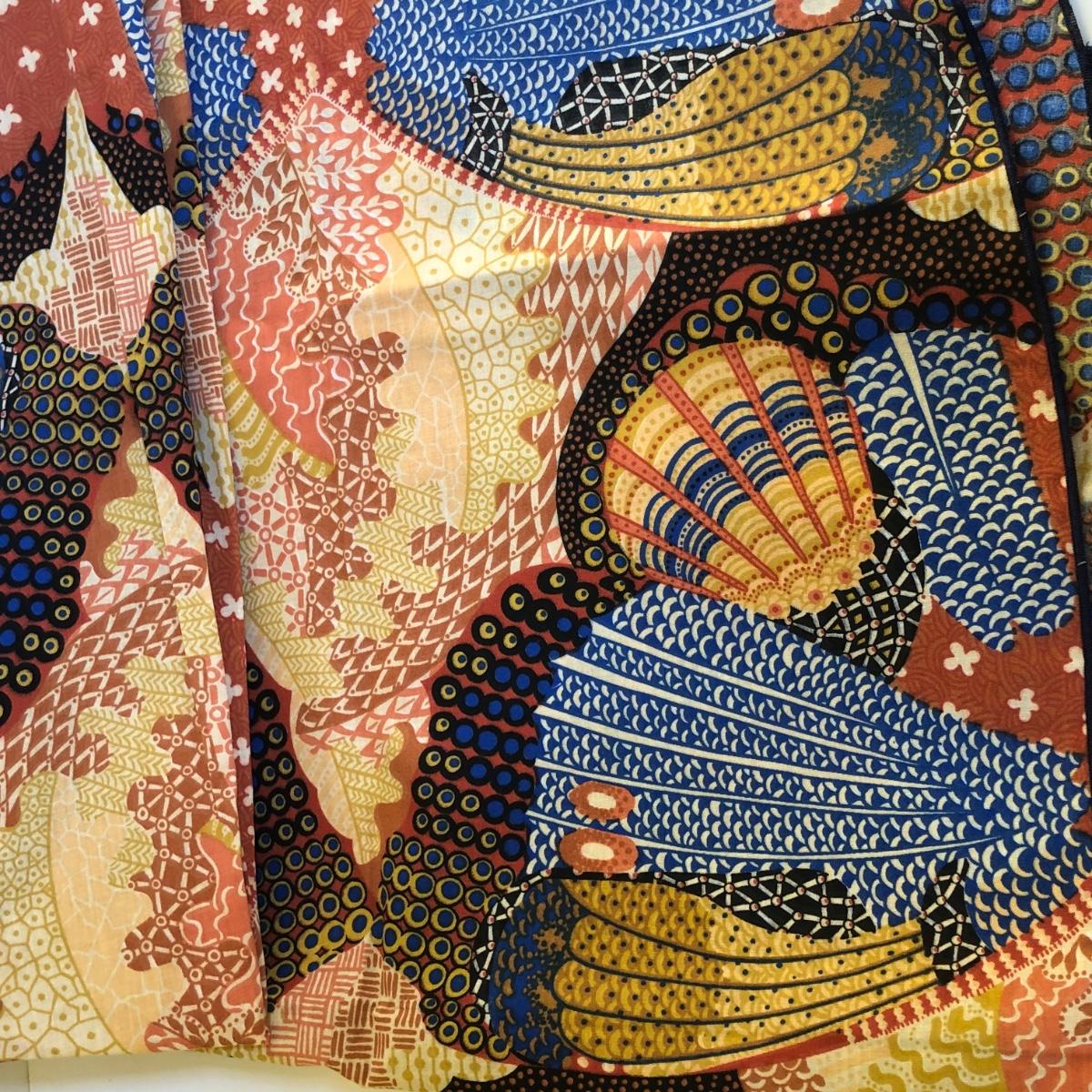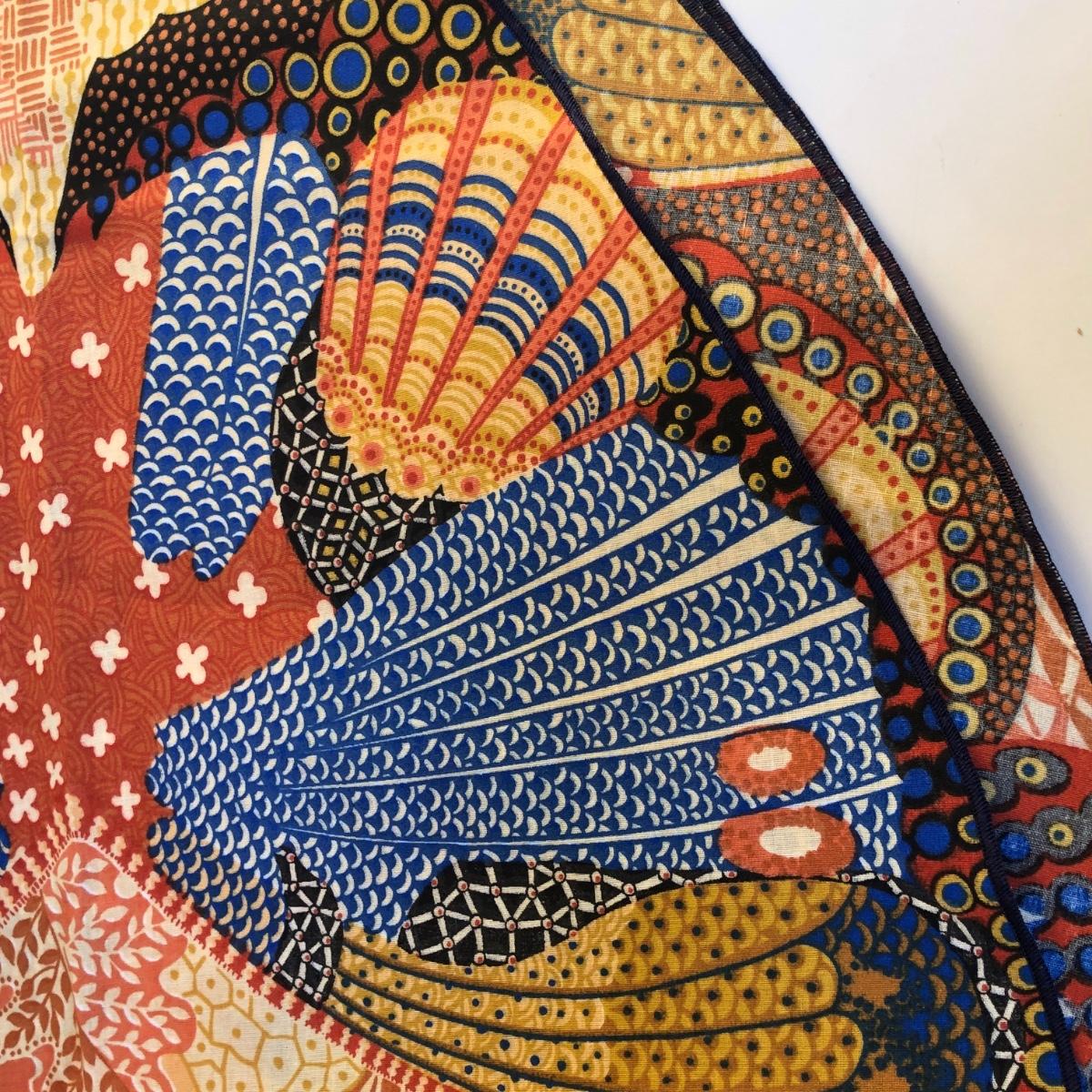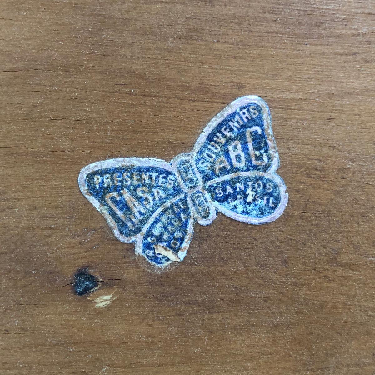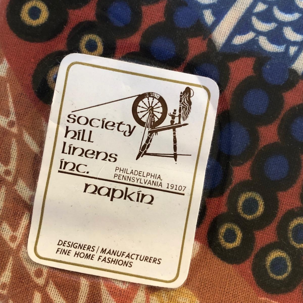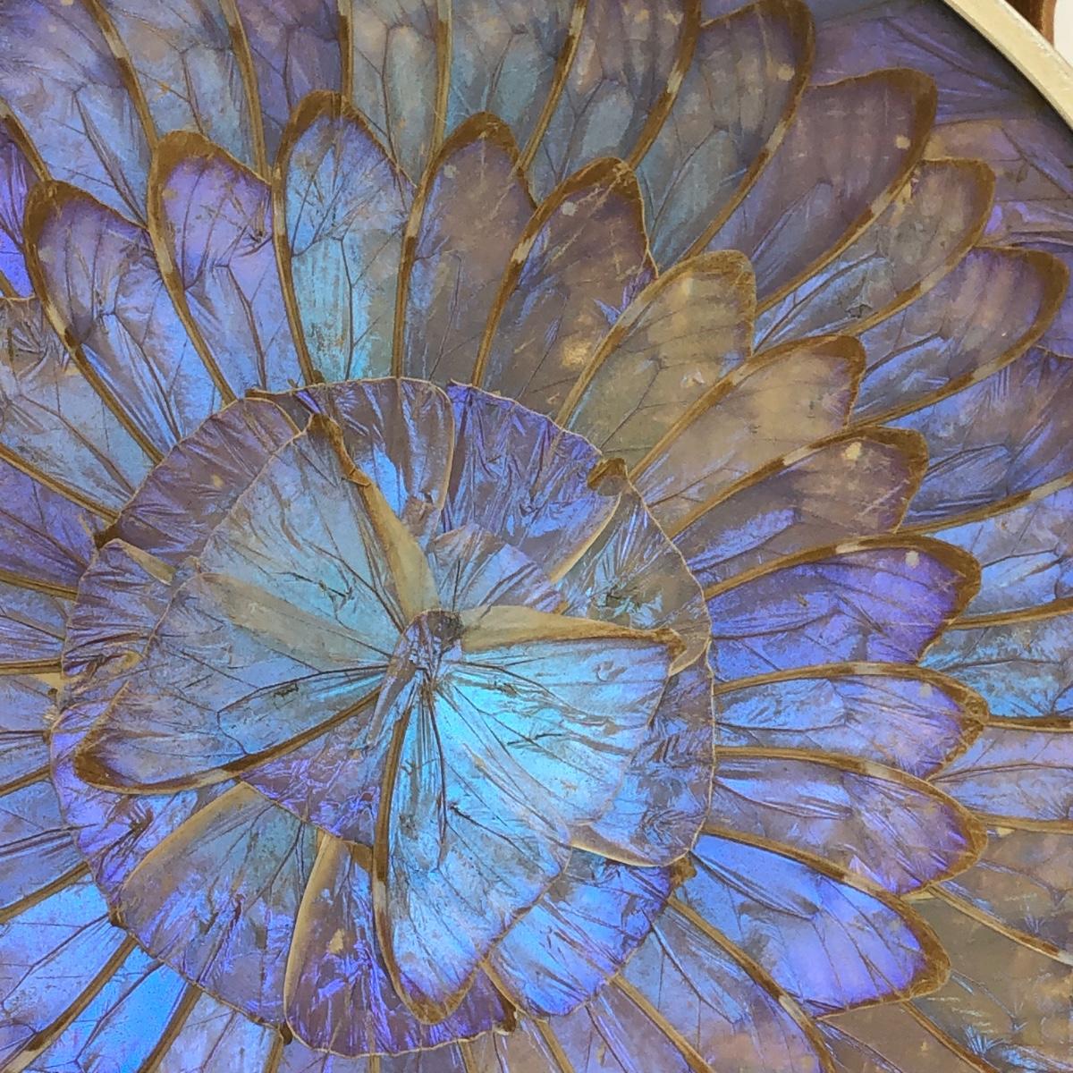 Napkins and table cloth match. Tray is made of wood with butterfly wing design inlaid and covered, measures 21 x 13 inches. Plate is iridescent colored.